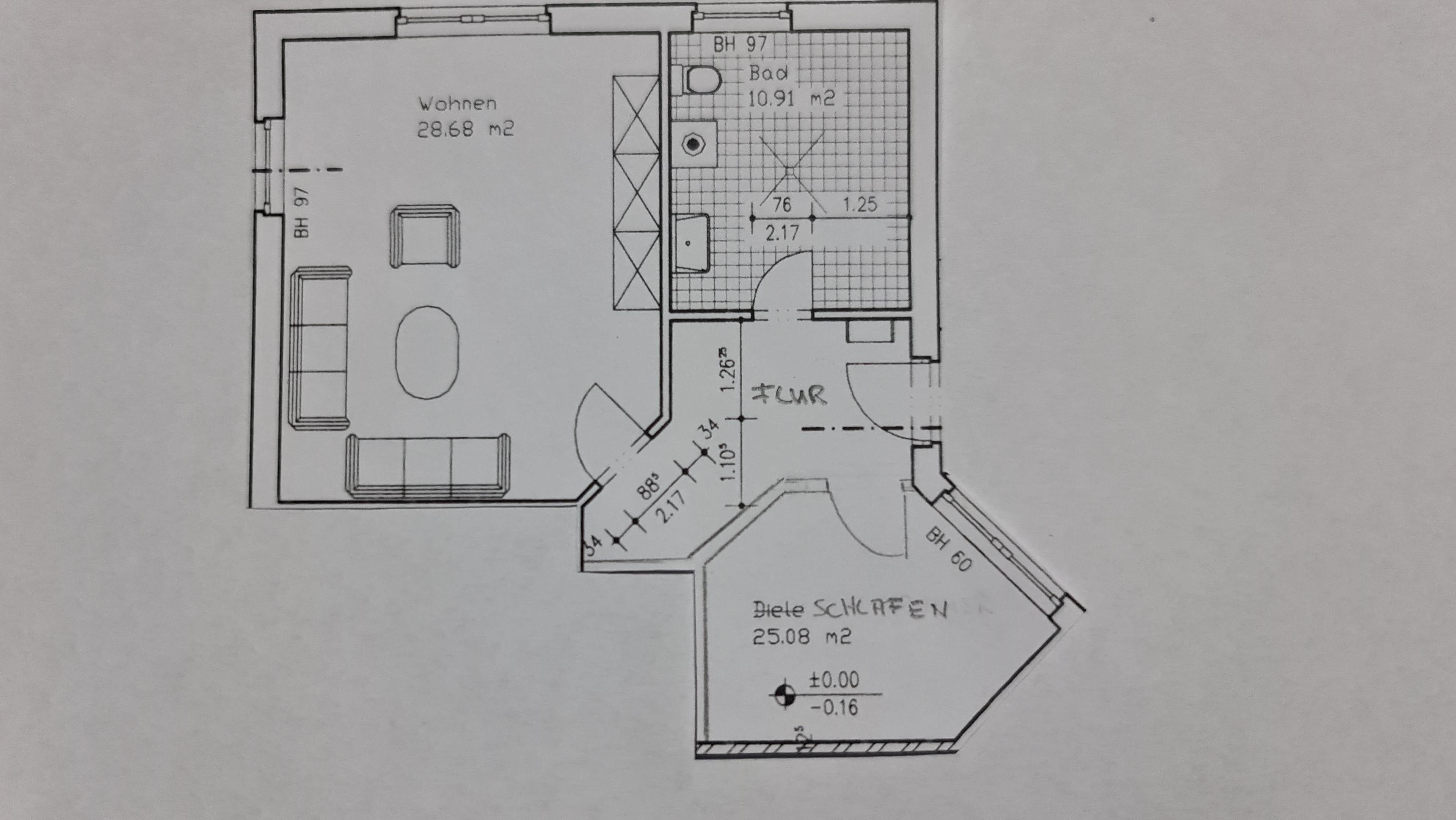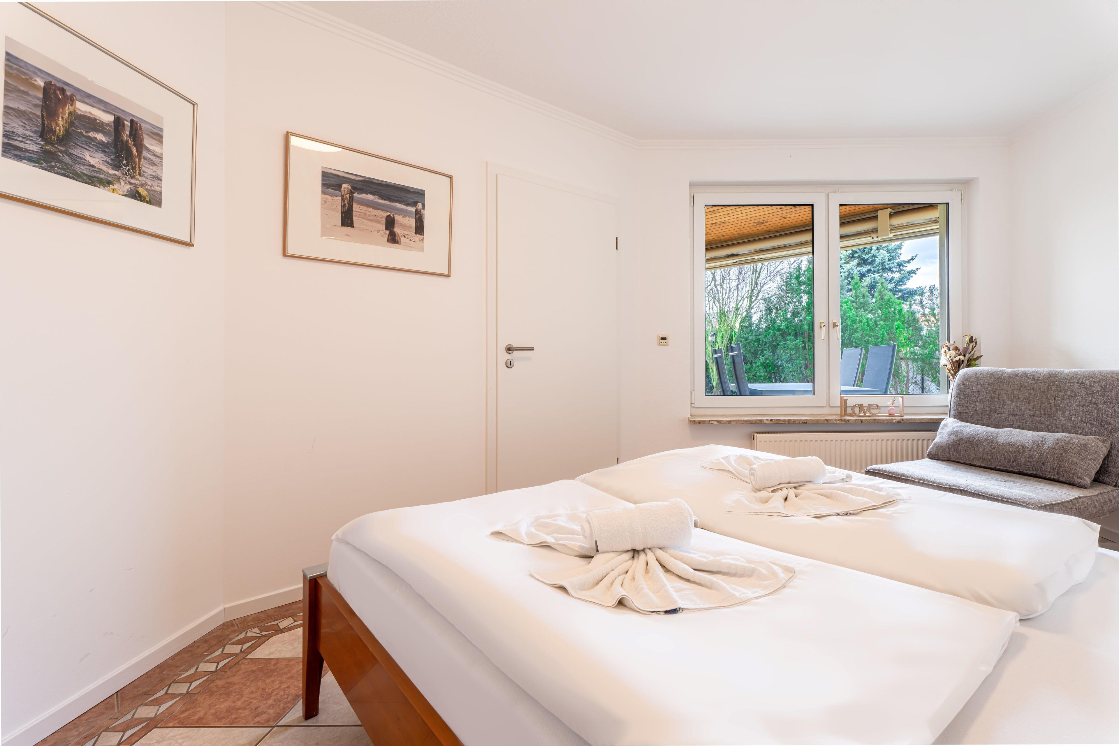 Die Ferienwohnung Luft im Haus Fünf Elemente bietet auf 62 qm Platz für 4 Personen. Drei der Schlafplätze befinden sich im Schlafzimmer der Wohnung. Dort befindet sich neben dem 160x200 cm großen Doppelbett, einen Schlafsessel, der mit einer Fläche von 90x200 cm, Platz für eine weitere Person bietet. Insgesamt können dadurch drei Personen in diesem Raum schlafen. Der vierte Schlafplatz befindet sich im Wohn/Schlafzimmer. Hier befindet sich ein elektronisch ausfahrbares Schlafsofa mit einer Fläche von 110x200cm.