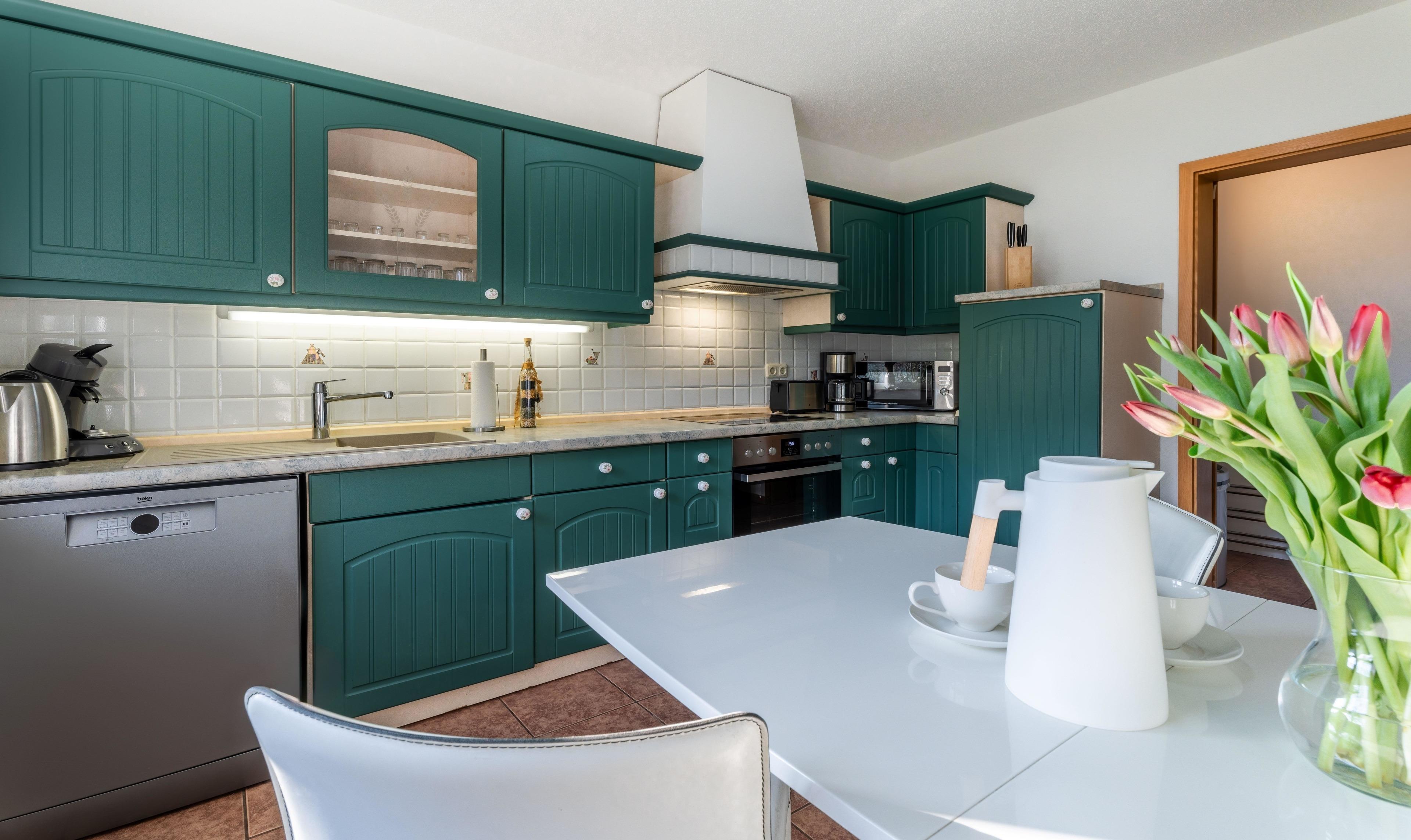 Die Ferienwohnung Feuer im Haus Fünf Elemente bietet auf 58qm Platz für 4 Personen. Die Wohnung hat zwei Schlafzimmer die jeweils mit einem Doppelbett ausgestattet sind. Eines der beiden bietet auf einer Fläche von 2x90x200cm Platz für zwei Personen. Das andere auf einer Fläche von 140x200cm ebenso Platz für zwei Personen. Im Wohnzimmer befindet sich neben einem Sofa ein Smart-TV mit Streaming-Funktion. Außerdem hat die Wohnung eine separate Küche die großzügig ausgestattet ist. Hier befinden sich ein Geschirrspüler, ein Kühlschrank mit Gefriermöglichkeit, ein Backofen mit Ceran-Kochfeld, eine Mikrowelle, ein Wasserkocher, eine Kaffeemaschine, ein Toaster und ein Babyhochstuhl. Die Wohnung verfügt außerdem über ein Badezimmer das, neben der Toilette und dem Waschbecken, sowohl eine Dusche, als auch eine Badewanne besitzt.