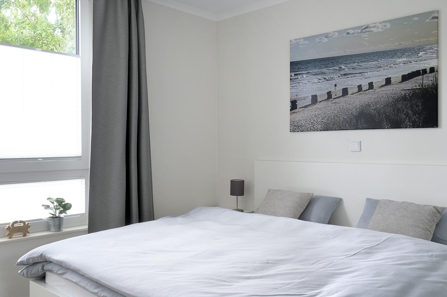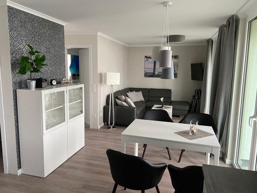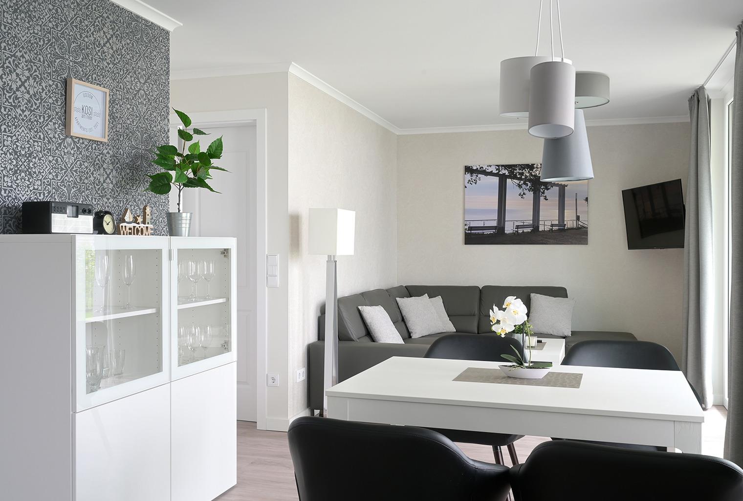 Die 3-Zimmerwohnung des vorderen Apartmenthauses bietet mit einer Fläche von 53 m² Aufenthaltsmöglichkeiten für 2-4 Personen. Eine offene, vollausgestattete Küche schafft hohe Transparenz zum Wohnraum und lädt ein für gemeinsame Zeit. Die Einrichtung der Wohnung fokussiert sich auf ein modernes und gleichzeitig gemütliches Interieur.