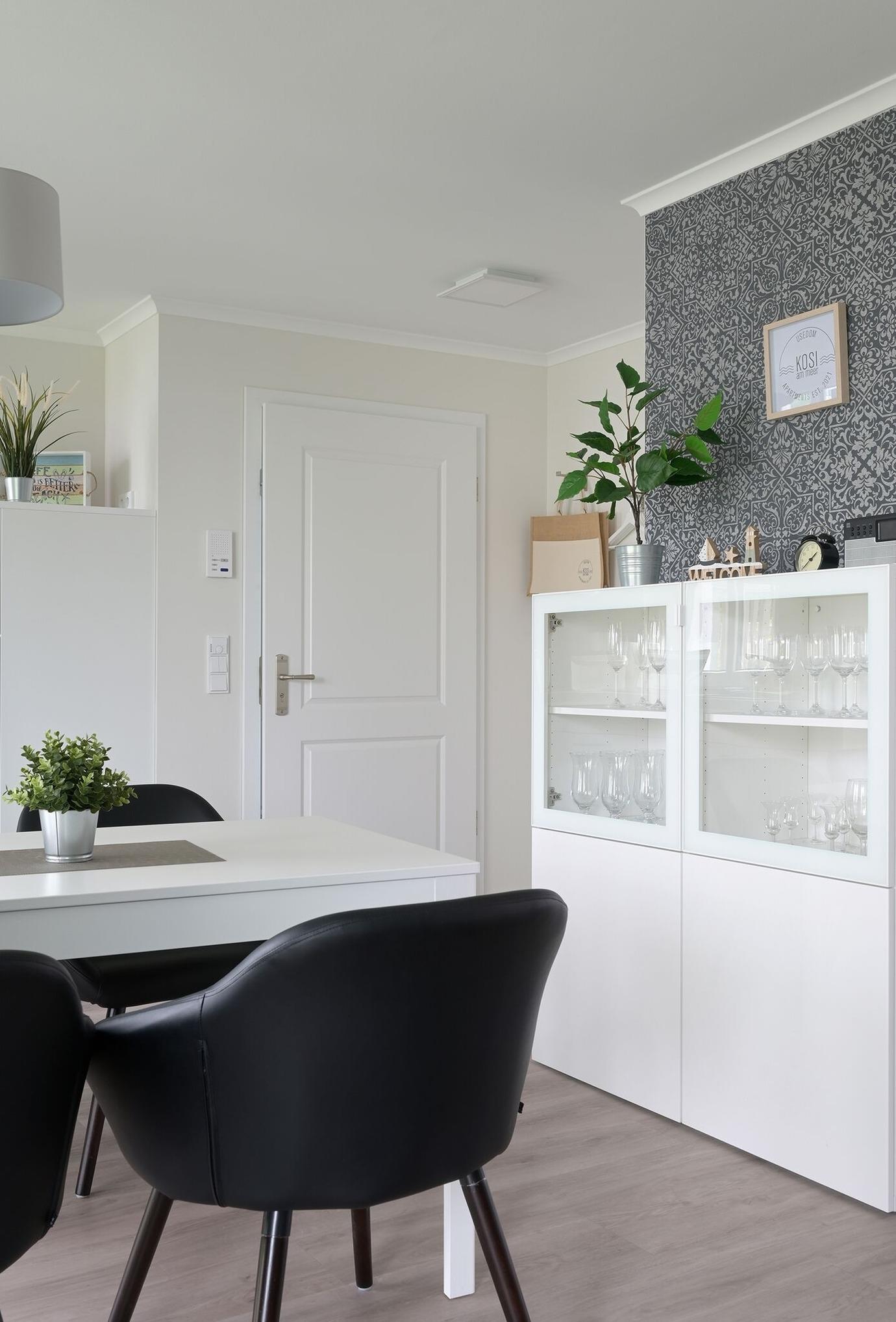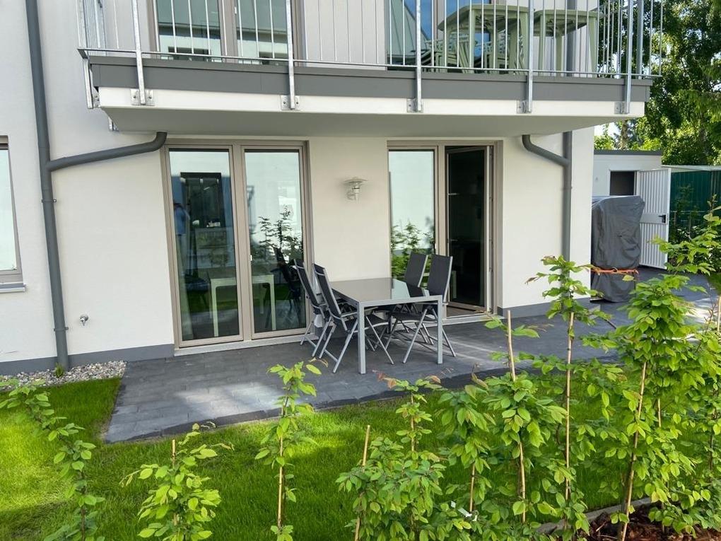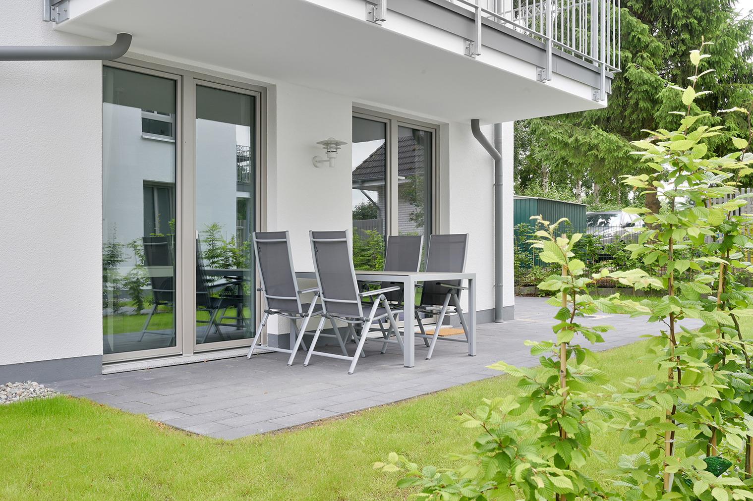 Bodentiefe Fenster ermöglichen einen direkten Zugang zur Terrasse oder zum Balkon, welche mit Gartenmöbeln ausgestattet sind. Ausgewählte Möbel und hochwertige Böden, schaffen Gemütlichkeit und ein ruhiges Raumgefühl.