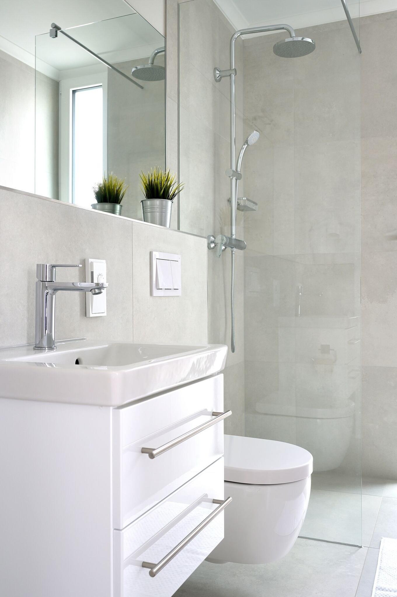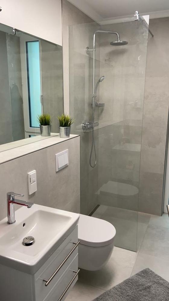 Das Badezimmer ist mit einer bodengleichen Dusche mit Regendusche ausgestattet.