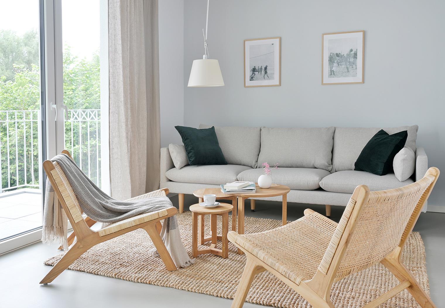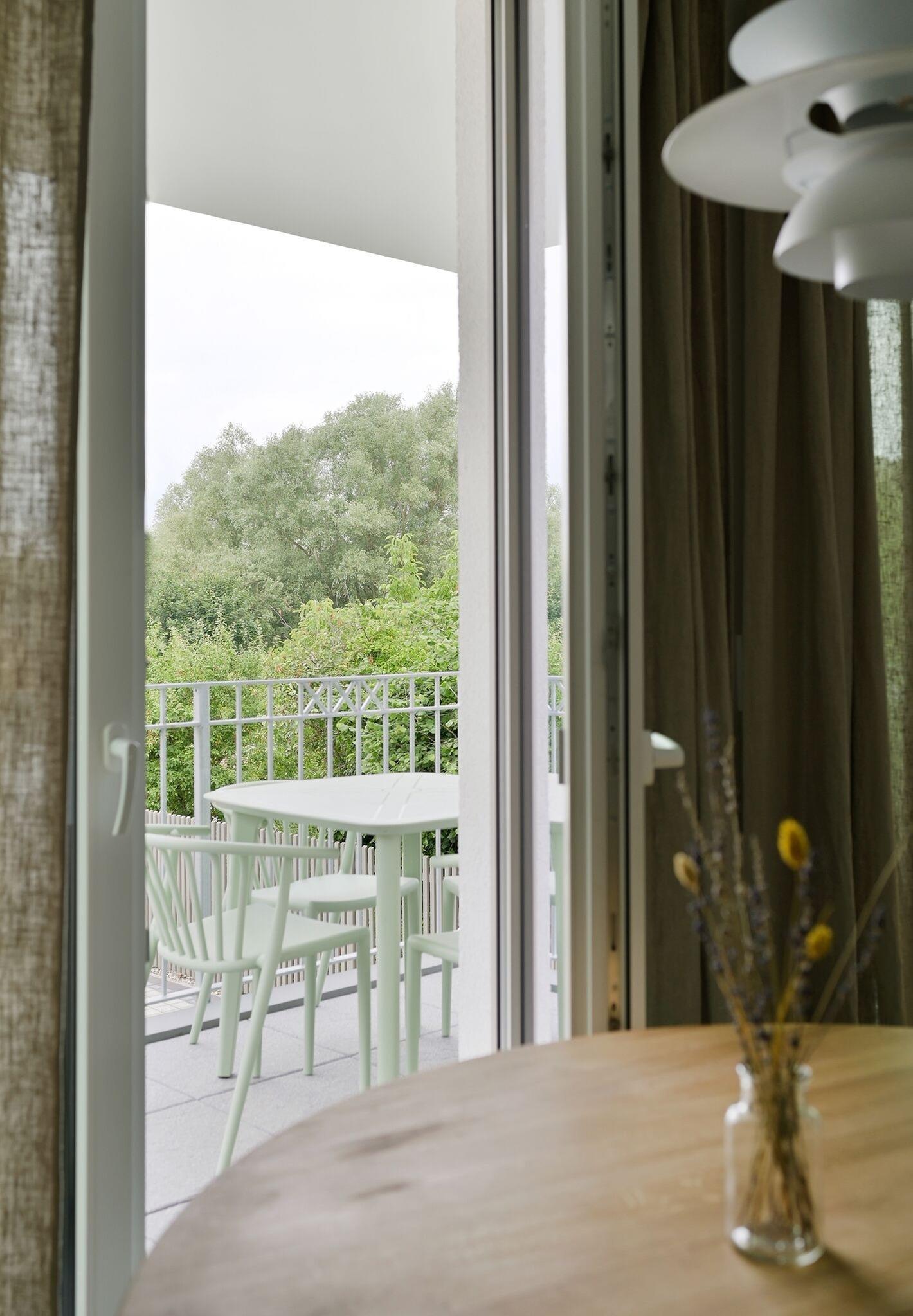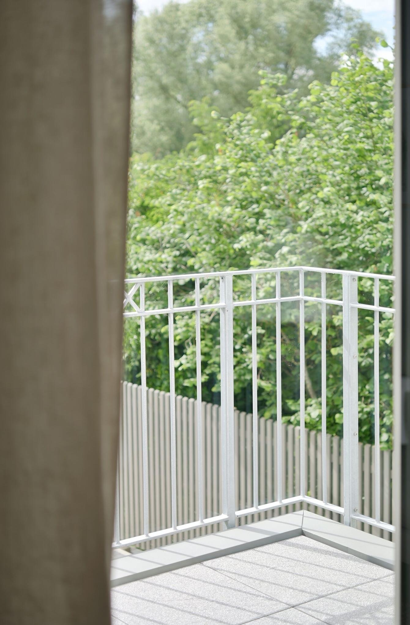 Bodentiefe Fenster ermöglichen einen direkten Zugang zum Balkon, welcher mit Gartenmöbeln ausgestattet ist. Ausgewählte Möbel und hochwertige Böden, schaffen Gemütlichkeit und ein ruhiges Raumgefühl.