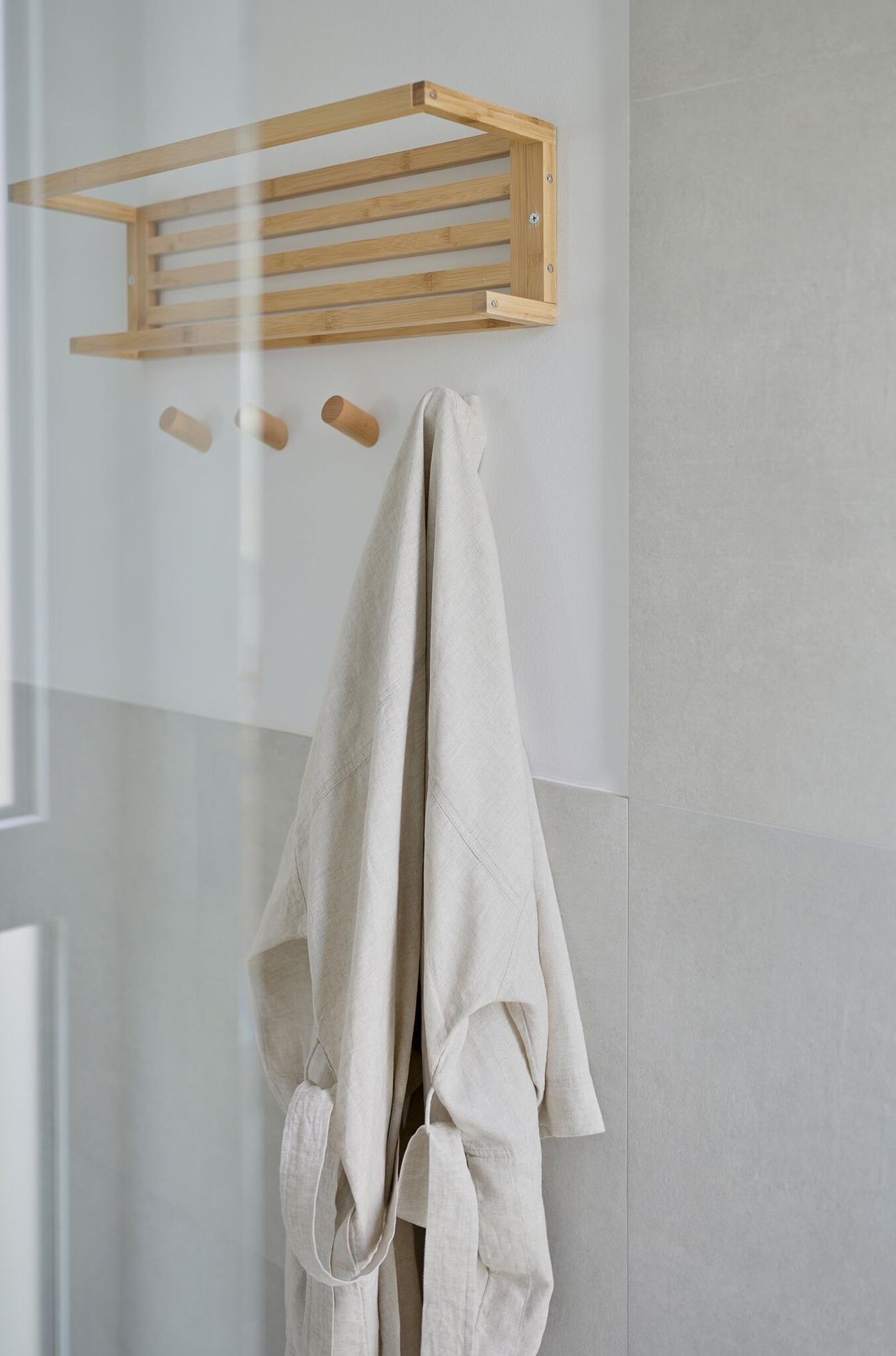 Das Badezimmer ist mit einer bodengleichen Dusche mit Regendusche ausgestattet.