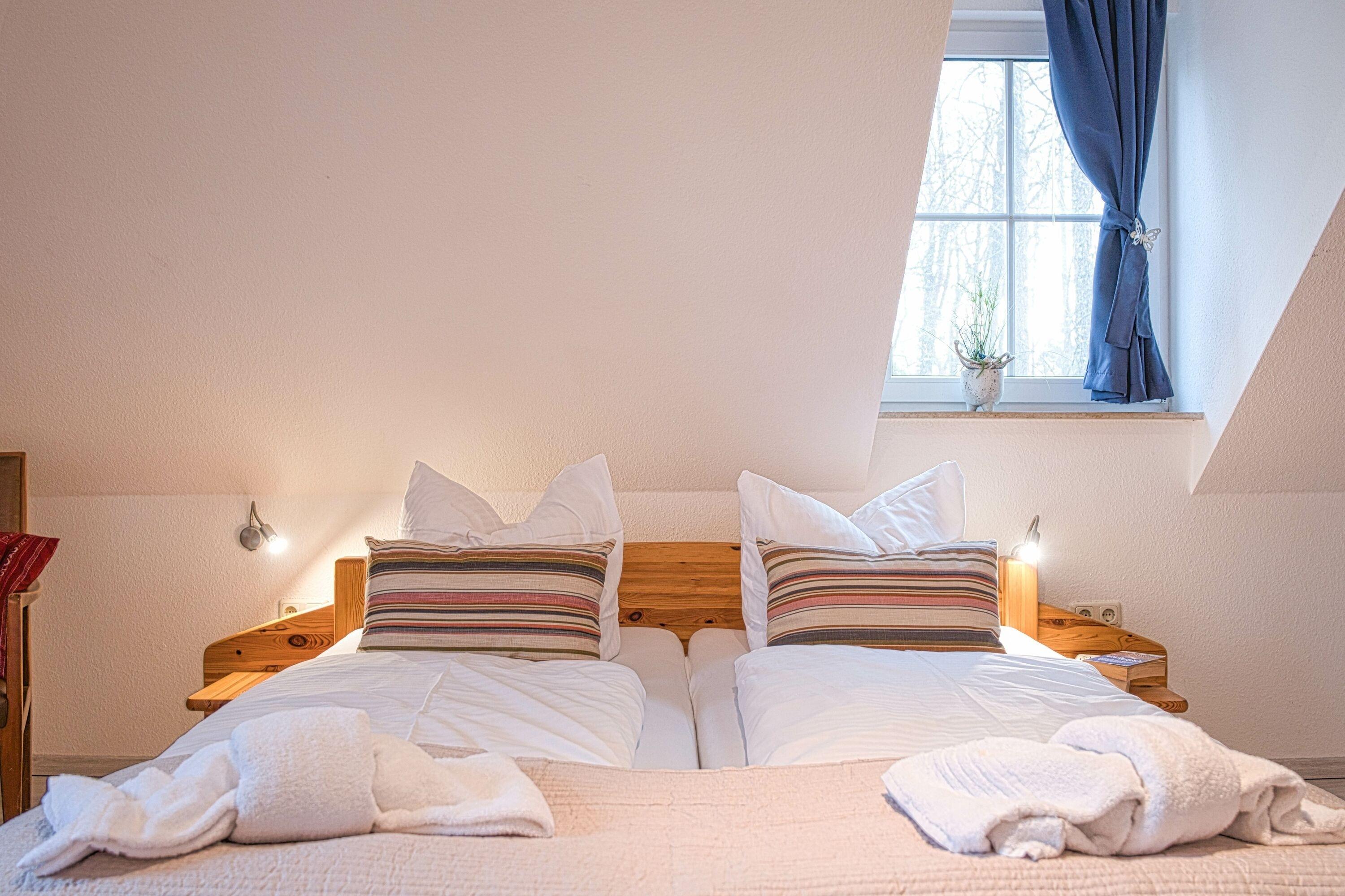Die Fewo Gabriele zeichnet sich durch ihre helle Ausrichtung nach Süden und die vielen Fenster mit Insektenschutz sowie einen Balkon aus. Die Nutzung des W-LAN/Internets ist kostenfrei. In der unteren Ebene befinden sich eine voll ausgestattete Einbauküche, ein gemütlicher Wohn- und Essbereich, ein Schlafzimmer mit Doppelbett und ein Badezimmer mit Fußbodenheizung und Dusche. Über eine Holztreppe gelangt man in die Galerie, wo sich das zweite Schlafzimmer mit Doppelbett befindet. Der Balkon ist mit Gartenmöbeln ausgestattet. Für Autos steht ein kostenloser PKW-Stellplatz zur Verfügung und auch Fahrräder können vor dem Haus abgestellt werden.