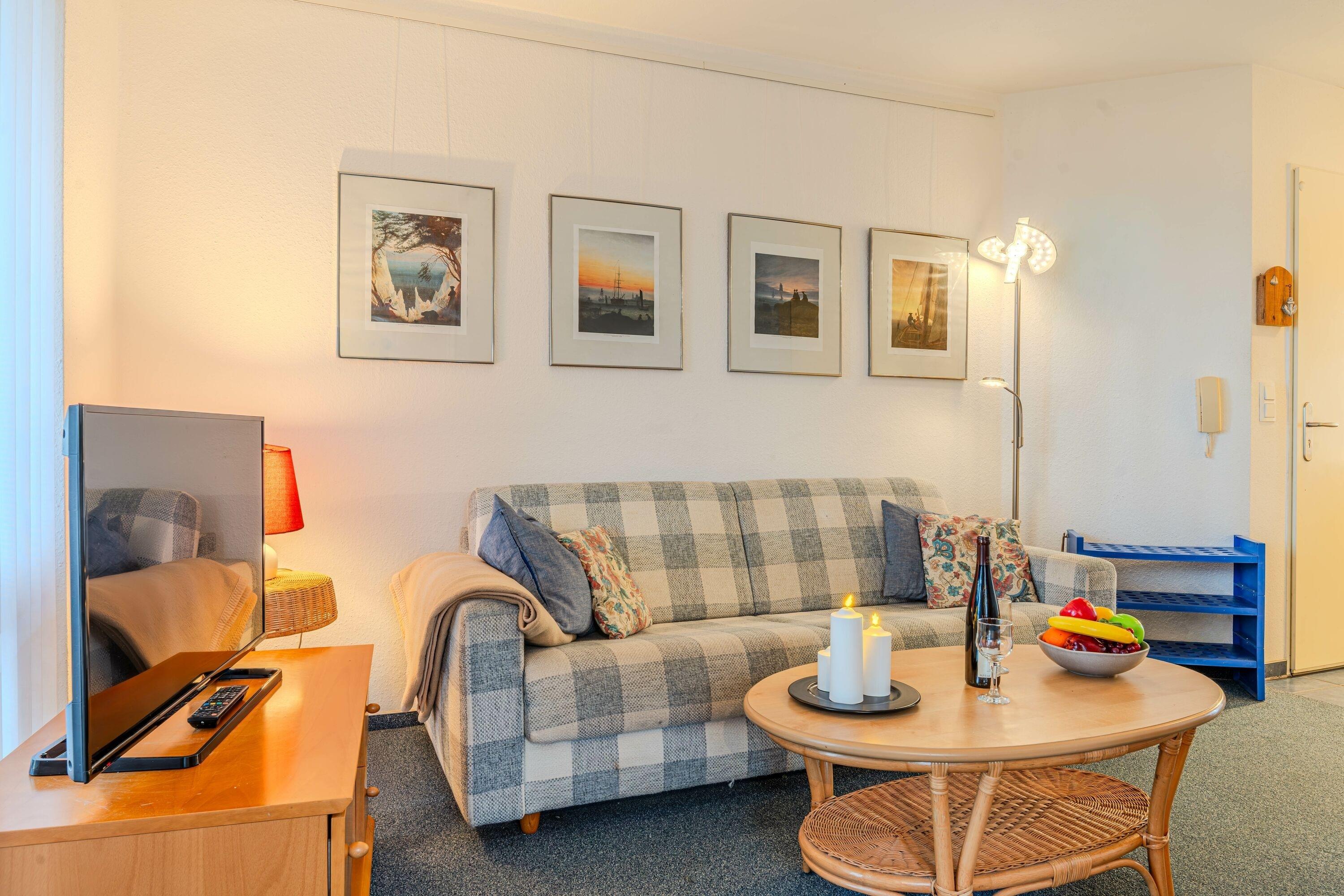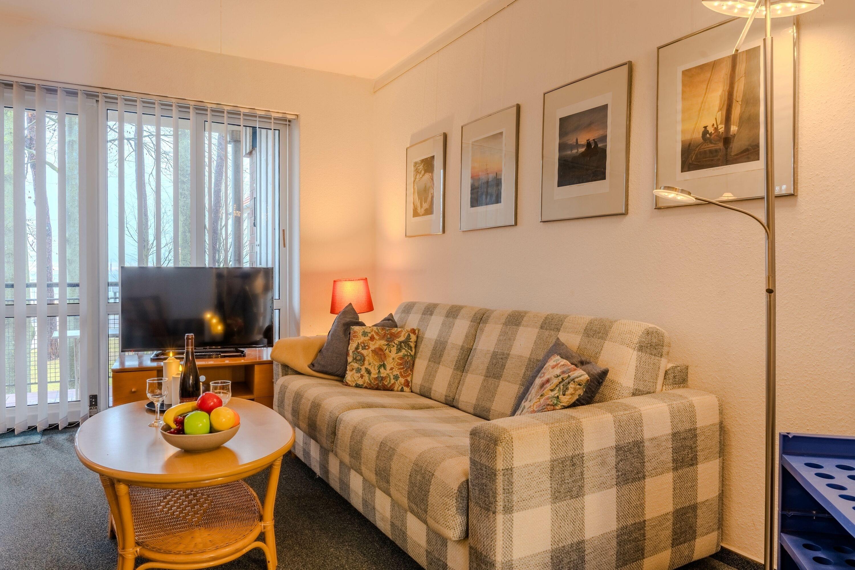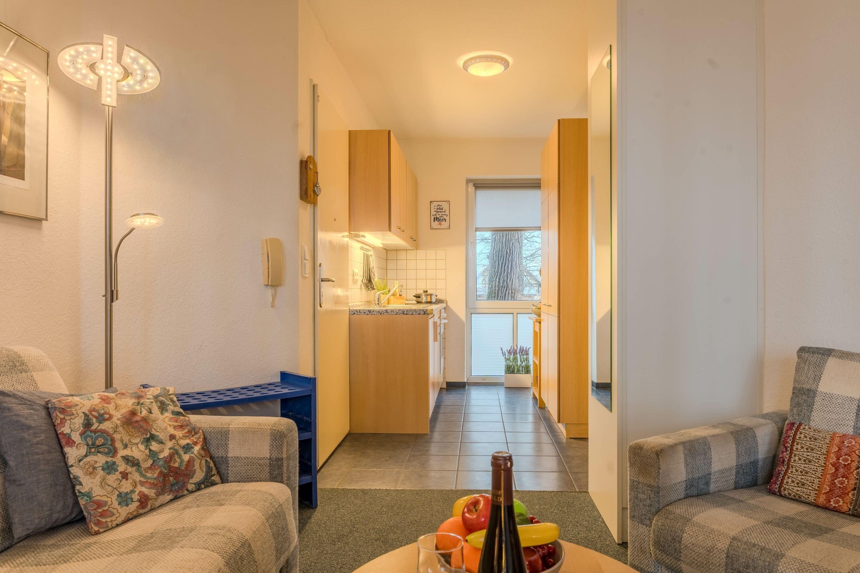 Das Nichtraucherappartement mit Seebrückenblick befindet sich innerhalb der Ferienanlage 'Seeblick' im 1. Obergeschoss des Gästehauses aus dem Jahr 1999. Es verfügt über ein Badezimmer mit Dusche und WC, einen Wohnraum mit Fernseher, Radio und offener Küche (ausgestattet mit Kaffeemaschine, Kühlschrank etc.), sowie einen möblierten Balkon mit Blick auf die Seebrücke. Zudem gibt es ein Schlafzimmer. Die Wohnung ist zentralbeheizt und geeignet für 2-3 Personen (mit einem Doppelbett im Schlafzimmer und einer Schlafcouch im Wohnraum). Bettwäsche und Handtücher sind im Buchungspreis enthalten.