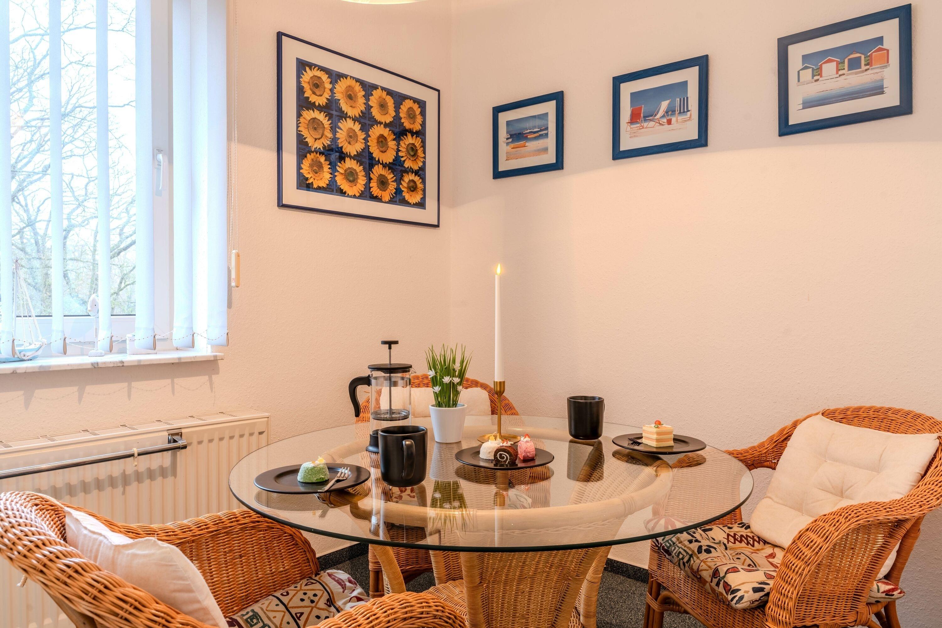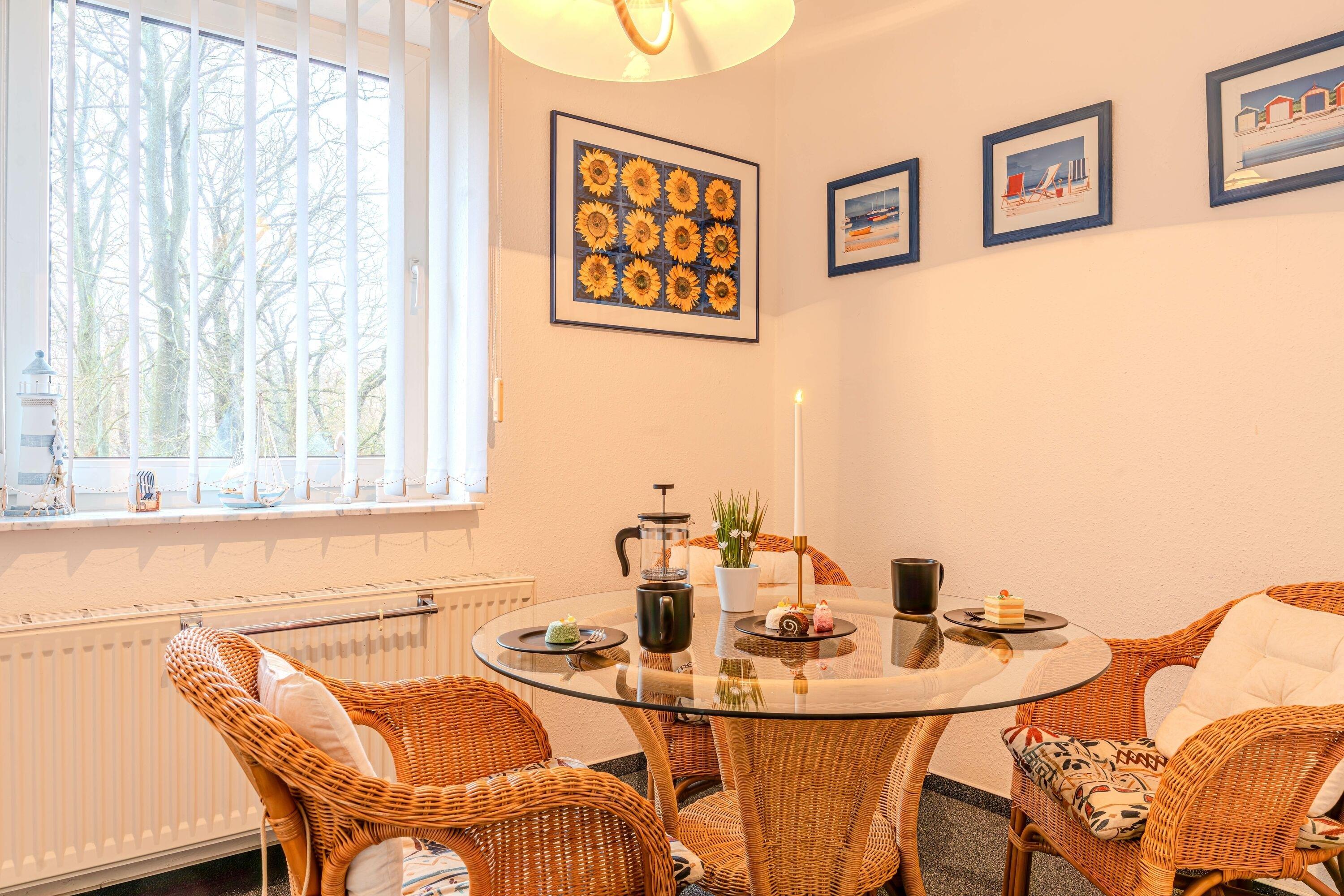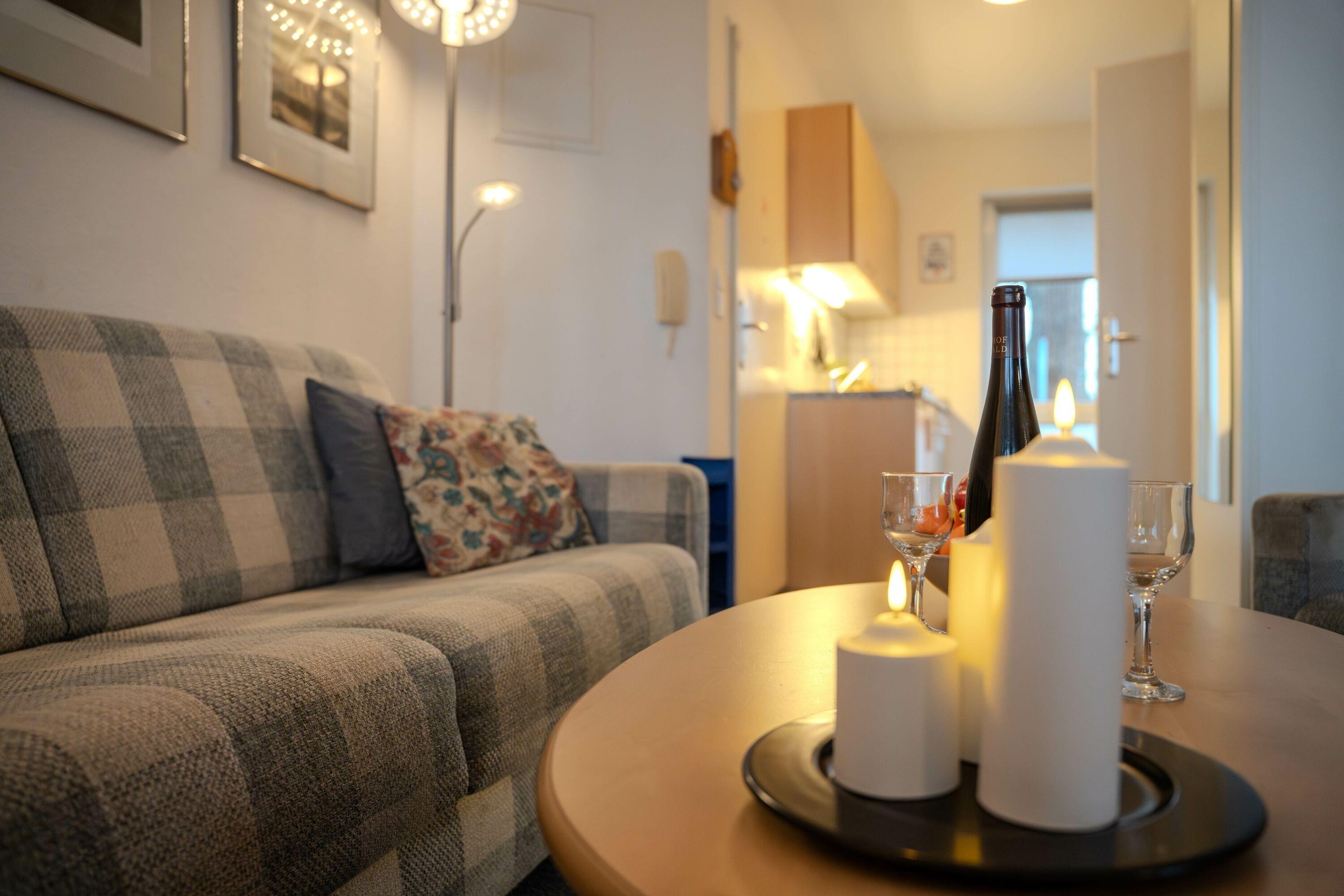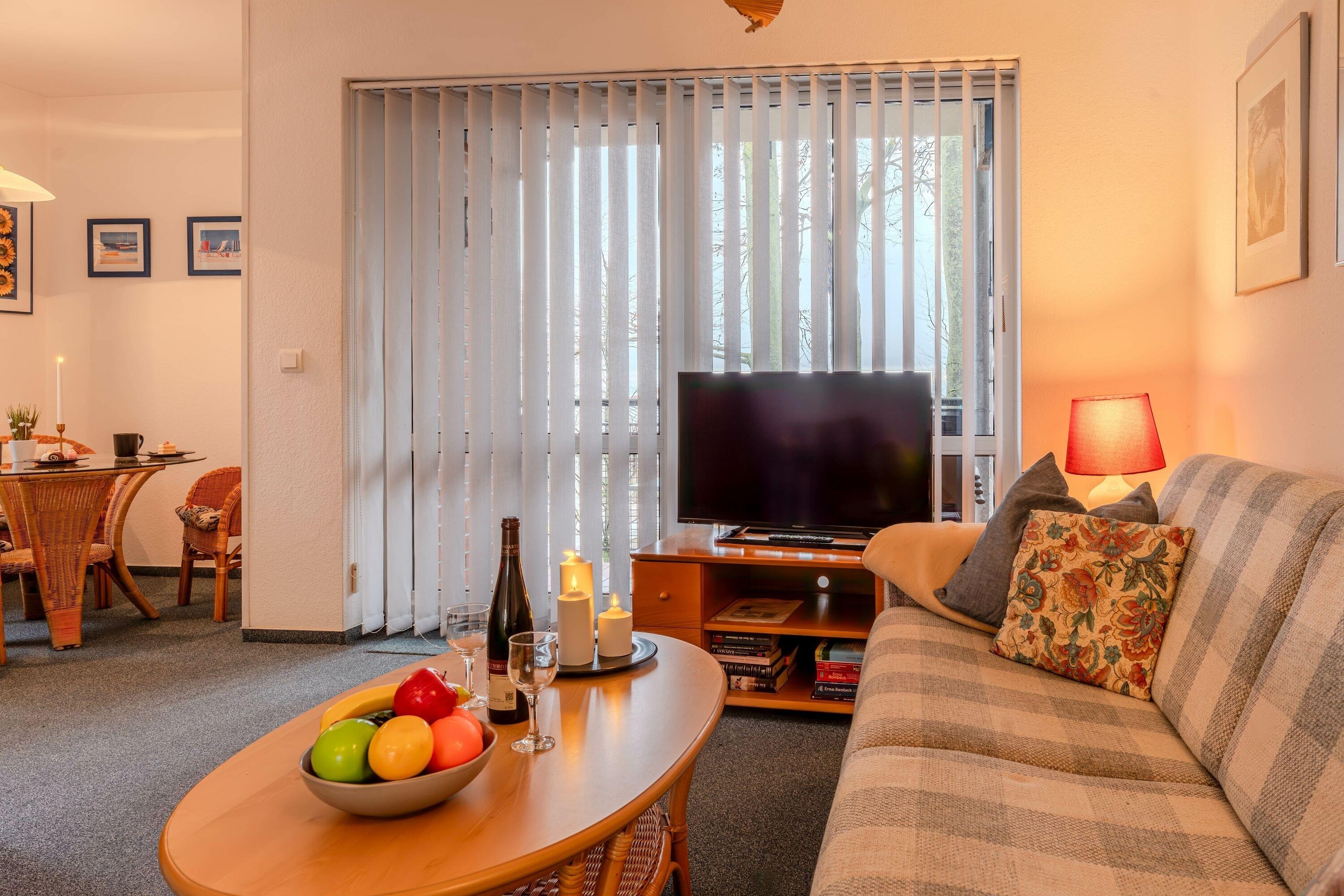 Das Nichtraucherappartement mit Seebrückenblick befindet sich innerhalb der Ferienanlage 'Seeblick' im 1. Obergeschoss des Gästehauses aus dem Jahr 1999. Es verfügt über ein Badezimmer mit Dusche und WC, einen Wohnraum mit Fernseher, Radio und offener Küche (ausgestattet mit Kaffeemaschine, Kühlschrank etc.), sowie einen möblierten Balkon mit Blick auf die Seebrücke. Zudem gibt es ein Schlafzimmer. Die Wohnung ist zentralbeheizt und geeignet für 2-3 Personen (mit einem Doppelbett im Schlafzimmer und einer Schlafcouch im Wohnraum). Bettwäsche und Handtücher sind im Buchungspreis enthalten.
