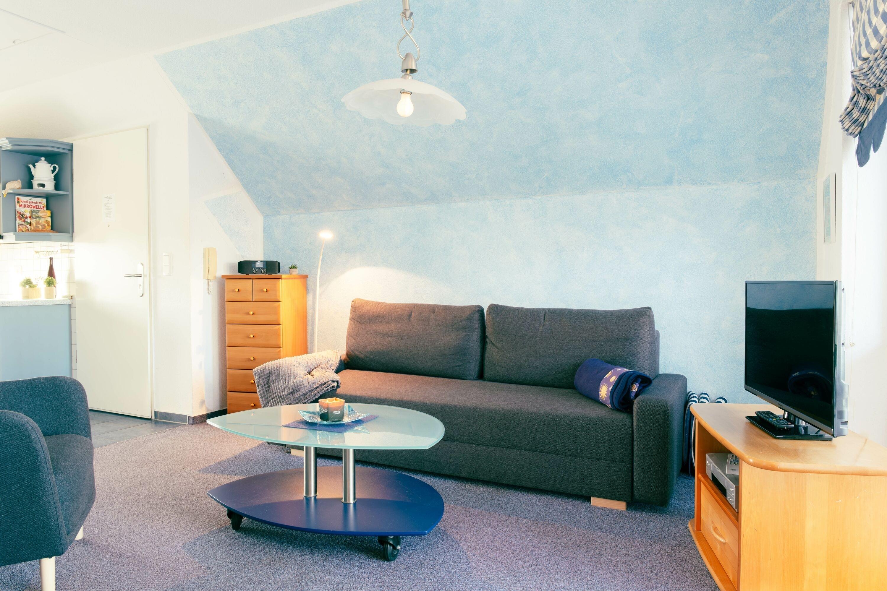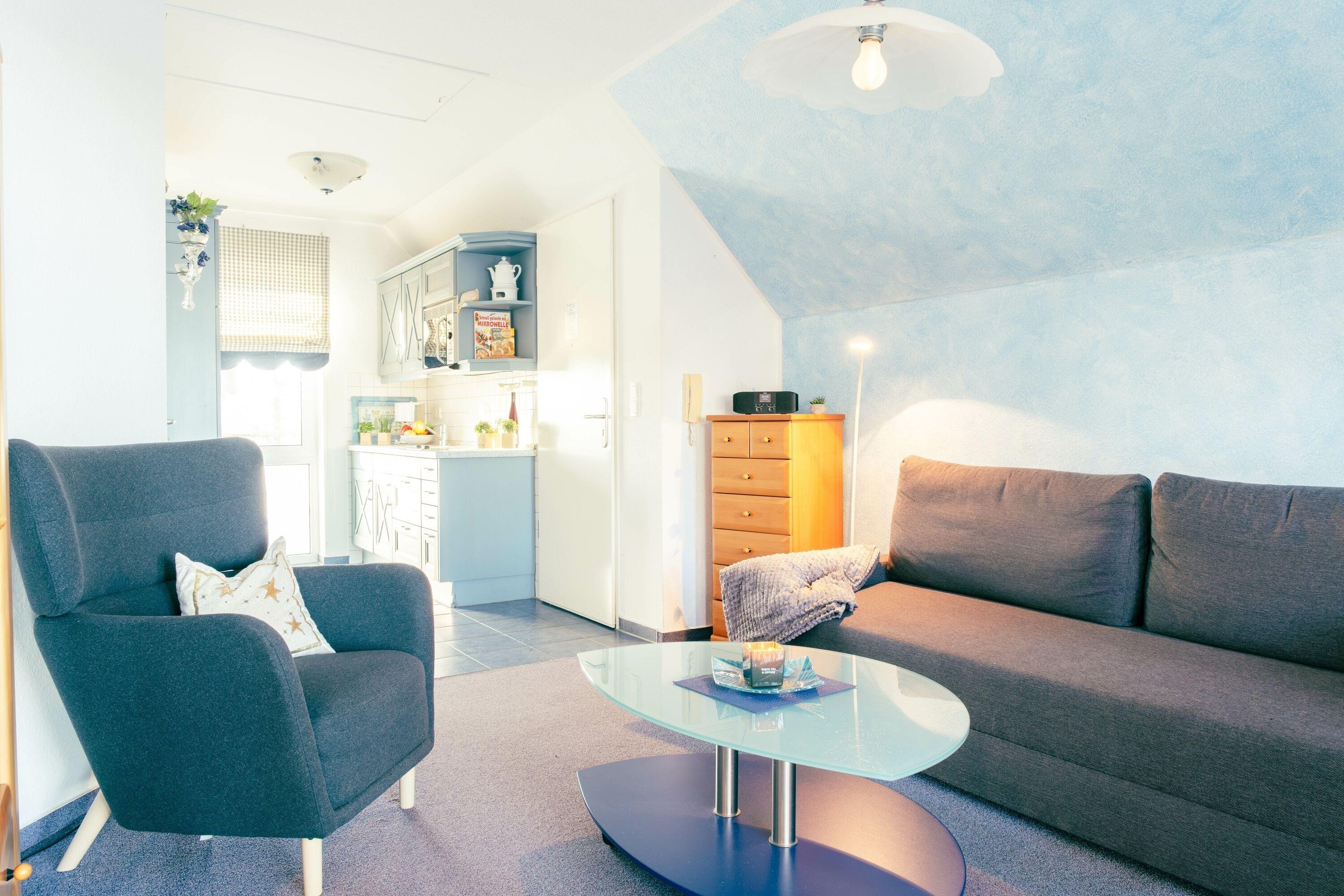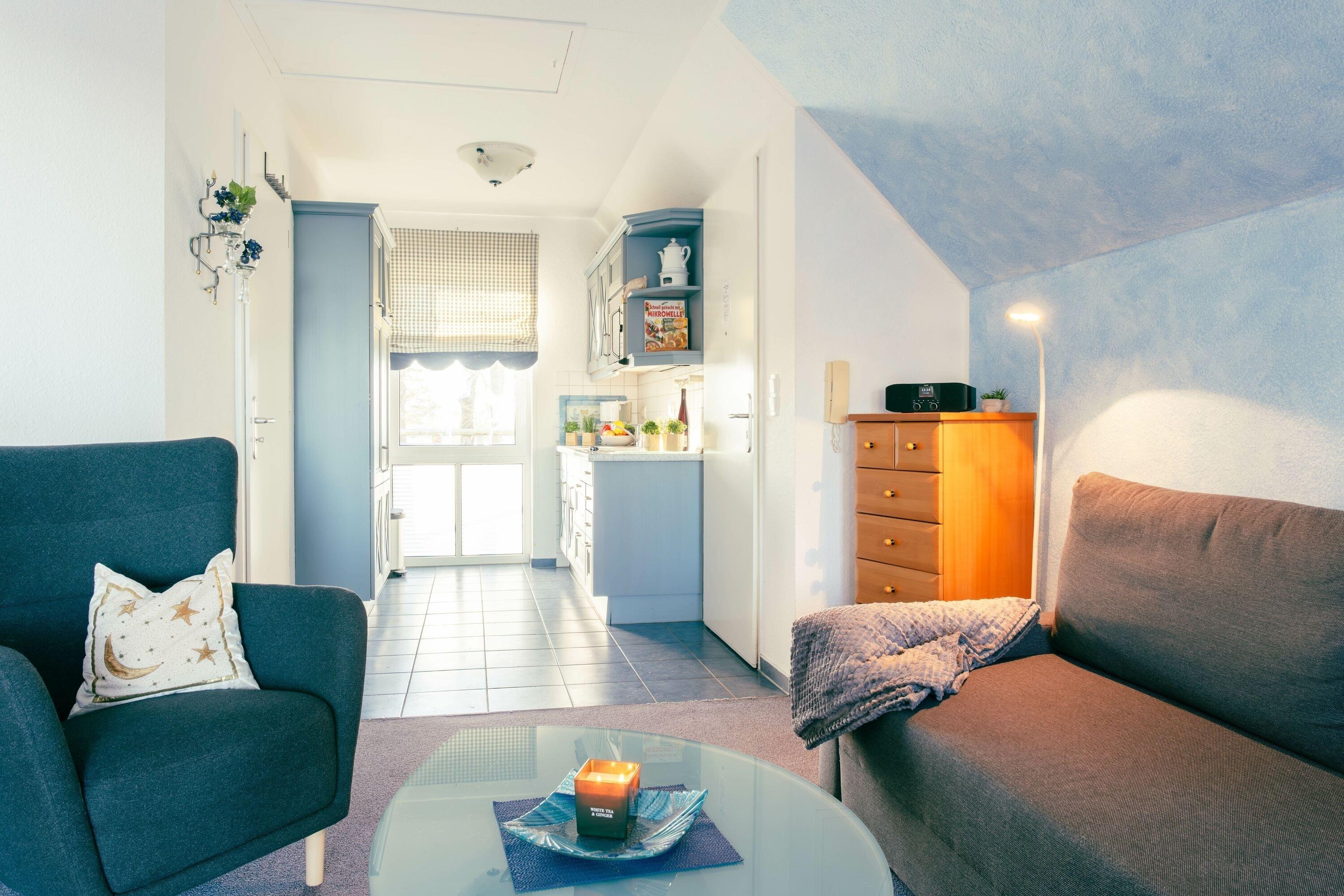 Das Nichtraucherappartement befindet sich im 2. Obergeschoss der Ferienanlage "Seeblick", die im Jahr 1999 erbaut wurde und verfügt über eine Dusche mit WC, einen Wohnraum mit TV und DAB-/Internet-Radio, eine integrierte Küche und einen möblierten Balkon mit Blick auf die Ostsee. Des Weiteren gibt es ein Schlafzimmer mit einem Doppelbett. Das Appartement ist zentralbeheizt und bietet Platz für 2-3 Personen, da es neben dem Doppelbett im Schlafzimmer auch eine Schlafcouch im Wohnraum gibt. Bei der Buchung sind Bettwäsche und Handtücher im Set enthalten.