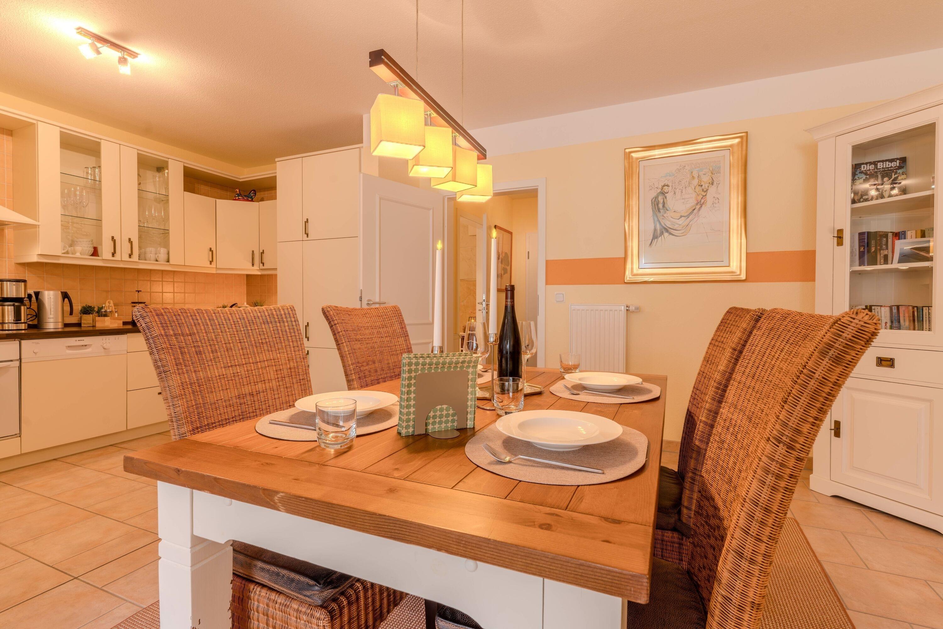 Der offene Wohn- und Essbereich mit Esstisch schafft eine einladende Atmosphäre für gemeinsame Mahlzeiten und gemütliche Abende.
