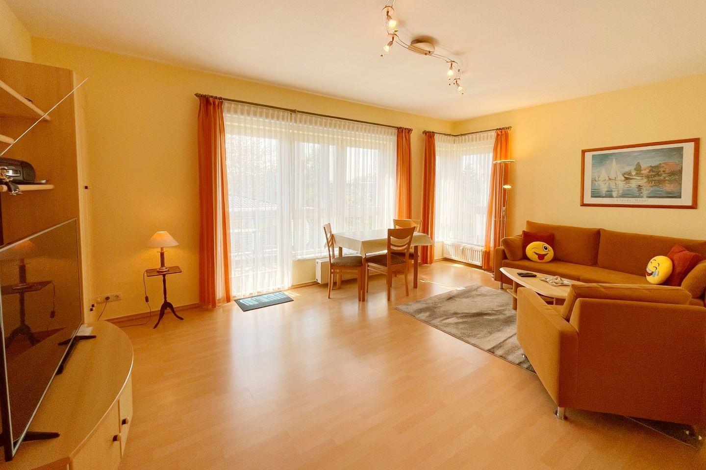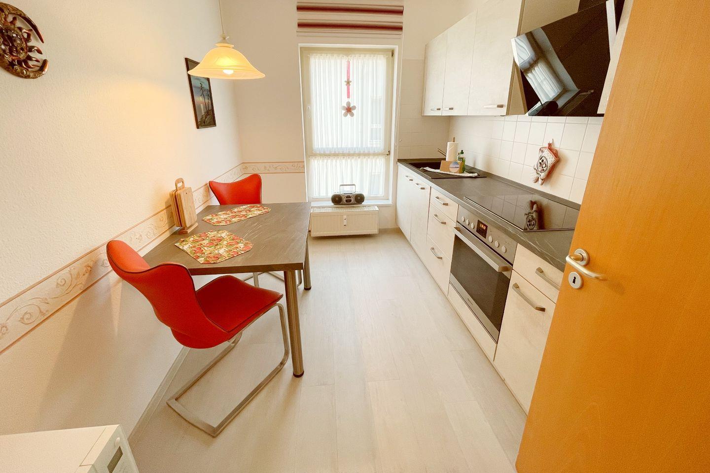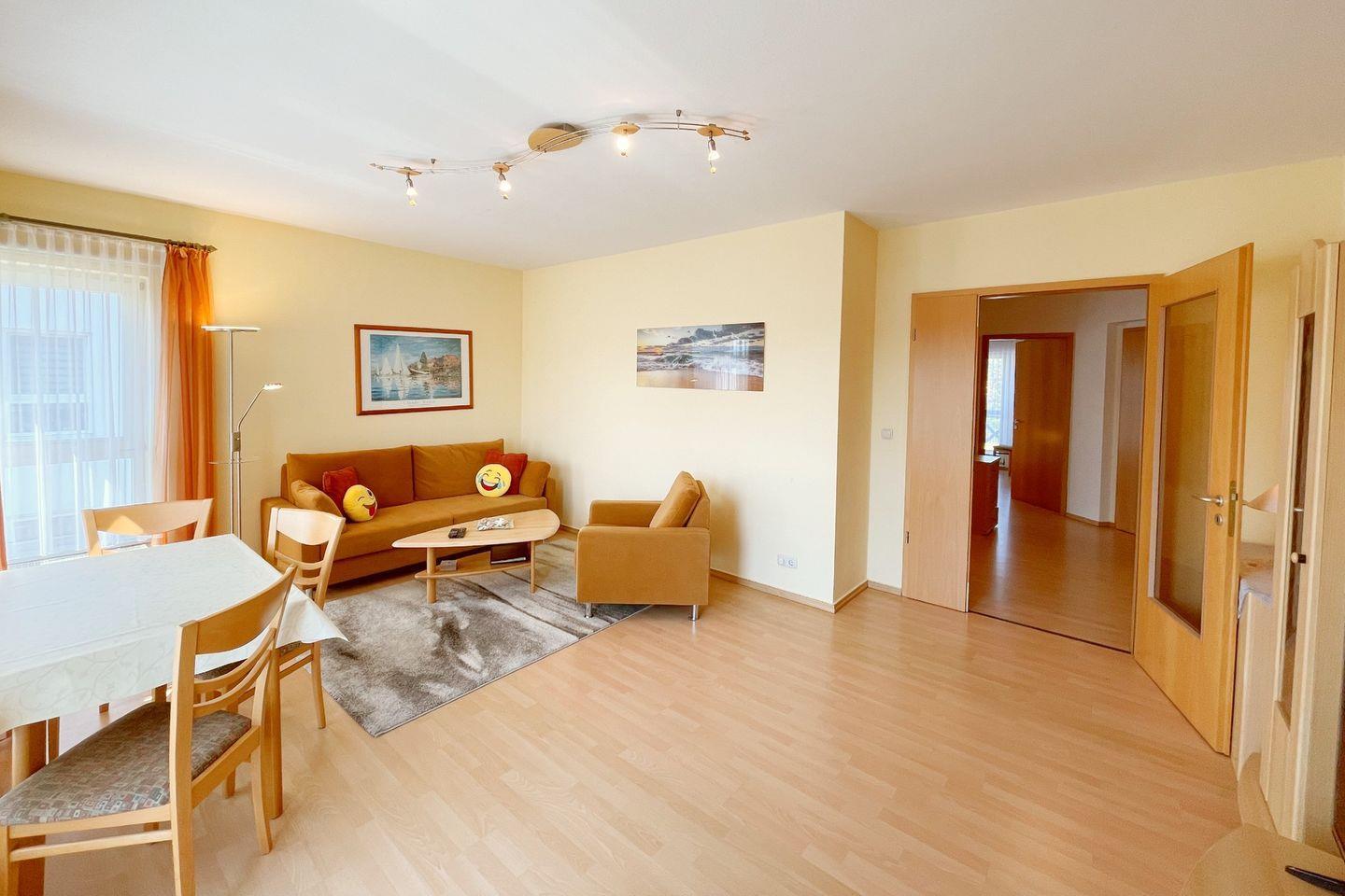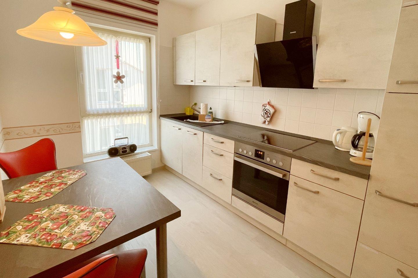 Die Wohnung verfügt über ein komfortables Schlafzimmer sowie ein helles Wohnzimmer, das mit einem gemütlichen Sofa und einem Esstisch ausgestattet ist. Hier können Sie nach einem Tag am Strand entspannen oder gemeinsam gesellige Abende verbringen. Die voll ausgestattete, abgeschlossene Küche bietet alles, was Sie benötigen, um Ihre Lieblingsgerichte zuzubereiten, darunter eine Cerankochfläche, einen Backofen und eine Spülmaschine. Die beiden Balkone laden dazu ein, die frische Ostseeluft zu genießen und den Tag bei einem guten Glas Wein ausklingen zu lassen.