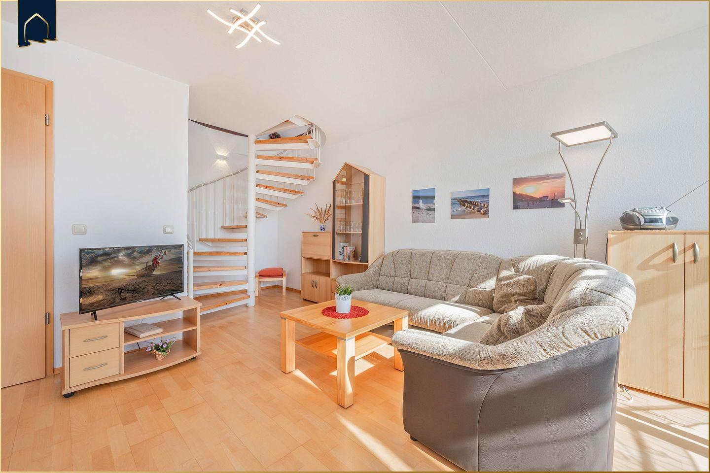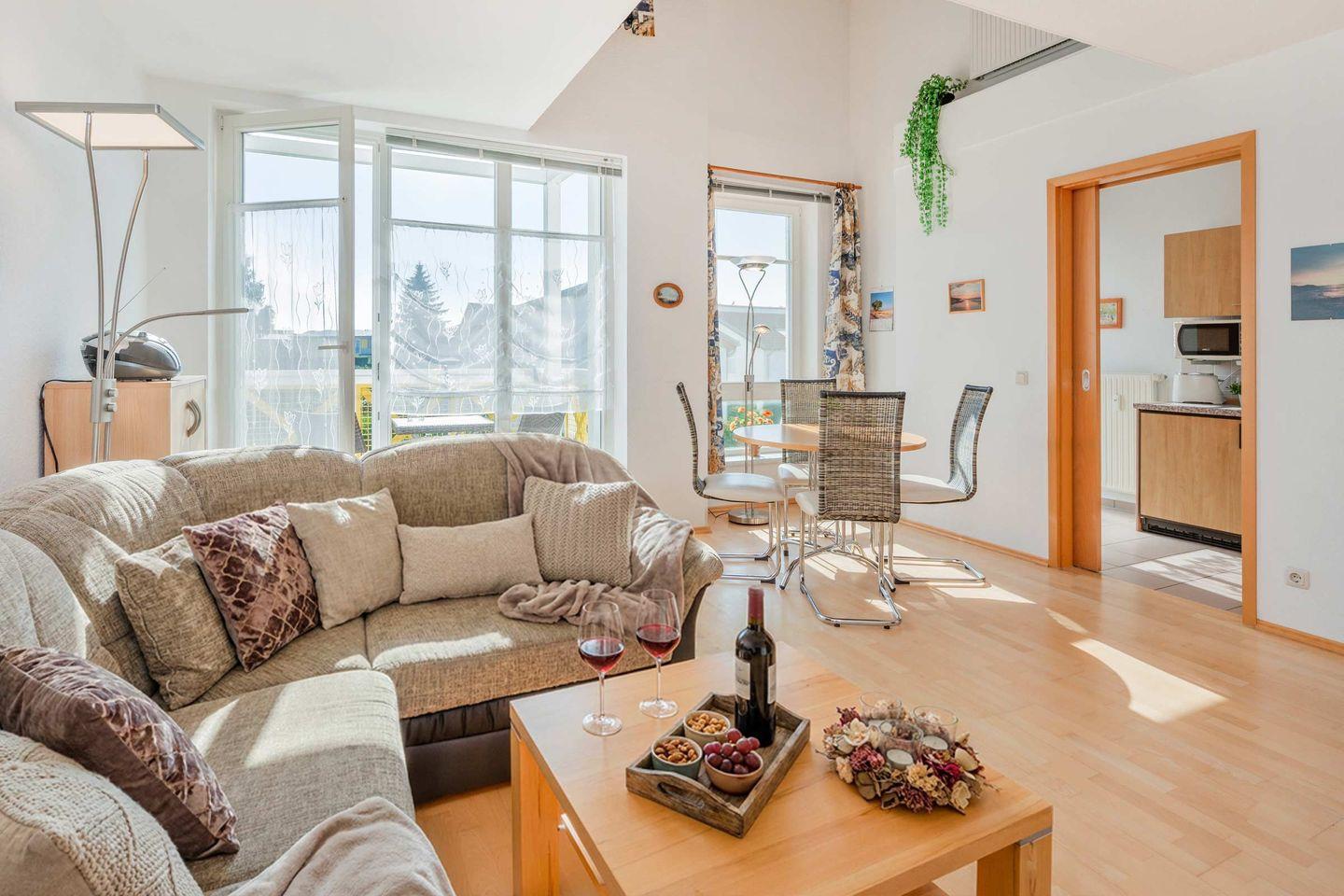 Mit rund 58?m² Wohnfläche bietet die Wohnung ausreichend Platz für bis zu drei Personen. Das separate Schlafzimmer ist mit einem komfortablen Bett und praktischem Stauraum ausgestattet, während der kombinierte Wohn- und Essbereich mit Sofa, TV und großem Esstisch zum Verweilen einlädt. Vom Balkon aus genießt du die frische Ostseeluft – perfekt für den Start in den Tag oder ein Glas Wein am Abend.