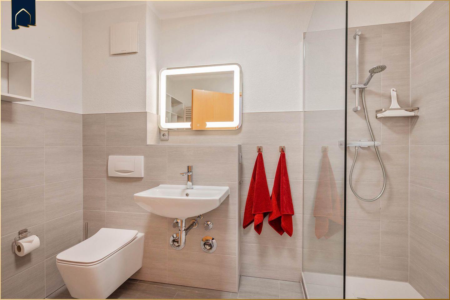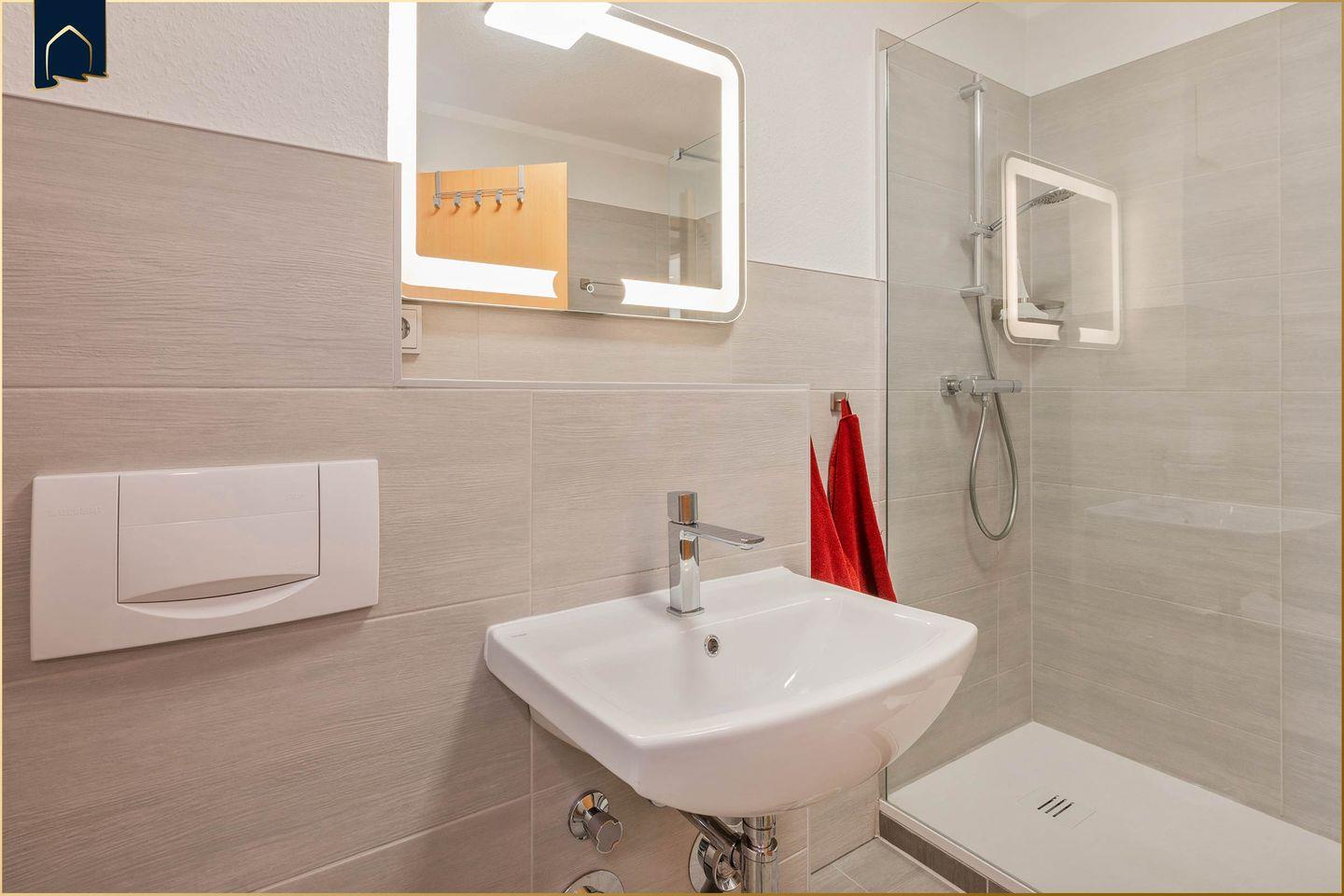Das moderne Bad ist mit einer Dusche, Waschbecken, WC und Haartrockner ausgestattet. Ein großer Spiegel und ausreichend Ablagefläche sorgen für Komfort im Alltag. Dank kostenfreiem WLAN bleibst du auch im Urlaub bestens verbunden.