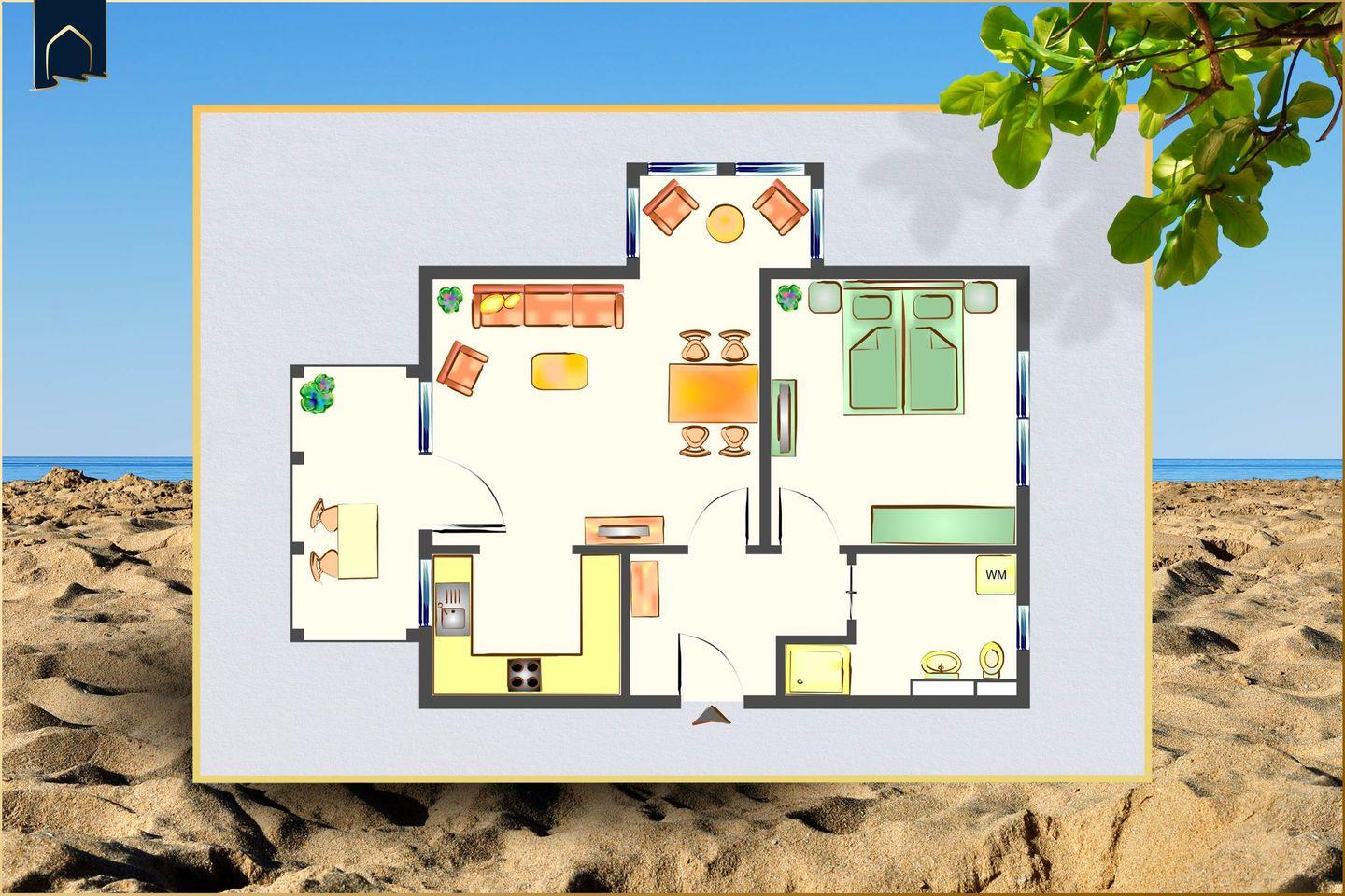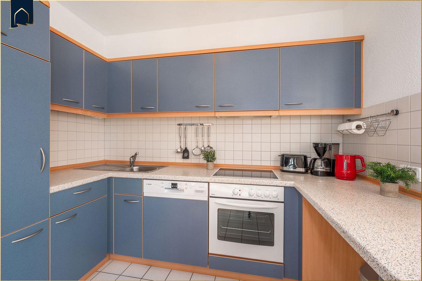 Die helle Wohnung verfügt über ein Schlafzimmer mit komfortablen Schlafmöglichkeiten für bis zu vier Personen sowie ein gemütliches Wohnzimmer mit Sofaecke und zwei Fernsehern. Im modern ausgestatteten Essbereich mit Esstisch genießen Sie gemeinsame Mahlzeiten. Die Küche ist komplett eingerichtet – von Backofen, Herd und Spülmaschine bis hin zu Kaffeemaschine, Toaster, Wasserkocher und Eierkocher. Praktische Extras wie Geschirr, Besteck, Küchenutensilien und Gefrierfach machen Ihren Aufenthalt unkompliziert. WLAN, Fliegengitter und Sichtschutz an allen Fenstern sorgen für zusätzlichen Komfort.