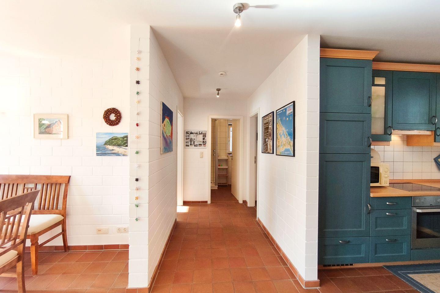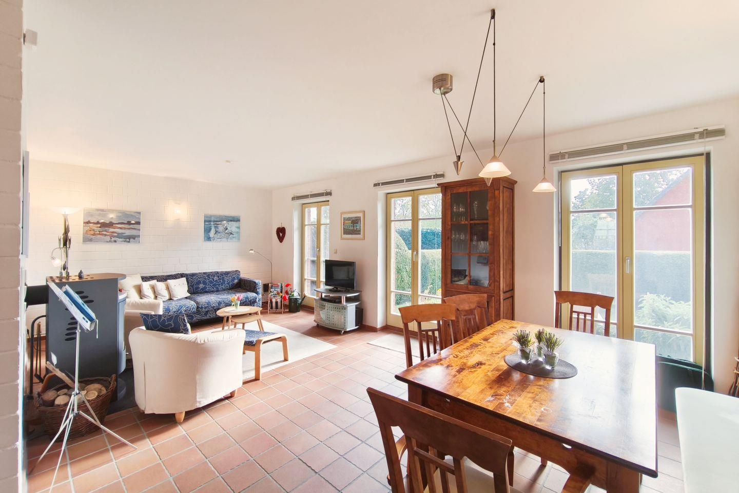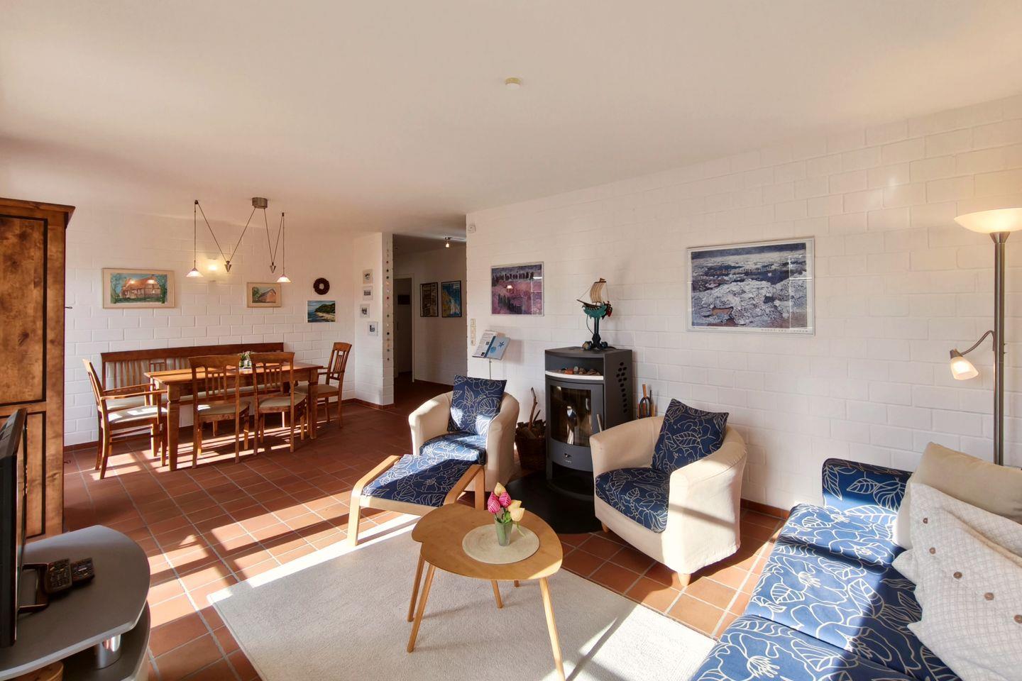 Die Ferienwohnung erstreckt sich über zwei Etagen im Parterre und verfügt über insgesamt drei Zimmer, darunter zwei separate Schlafzimmer mit Fliesenboden. Die vier Schlafmöglichkeiten bieten ausreichend Platz für bis zu vier Personen. Im ansprechend gestalteten Wohnzimmer lädt eine gemütliche Sofaecke zum Verweilen ein. Ein Kaminofen sorgt an kühleren Tagen für behagliche Wärme, während die Fußbodenheizung und die Zentralheizung ganzjährig angenehme Temperaturen garantieren.