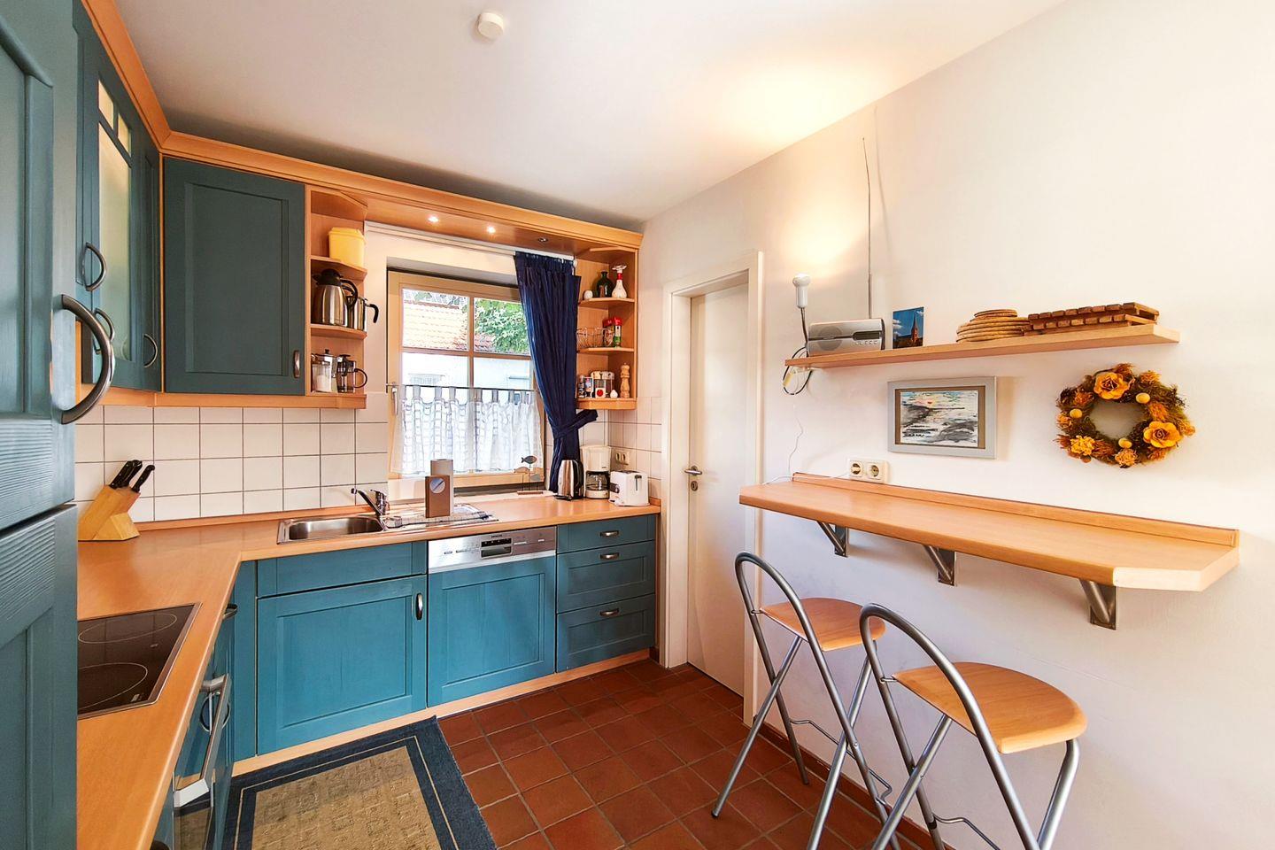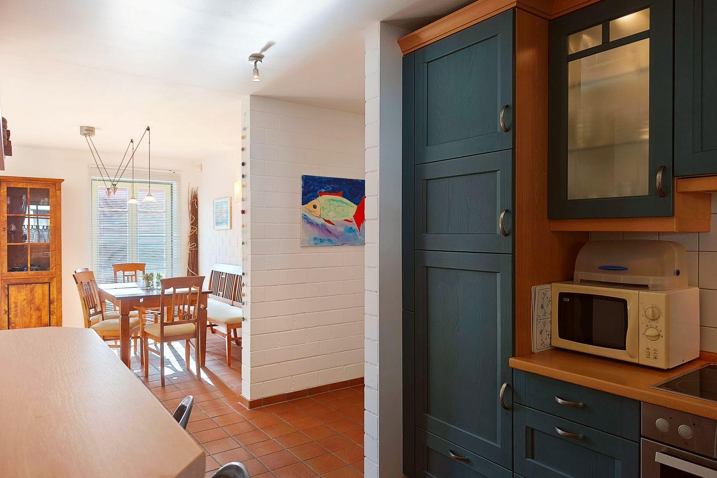 Die offene Küche ist nahtlos in den Wohnbereich integriert, in dem auch ein großer Essbereich mit einem großen Tisch und ausreichend Platz für die ganze Familie zum Verweilen einlädt. Die Küche lässt mit ihrer umfangreichen Ausstattung keine Wünsche offen. Moderne Geräte wie Cerankochfeld, Elektrobackofen, Mikrowelle, Kühlschrank mit separatem Gefrierschrank, Spülmaschine, Wasserkocher, Toaster und Kaffeemaschine stehen zur Verfügung. Zudem sind sämtliche Küchenutensilien, Geschirr, Besteck und Geschirrhandtücher vorhanden, sodass Sie sich im Urlaub wie zu Hause fühlen können.