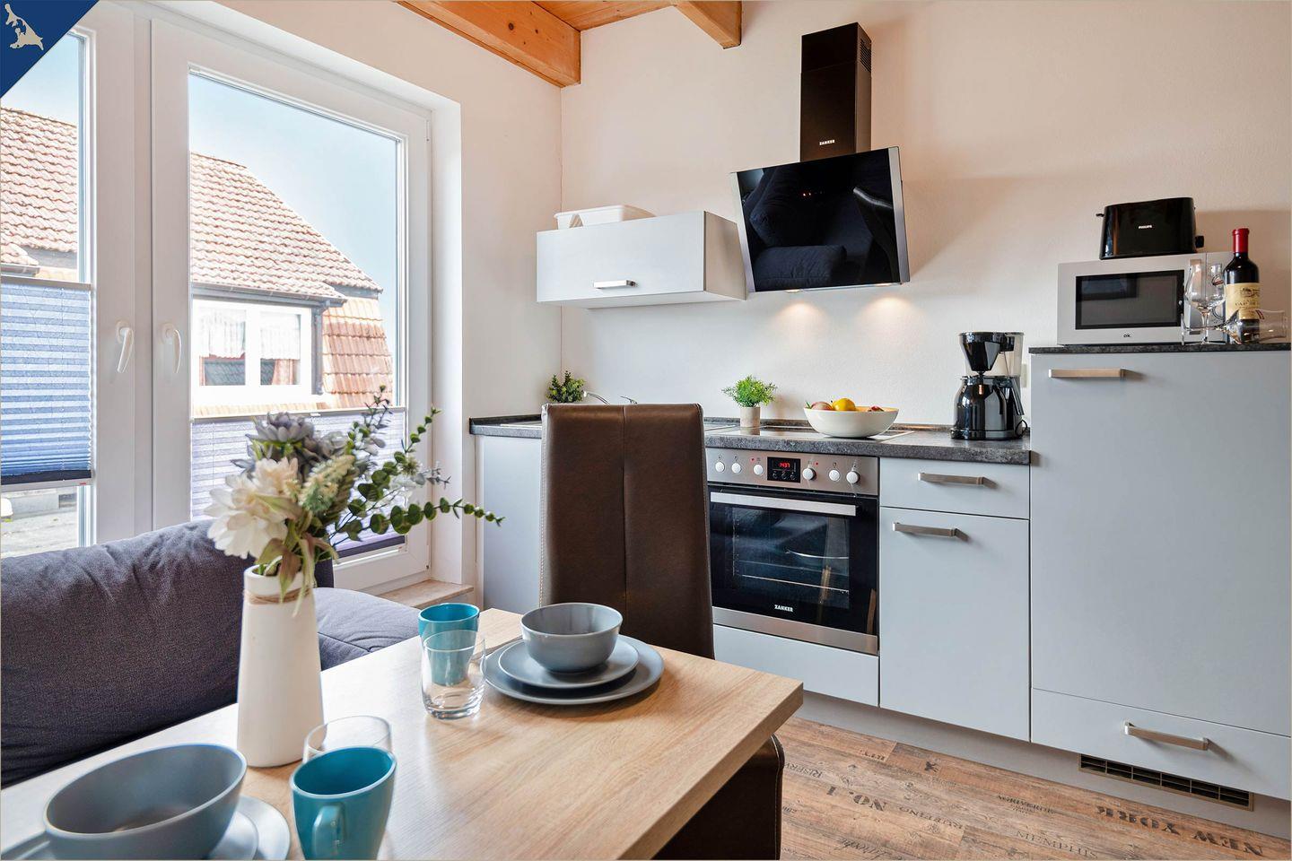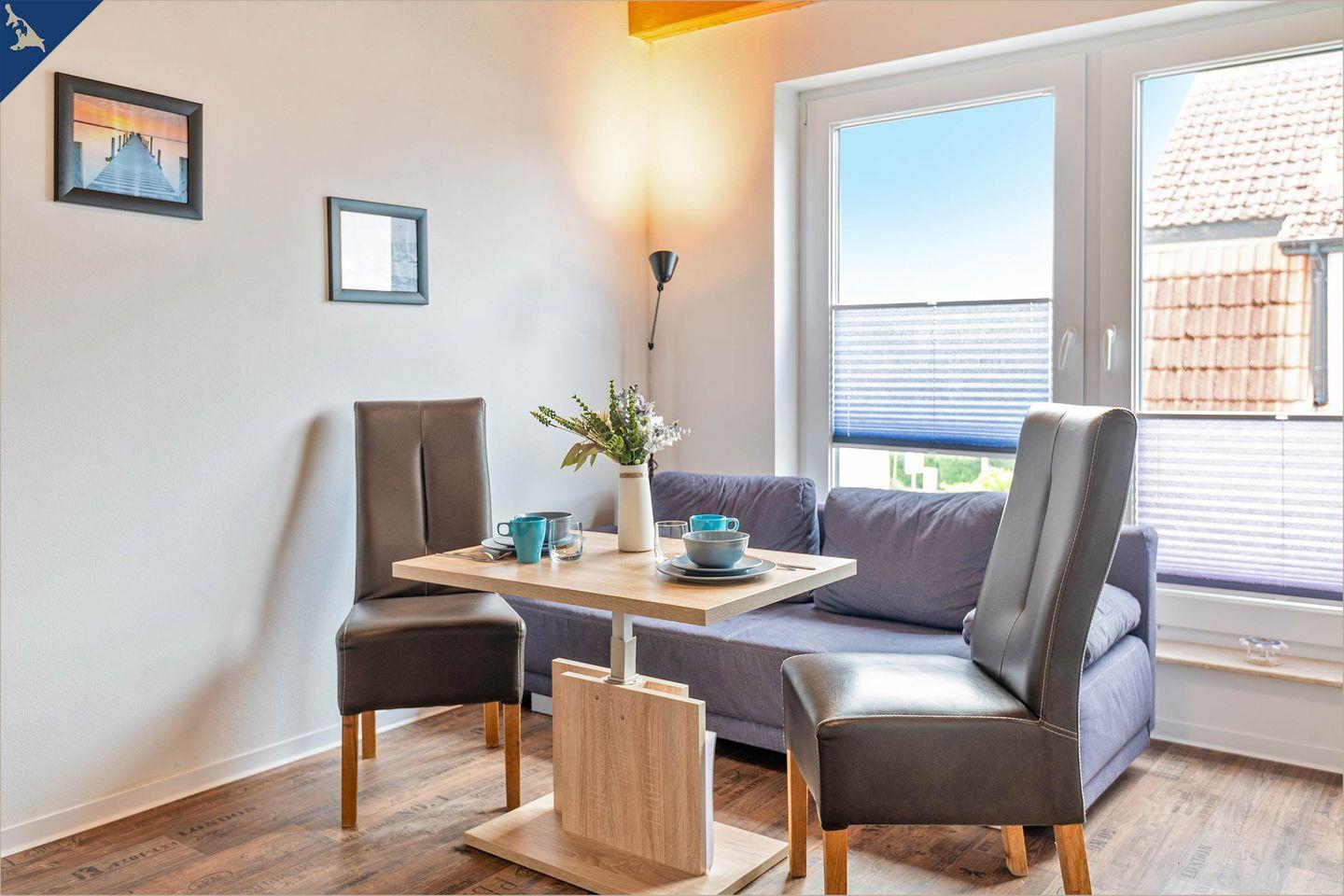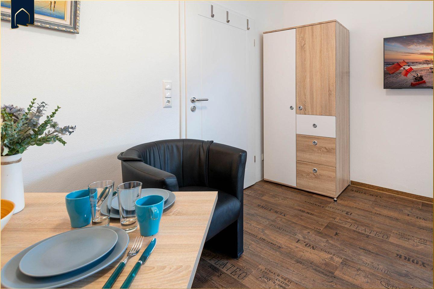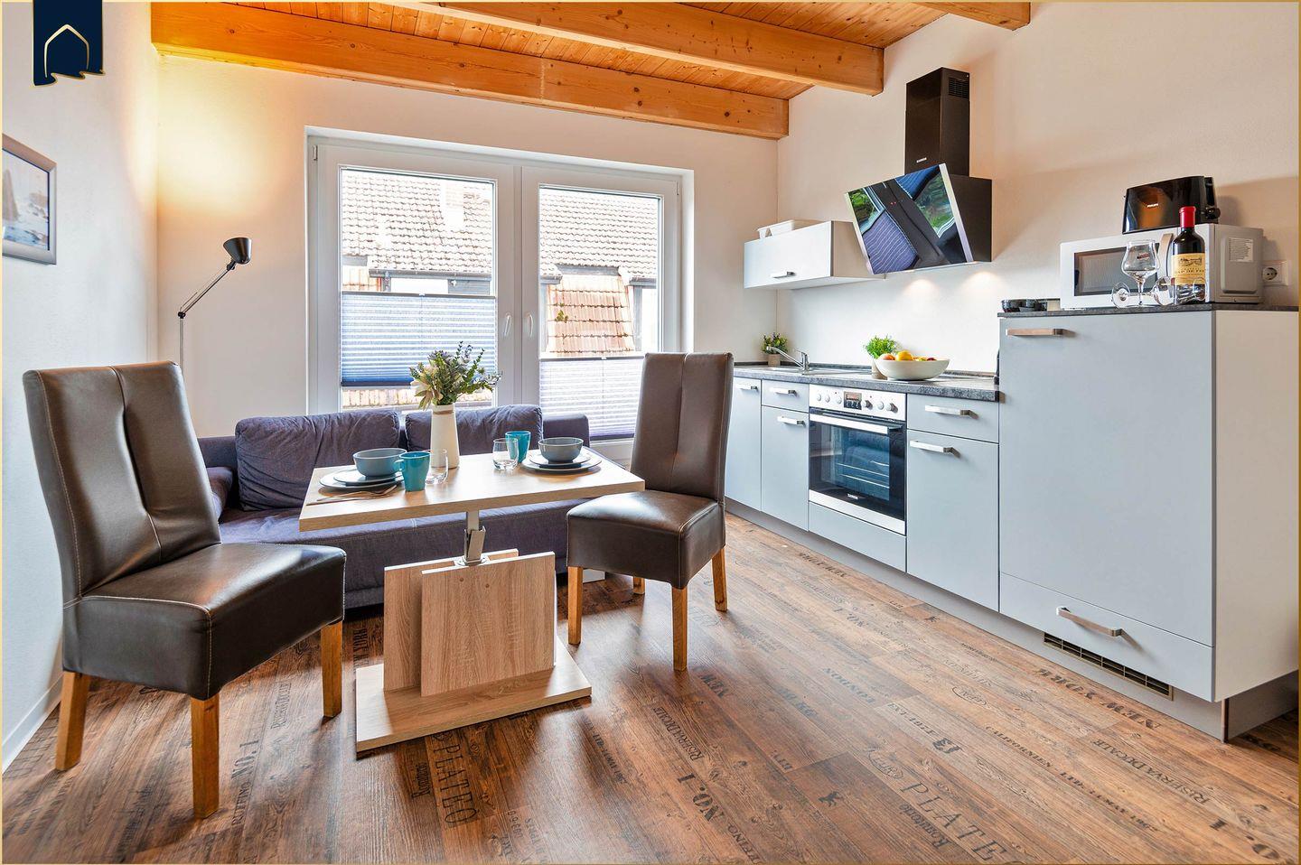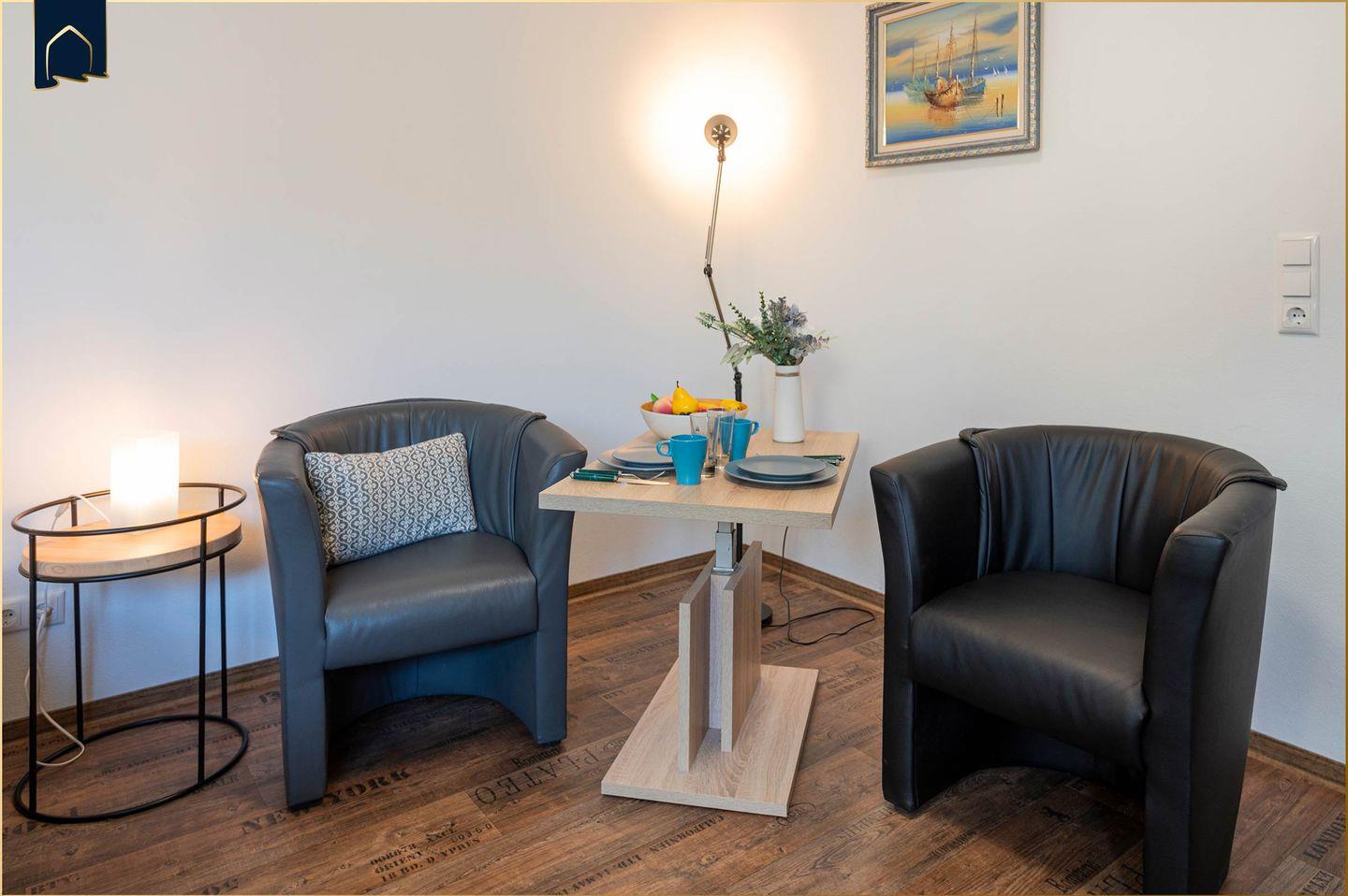 Die helle Wohnung bietet Platz für zwei Personen und verfügt über ein separates Schlafzimmer mit gemütlichem Bett, ein modernes Badezimmer mit Dusche sowie einen offenen Wohnbereich mit Sofaecke und TV. Die Küche ist vollständig ausgestattet – inklusive Backofen, Herd, Kühlschrank, Mikrowelle, Kaffeemaschine, Wasserkocher und Toaster. Auch WLAN steht Ihnen kostenfrei zur Verfügung. Ein Esstisch im Wohnbereich lädt zu gemeinsamen Mahlzeiten ein.