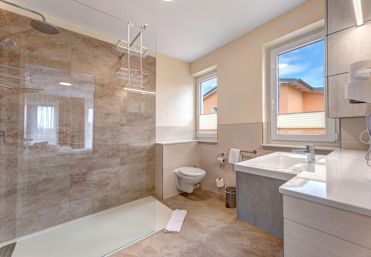 Die drei Badezimmer sind modern gestaltet und verfügen über Duschen, Waschbecken und hochwertige Sanitäreinrichtungen. Wir freuen uns, Sie in Koserow begrüßen zu dürfen!.