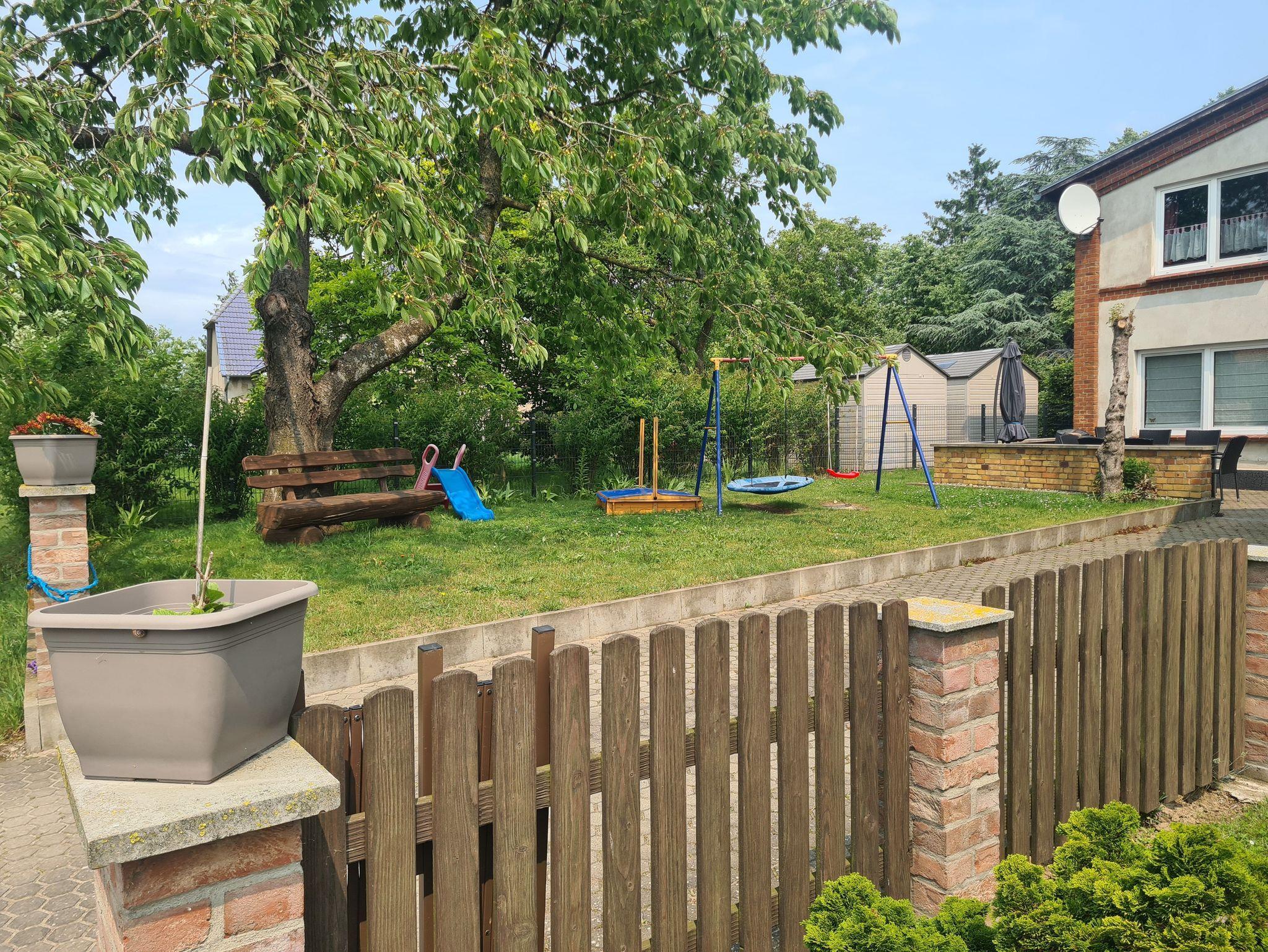Schattenspendender Obstgarten. Große Grillterrasse mit Sonnenschirm, Feuerschale für gemütliche Abendstunden. Kinderschaukeln, Nestschaukel, Sandkiste und Rutsche.