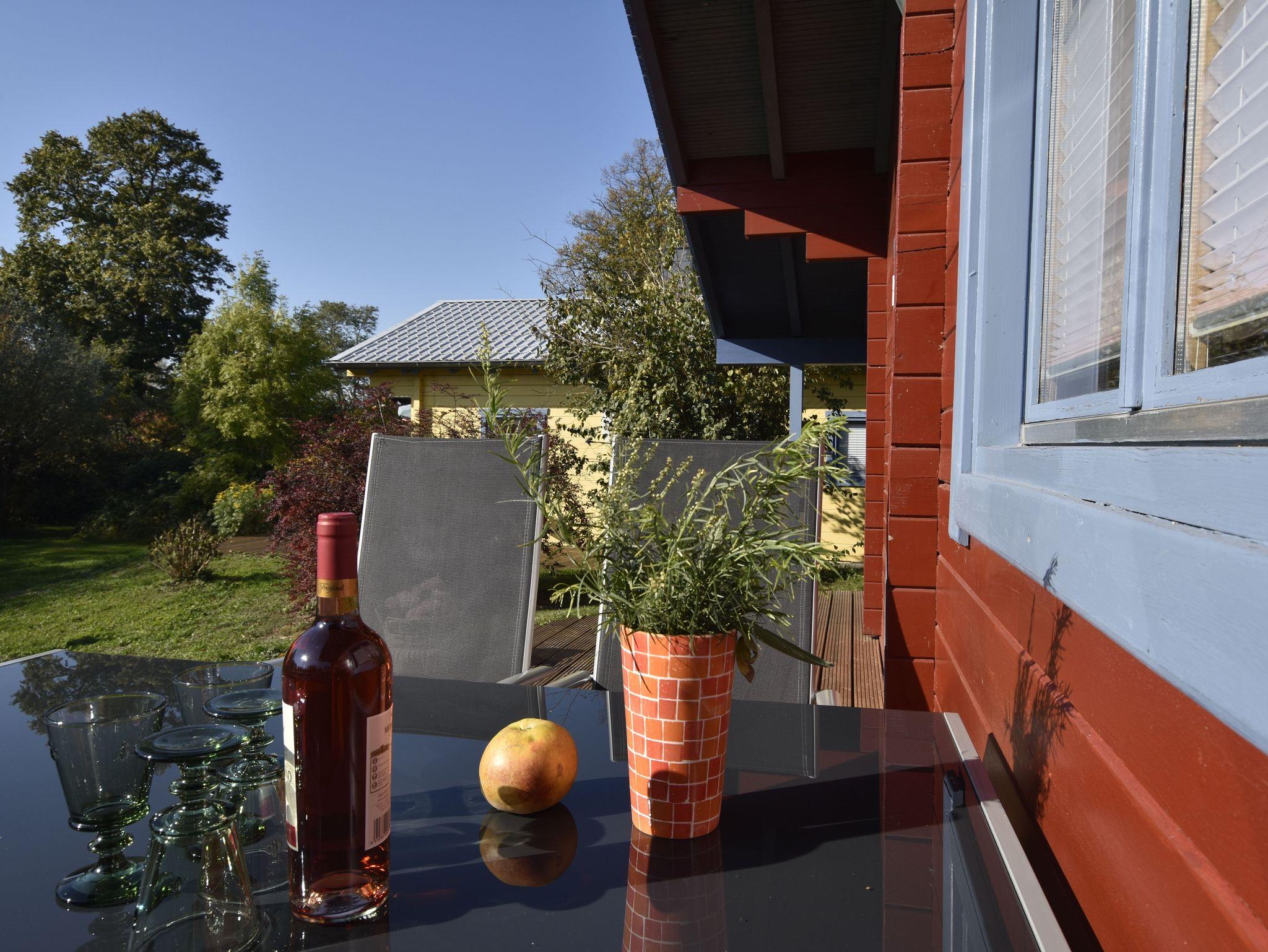 Das ebenerdige Ferienhaus Bine - mit offenem Wohnraum und moderner Küche und Eßtisch und direktem Ausgang auf die sonnige Terrasse mit Blick in den Garten. 2 Schlafzimmer im Erdgeschoss bieten gute Ruhemöglichkeiten.