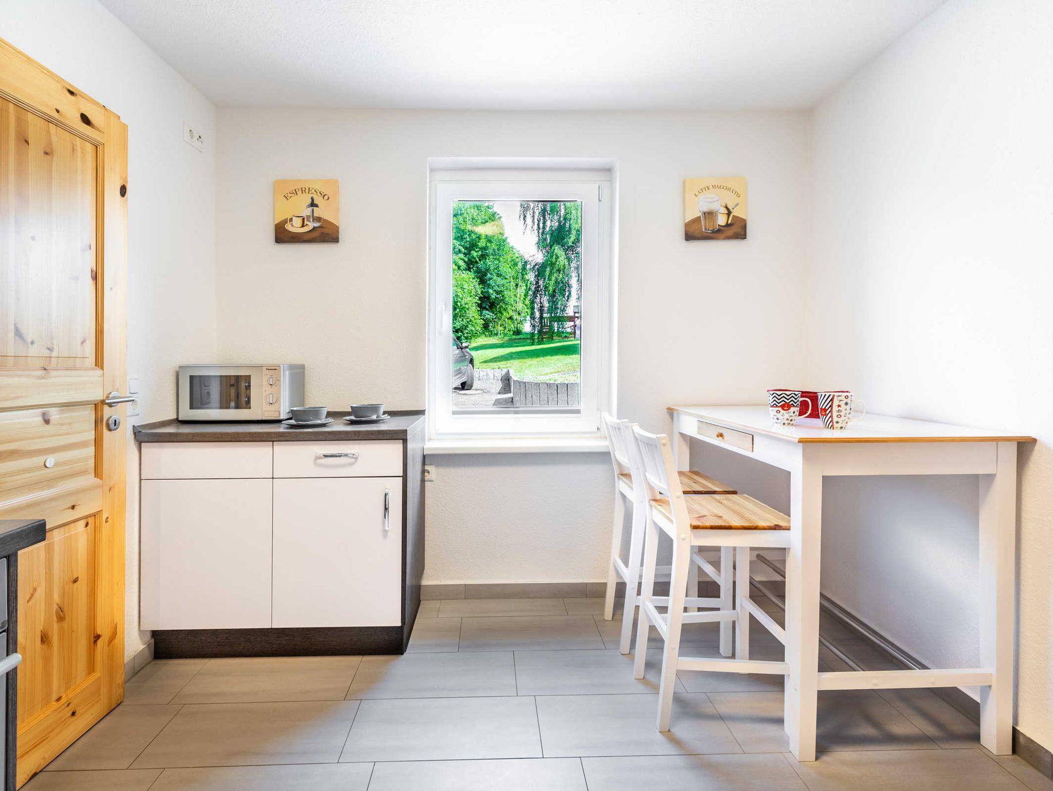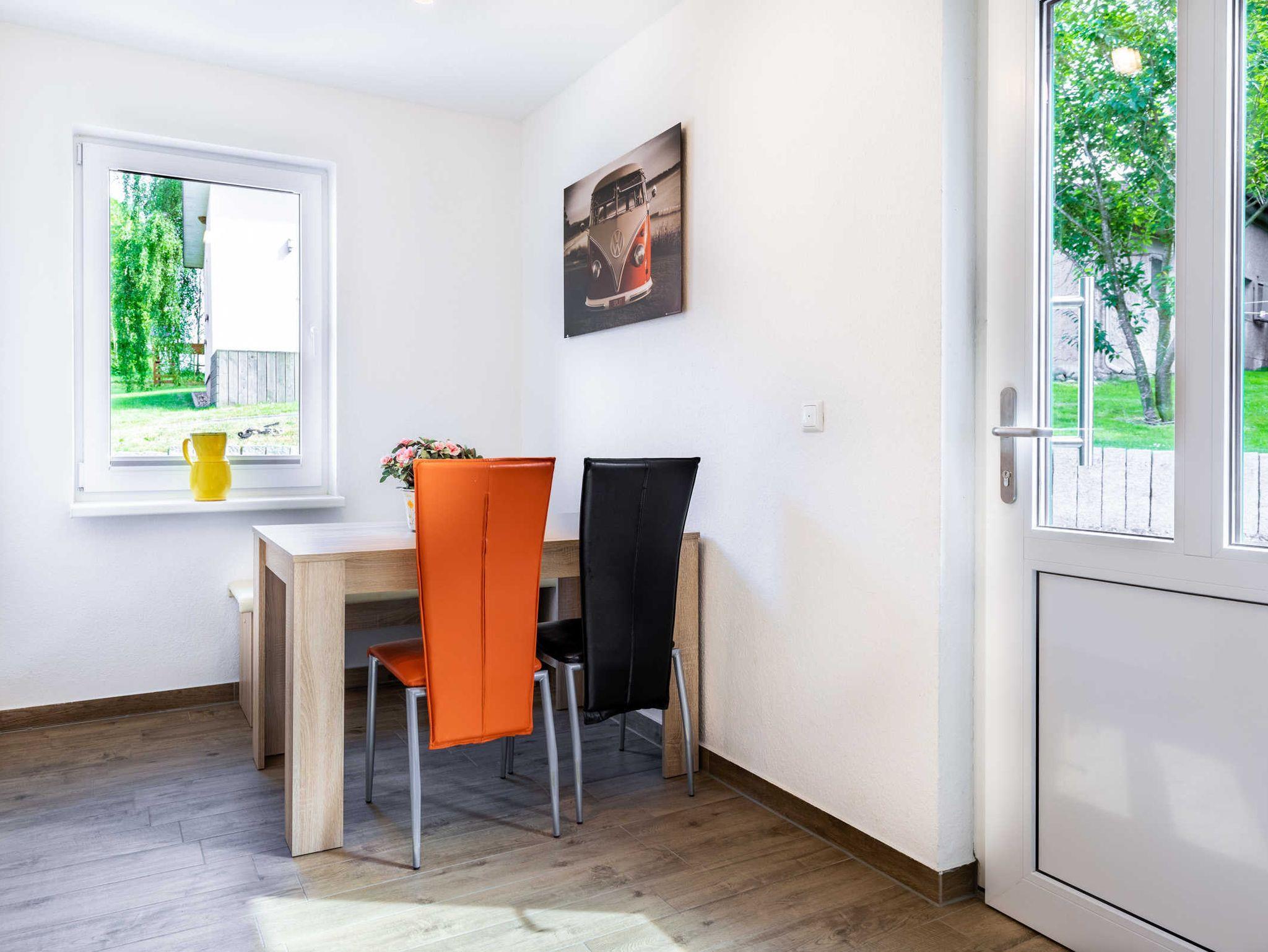 Im sonnigen Eingangsbereich der Haushälfte befindet sich der Esstisch. Die separate Küche ist umfangreich ausgestattet und verfügt über einen Geschirrspüler, 4- Platten Ceranherd, Backofen, Kühlschrank mit Gefrierfach, Mikrowelle, Kaffeemaschine und Wasserkocher. Das Bad ist mit Dusche, WC und Waschmaschine ausgestattet. Das Ferienhaus ist gefliest und wird über eine Fußbodenheizung beheizt.