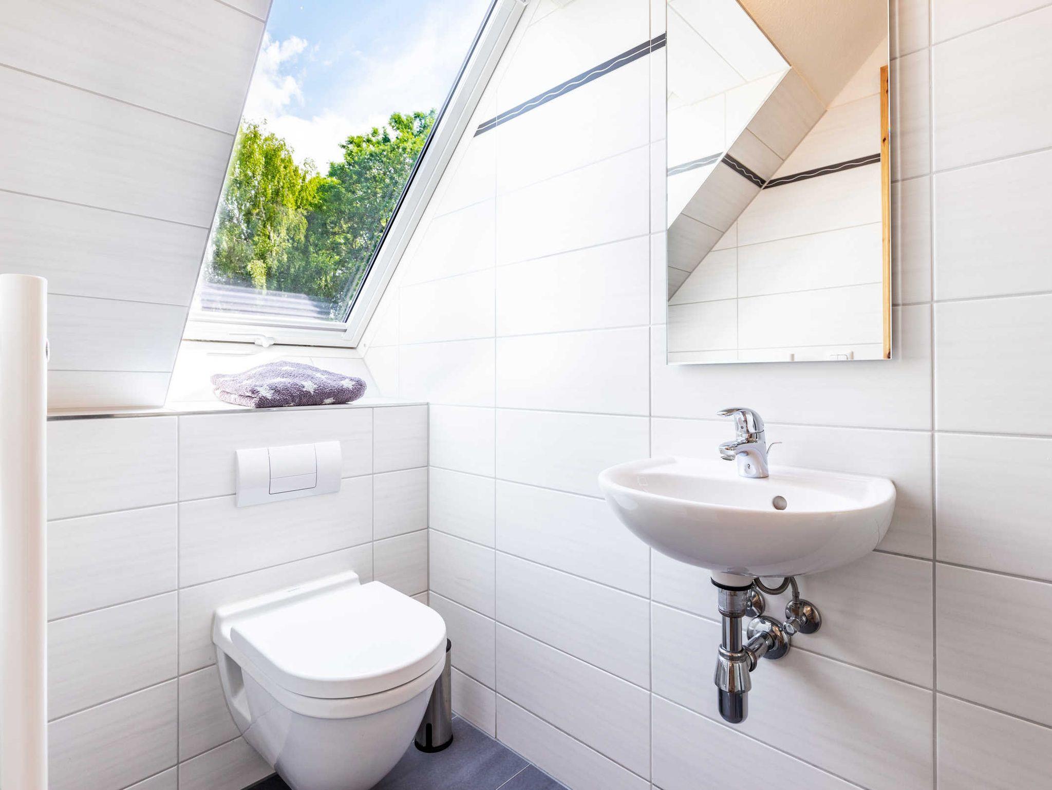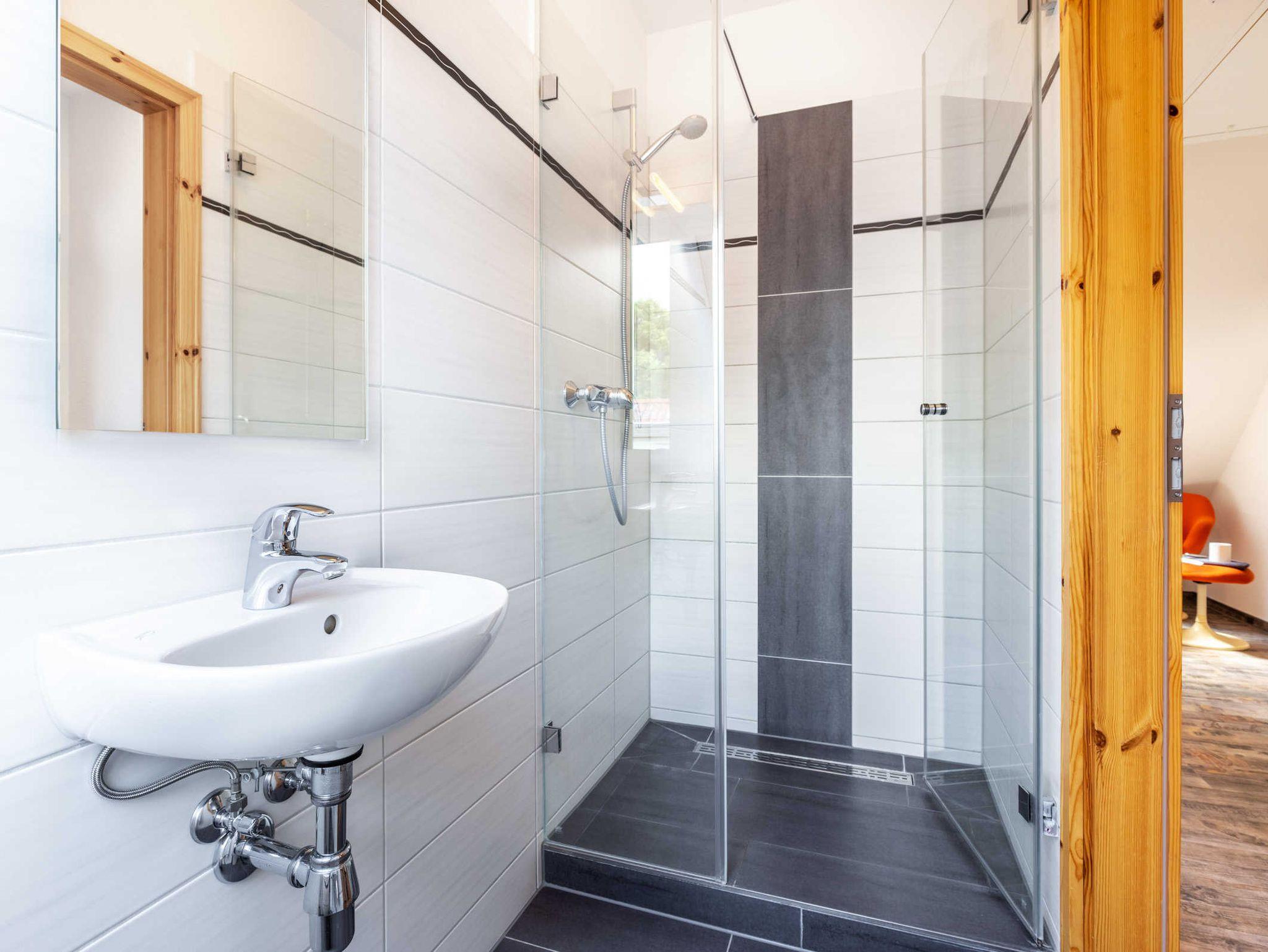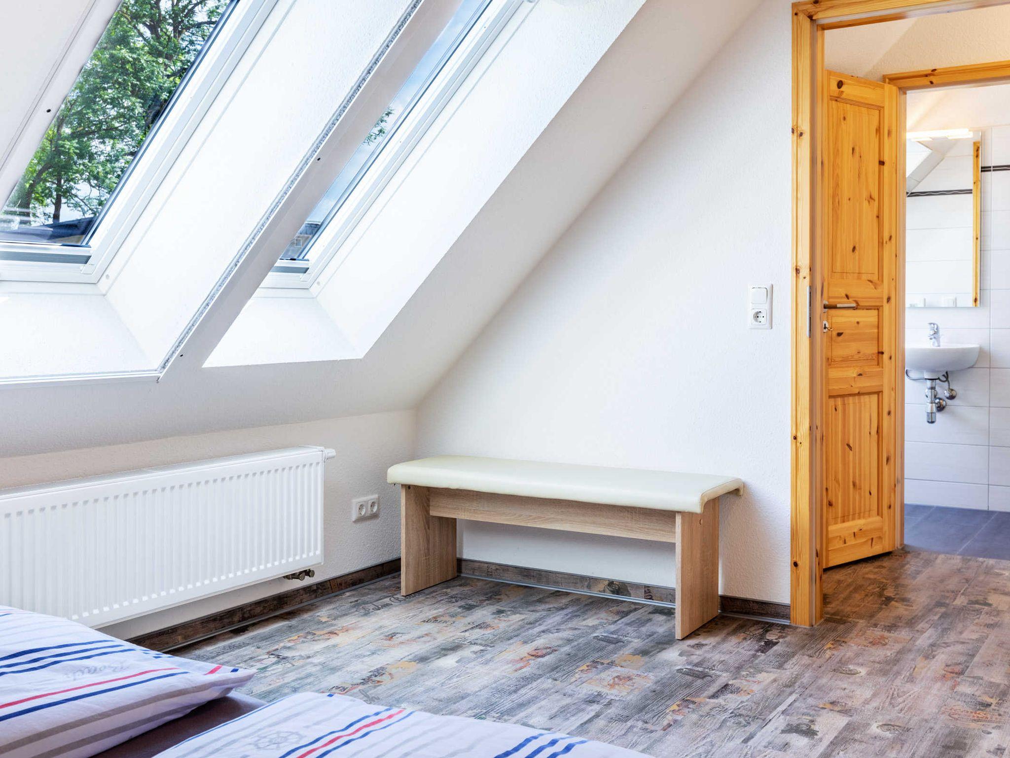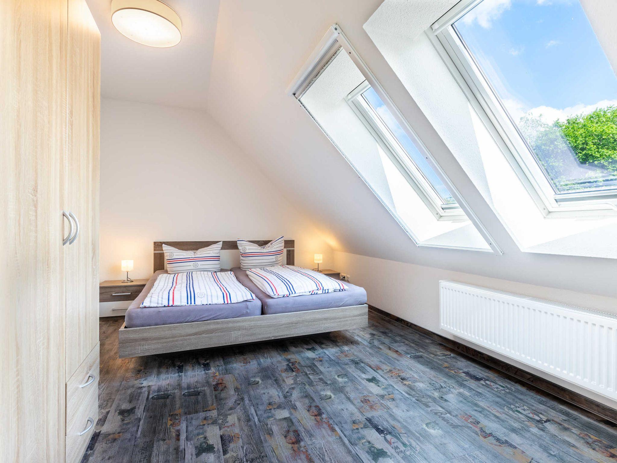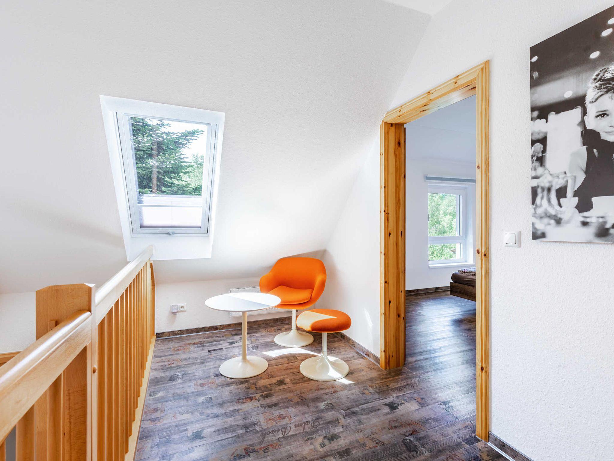 Im Obergeschoss. Das OG erreicht man über eine breite Treppe. Hier befinden sich die beiden separaten Schlafzimmer, die jeweils mit einem Doppelbett (1,80 x 2,00m) und großzügigem Kleiderschrank ausgestattet sind. Das Bad verfügt über Dusche und WC. Sehr schön ist der helle Galeriebereich.