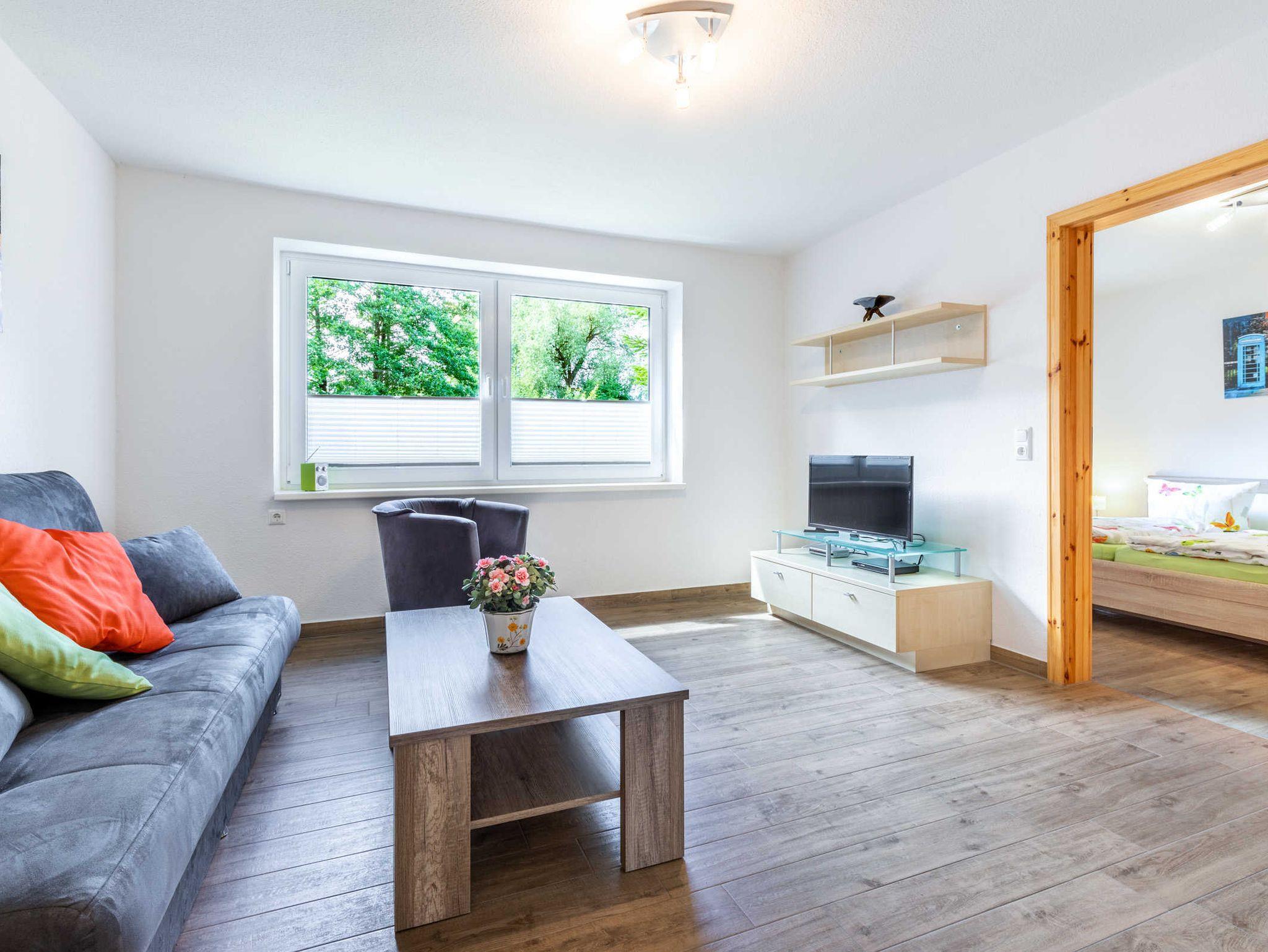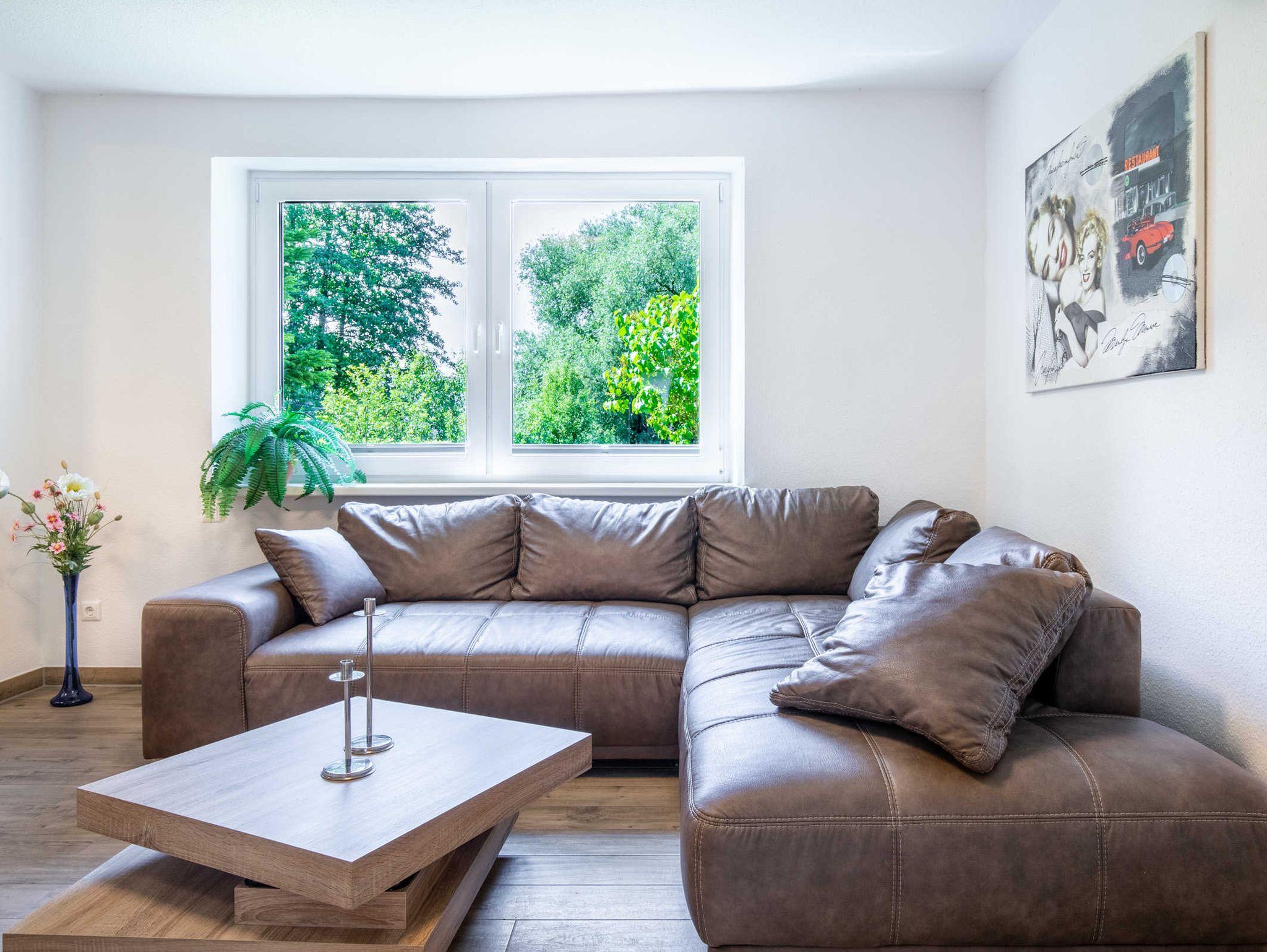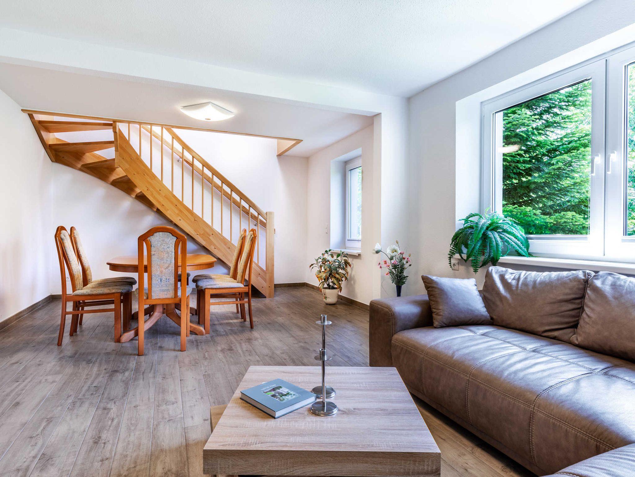 Im EG befindet sich das große Wohnzimmer mit Couchecke und TV (Couch als Schlafcouch ausziehbar - ca. 1,80 x 2,00), sowie ein Esstisch.