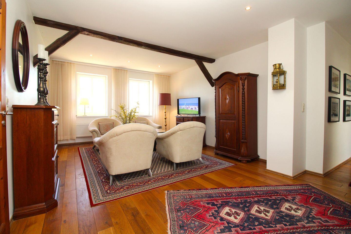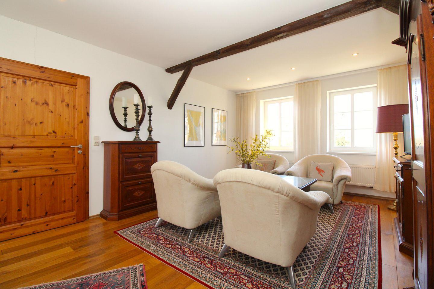 Das gemütliche Wohnzimmer verfügt über eine Sitzgruppe mit 4 bequemen Sesseln, Couchtisch, ein Sideboard sowie eine Kommode. Von hier haben Sie einen wunderschönen Blick über das gesamte Gelände des Gutshofes mit dem Teich und dem herrlichen Park.