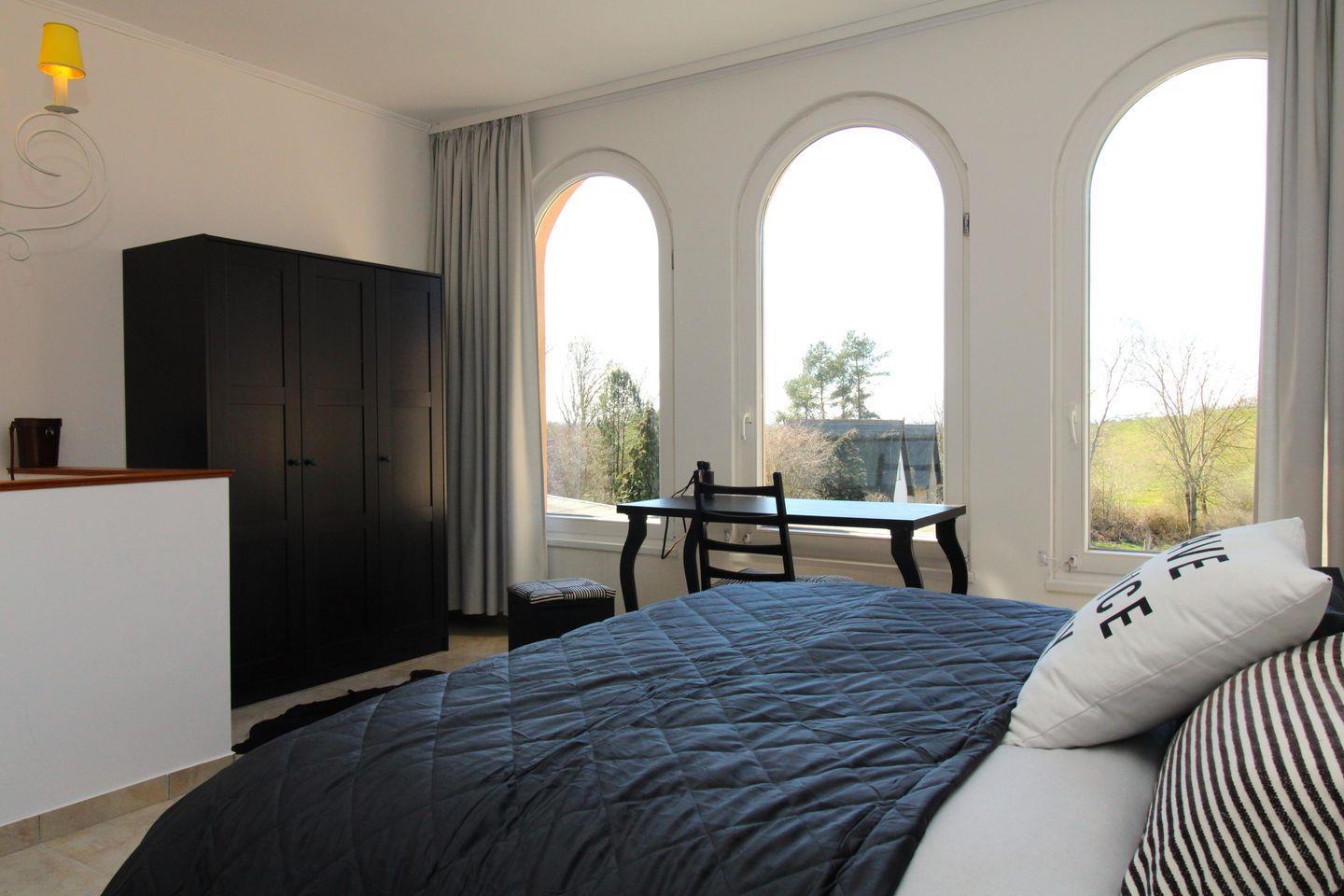 Das lichtdurchflutete zusätzliche 2. Schlafzimmer (im 2. OG der Turmsuite) verfügt ebenfalls über ein bequemes Doppelbett (Boxspringbett), Nachttische mit Lampen, einen geräumigen Kleiderschrank sowie einen kleinen Schreibtisch mit Stuhl. Durch die großen Panoramafenster dieses Raumes genießen Sie einen traumhaften und weiten Blick über die Garten- und Parkanlage des Gutshofes und die Umgebung!