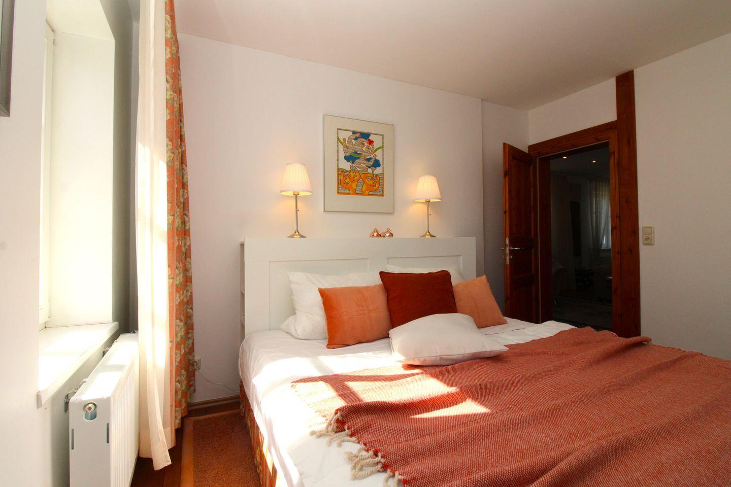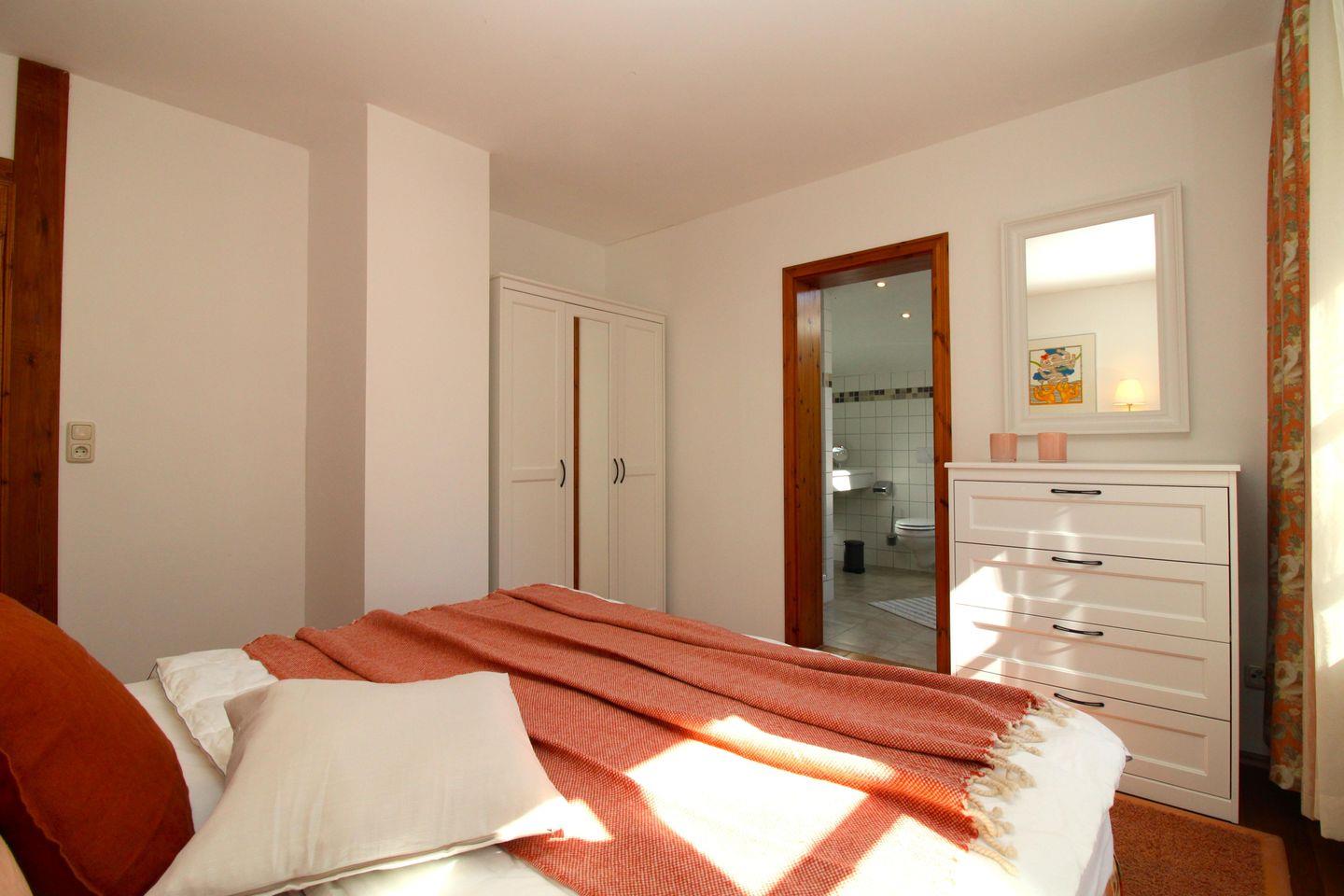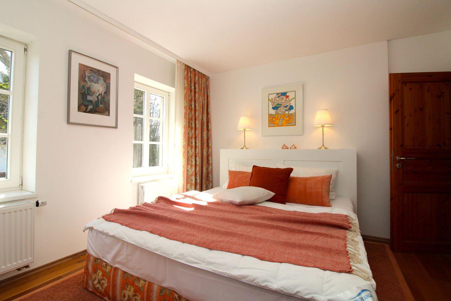 Das freundliche und geräumige 1. Schlafzimmer ist mit einem bequemen Doppelbett (Boxspringbett) mit Nachttischlampen, einem Kleiderschrank sowie einer Kommode eingerichtet.