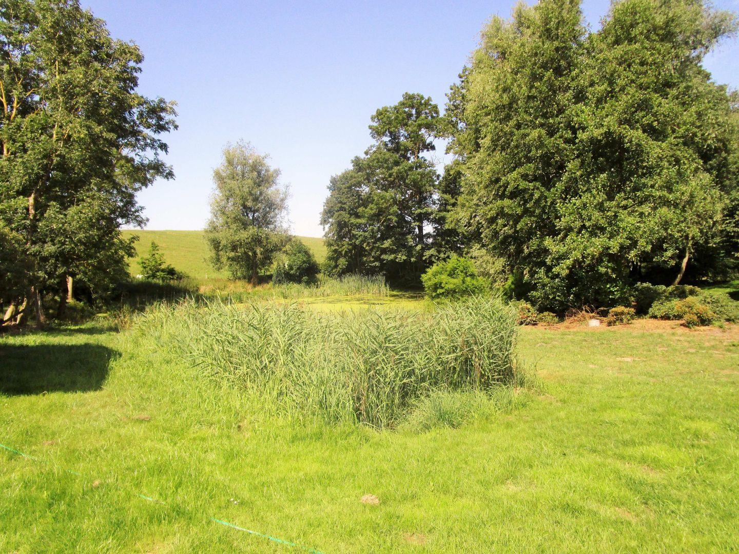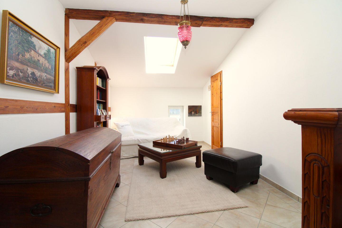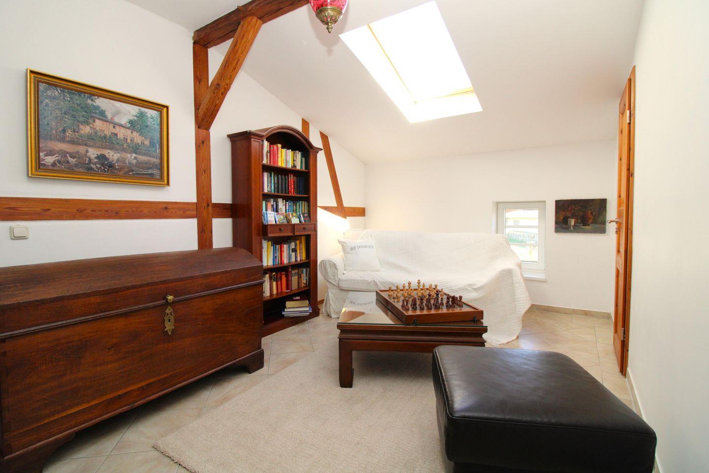 Das gemütliche Wohnzimmer verfügt über eine Sitzgruppe mit einer bequemen Couch, Sessel und Couchtisch, ein Sideboard sowie eine Kommode. Von hier haben Sie einen wunderschönen Blick über das gesamte Gelände des Gutshofes mit dem Teich und dem herrlichen Park.