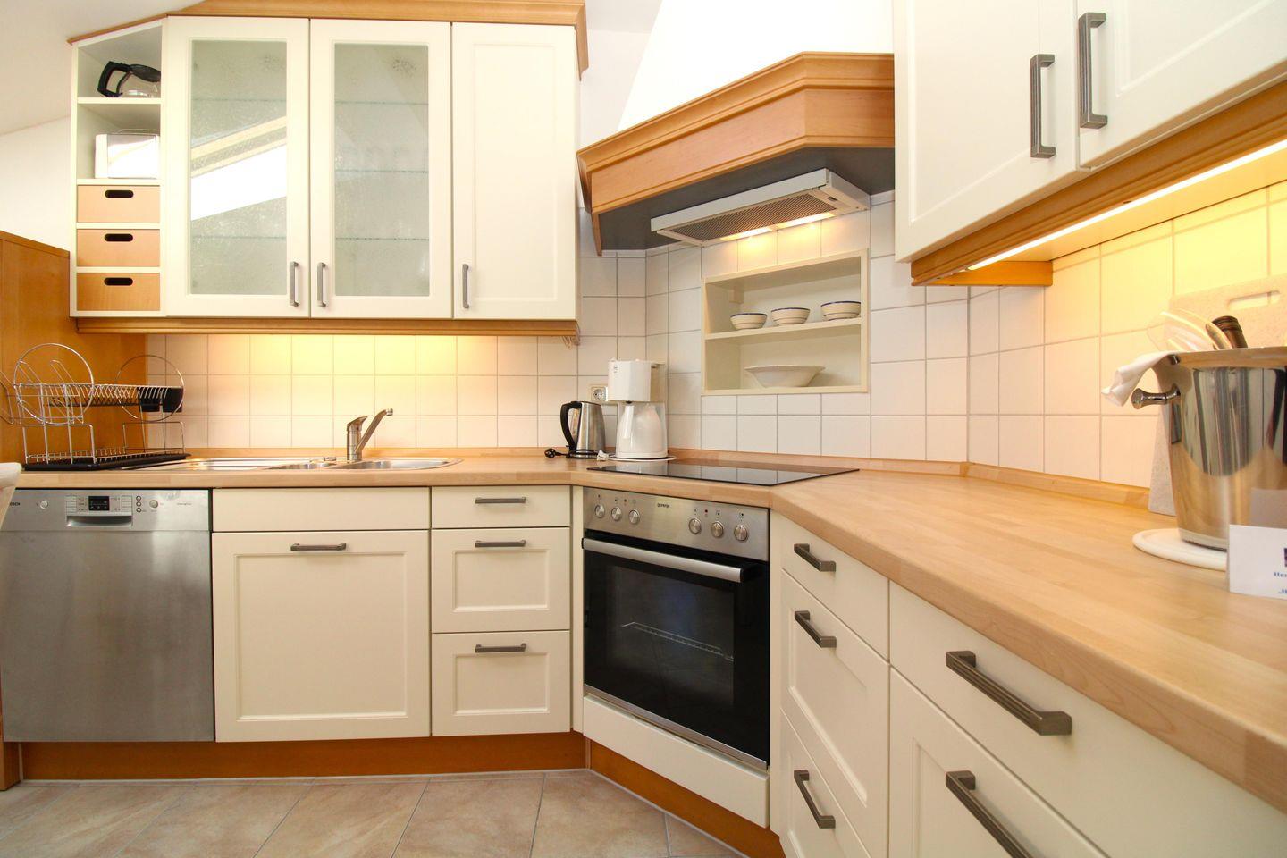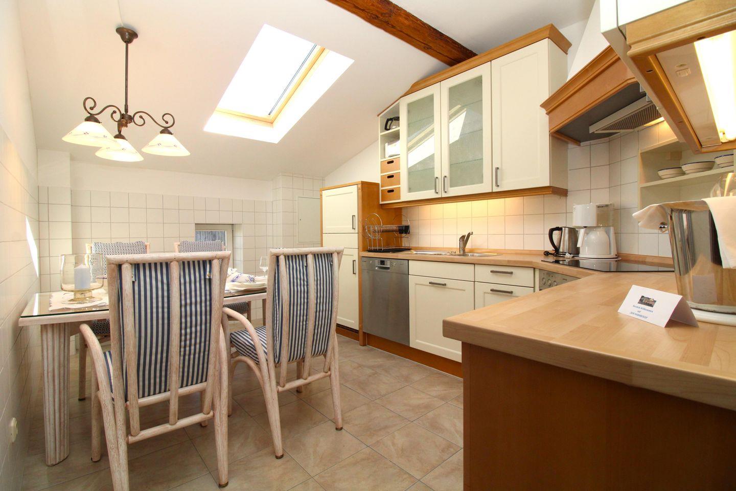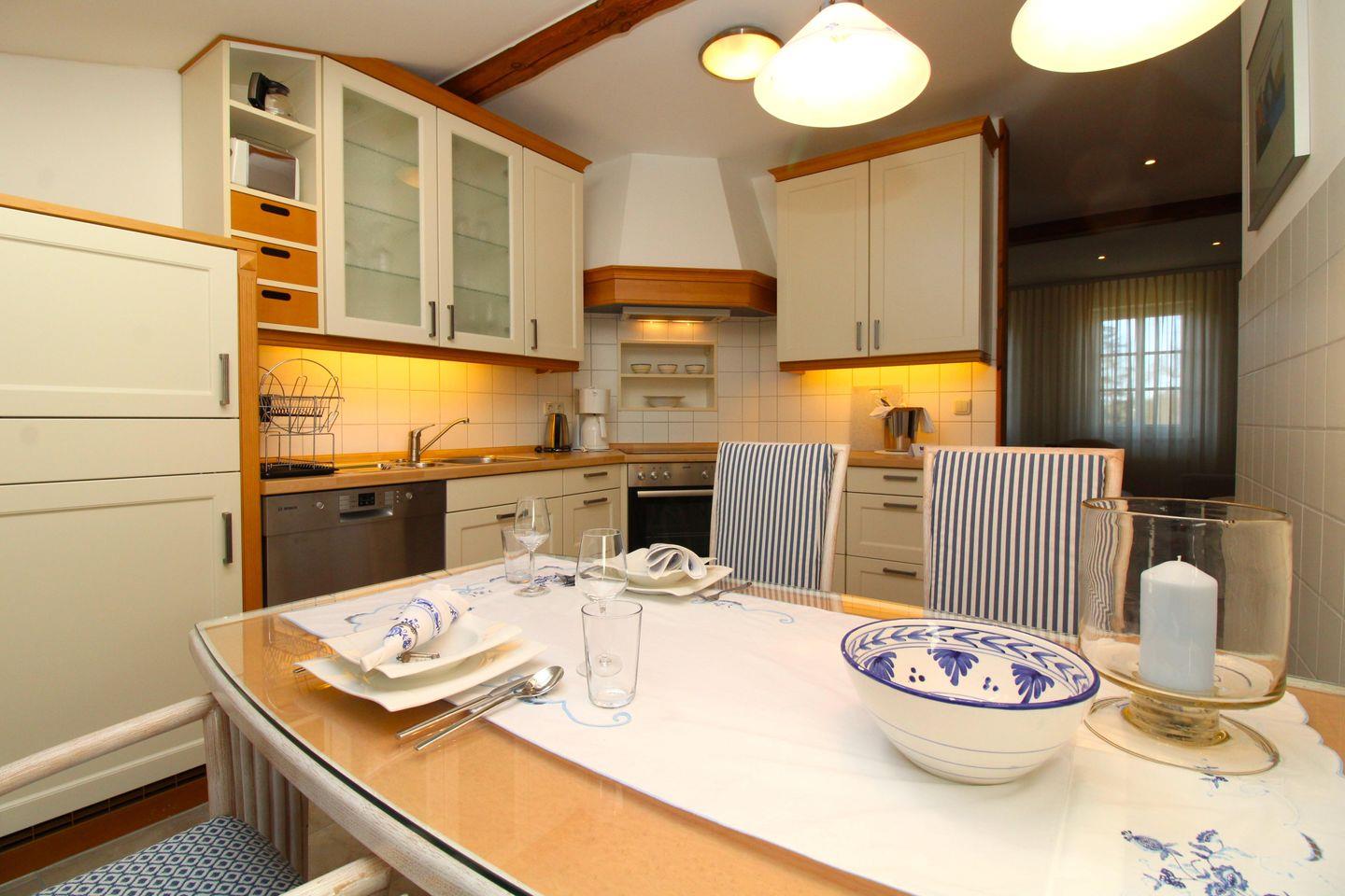 Die separate und offene Küche beinhaltet einen Esstisch mit 4 Stühlen sowie eine voll ausgestattete Einbauküche mit 4-Platten-Ceran-Kochfeld, Backofen, Dunstabzug, Kühlschrank mit Gefrierfach, Geschirrspüler, Kaffeemaschine, Wasserkocher und Toaster. Die Küche ist mit Geschirr, Gläsern, Besteck und Töpfen bestens und ausreichend ausgestattet.