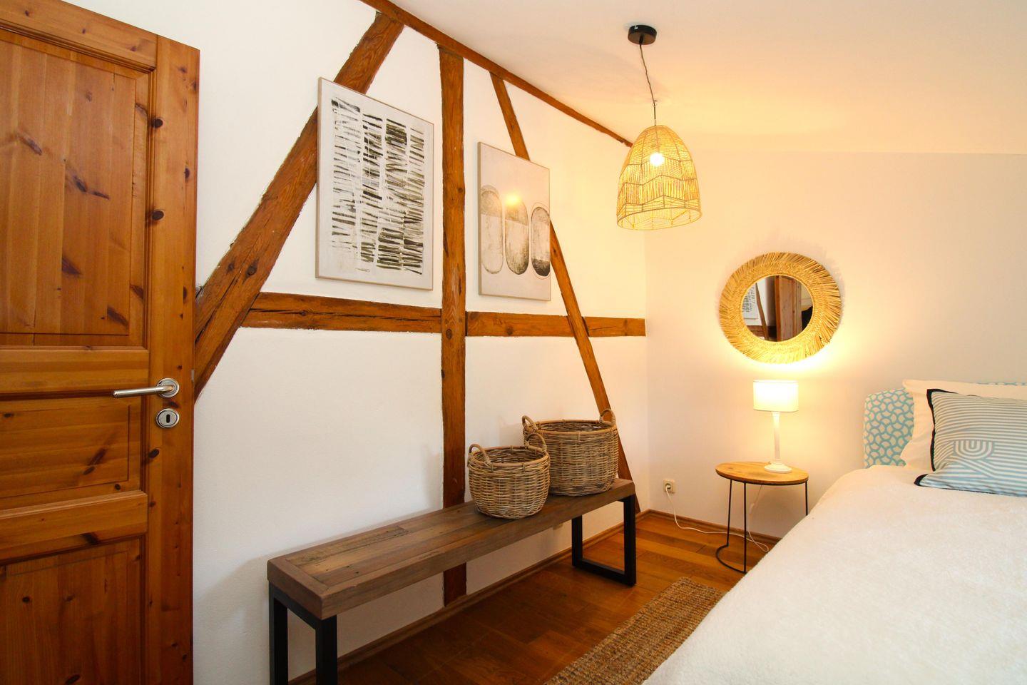 Die absolut ruhige und gemütliche 3-Zimmer-Wohnung (ca. 71 m²) im 1. Obergeschoss des Haupthauses ist komplett eingerichtet. Die Böden in den Wohnräumen sind massive Holzdielen, die Küche, das Bad und das WC sind gefliest.