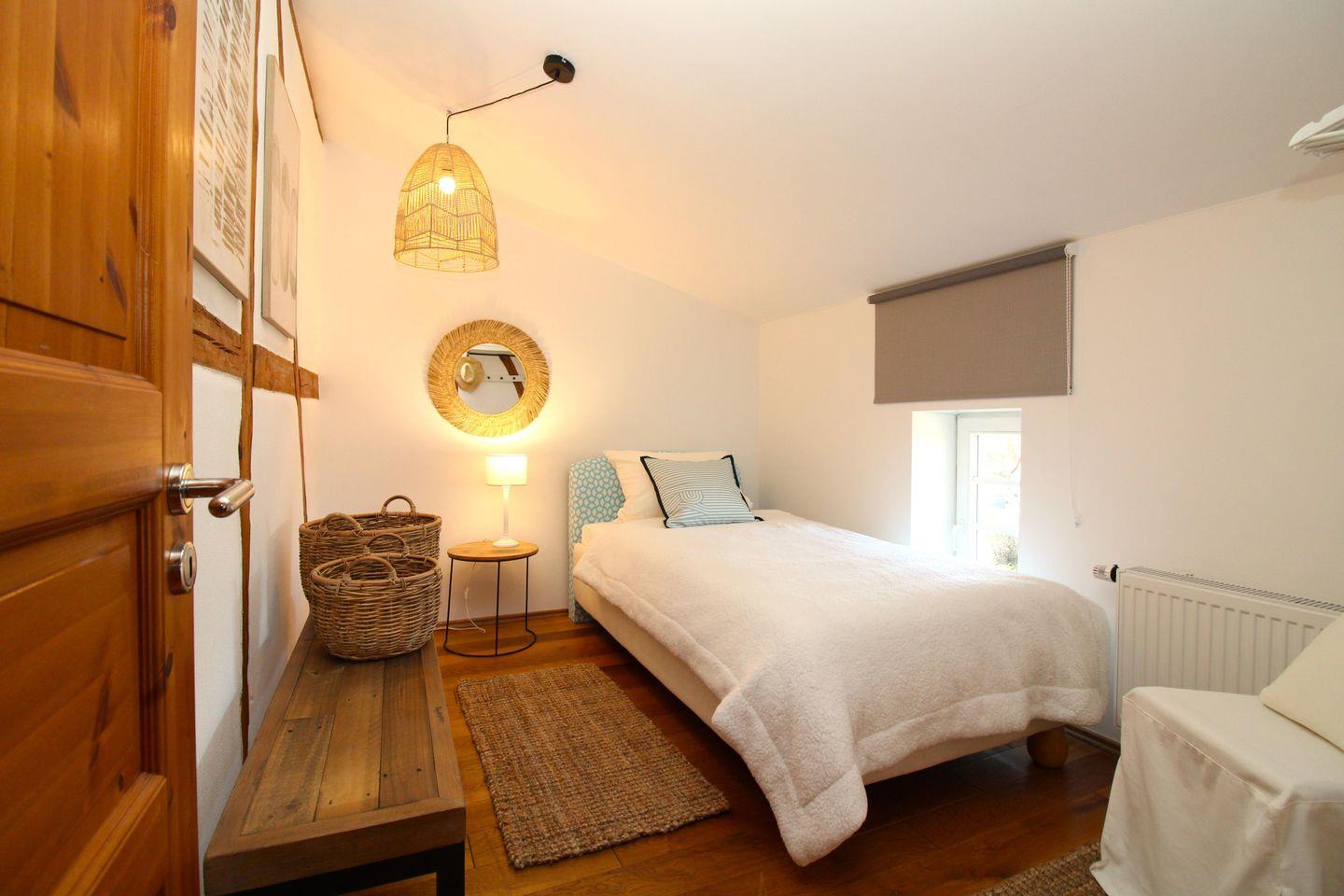 Das separate und zusätzliche 2. Schlafzimmer ist mit einem Einzelbett mit Nachttisch und Lampe, einer Sitzbank, einem Stuhl sowie einer Kleiderstange möbliert.