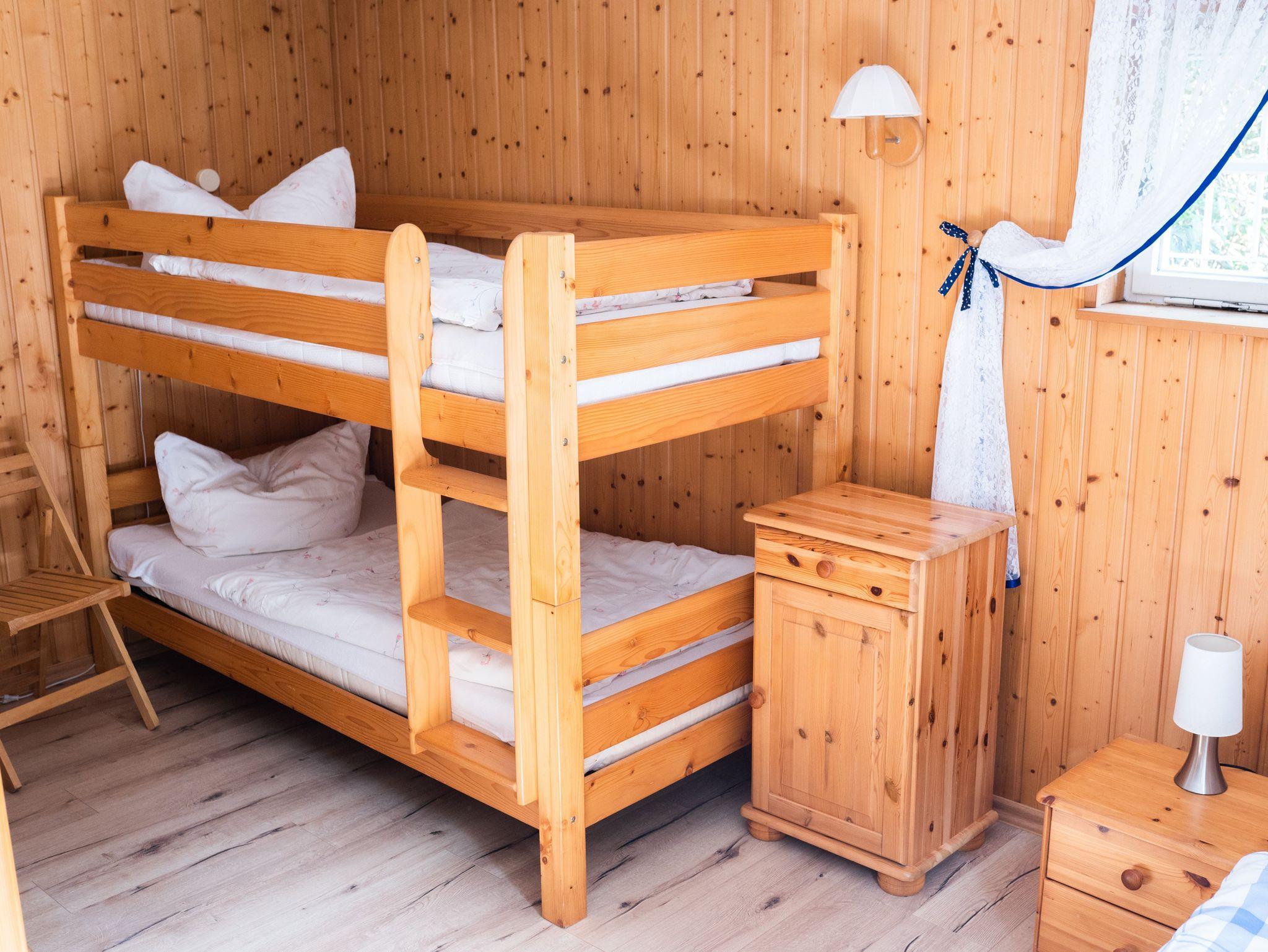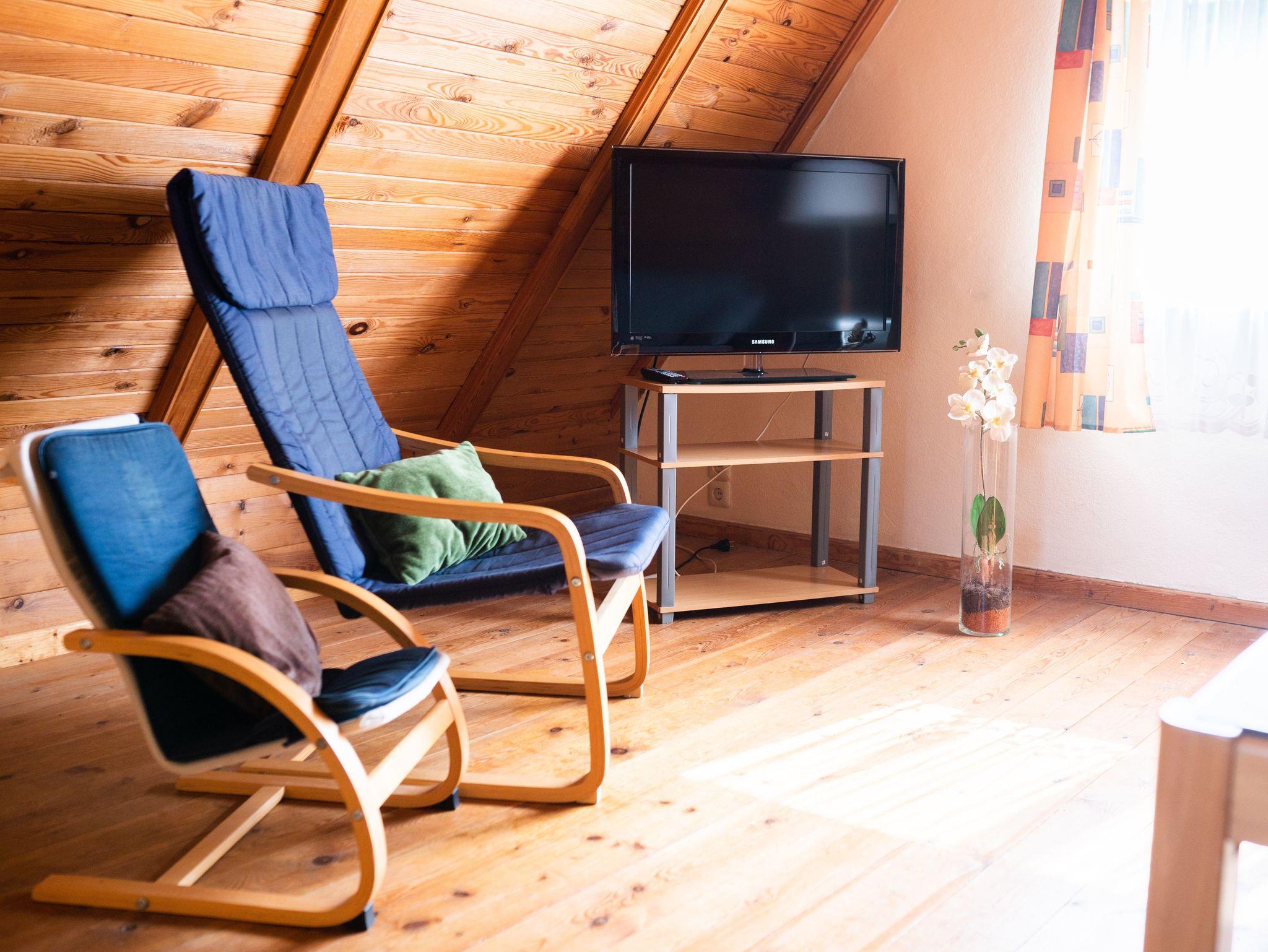 Das 110qm große Ferienhaus erstreckt sich über drei Etagen. Sie betreten das Haus über die Seitentreppe und die überdachte Terrasse. Es begrüßt Sie ein heller offener Essbereich mit einer kleinen Küchenzeile, die alle wichtigen Küchengeräte und -utensilien für Sie bereithält. Ein großer Kühlschrank mit Tiefkühlfach, ein 4-Platten-Herd, ein Geschirrspüler, Wasserkocher, Toaster und Kaffeemaschine sowie genügend Geschirr, Besteck und Kochutensilien sind vorhanden. Ein Esstisch mit 6 Stühlen sowie ein alter Kachelofen machen den Raum zu einem gemütlichen Ort der Begegnung. Von hier können Sie den Blick in den Garten schweifen lassen oder vor dem Flachbild-Fernseher gemeinsam relaxen. Auf dieser Etage befindet sich ein kleines Bad mit WC und einer kleinen Dusche, die durch einen Vorhang platzsparend in das kleine Bad integriert ist. Über eine Steintreppe gelangen Sie in die untere Etage - hier befinden sich die beiden Schlafzimmer sowie das Bad mit Dusche und WC. Das erste Schlafzimmer ist mit einem Doppelbett und einem Kleiderschrank versehen und bietet einen direkten Zugang in den Garten. Hinter dem Vorhang unter der Treppe sind für unsere kleinsten Mitreisenden ein Kinderreisebett und ein Kinderhochstuhl untergebracht. Das zweite Schlafzimmer ist mit insgesamt 4 Schlafmöglichkeiten ausgestattet: Hier befinden sich zwei längst hintereinander stehende Einzelbetten sowie ein Doppelstockbett und ein Kleiderschrank. Auch von hier können Sie den Blick in den Garten genießen. Eine weitere Holztreppe führt Sie vom Essbereich in das Dachgeschoss. Der holzverkleidete Raum ist das Herzstück des Hauses. Dort befinden sich eine ausziehbare gemütliche Schlafcouch, ein Sessel und ein Kindersessel sowie ein weiteres TV-Gerät. Dieser Wohnraum, der für gemeinsame Spiele- und Familienabende ideal geeignet ist, kann auch als Schlafraum genutzt werden. Im Flurbereich am Eingang vor dem Bad befindet sich eine kleine Waschmaschine, die Sie gerne nutzen können. Auf der windgeschützten überdachten Terrasse können Sie in den warmen Monaten Ihre Mahlzeiten genießen - der großzügige Esstisch mit 6 Stühlen bietet genügend Platz. Weiterhin stehen Ihnen zwei Liegestühle zur Verfügung, die Sie mit in den garten nehmen können.