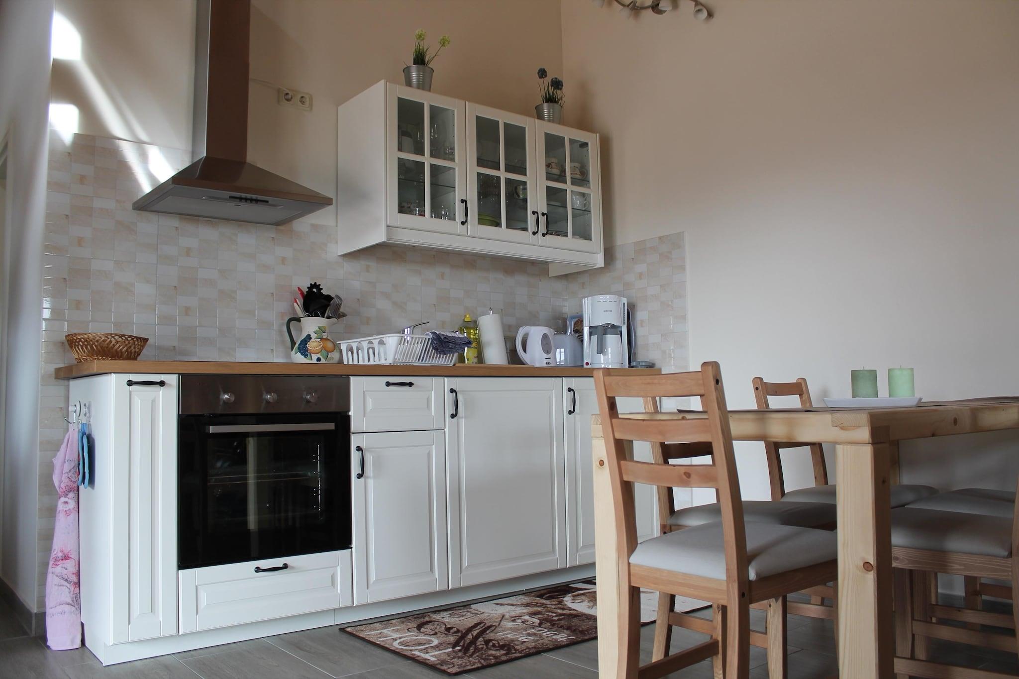 Entfliehen Sie mit Familie oder Freunden dem Alltag auf dem Land in diesem gemütlichen Ferienhaus auf einem großzügigen Bauernhofgrundstück in Brusow, nahe Kröpelin. Umgeben von Natur ist es der perfekte Ort zum Entspannen und Genießen des ruhigen Landlebens. Das Haus bietet ideal Platz für vier Gäste und ist ein gemütlicher und rustikaler Rückzugsort. Das Erdgeschoss verfügt über einen Wohnbereich mit offener Küche und ein Badezimmer mit Dusche und WC. Die Schlafgalerie befindet sich im Obergeschoss unter dem Dach und ist über eine steile Treppe erreichbar. Bitte beachten Sie, dass sie möglicherweise nicht für Kleinkinder geeignet ist. Eine überdachte Terrasse lädt zum Entspannen ein, und alle Gäste können den Grill- und Kaminbereich im Freien für entspannte Mahlzeiten nutzen. Der Hof beherbergt freundliche Tiere wie Pferde, Enten, Hühner, Kaninchen, Tauben und Hunde und bietet so ein echtes Landerlebnis. Für Tagesausflüge bieten sich die Ostseebäder Kühlungsborn und Rerik an, die nur 15 Autominuten entfernt sind und breite Sandstrände, Seebrücken und belebte Promenaden zum Erkunden einladen.