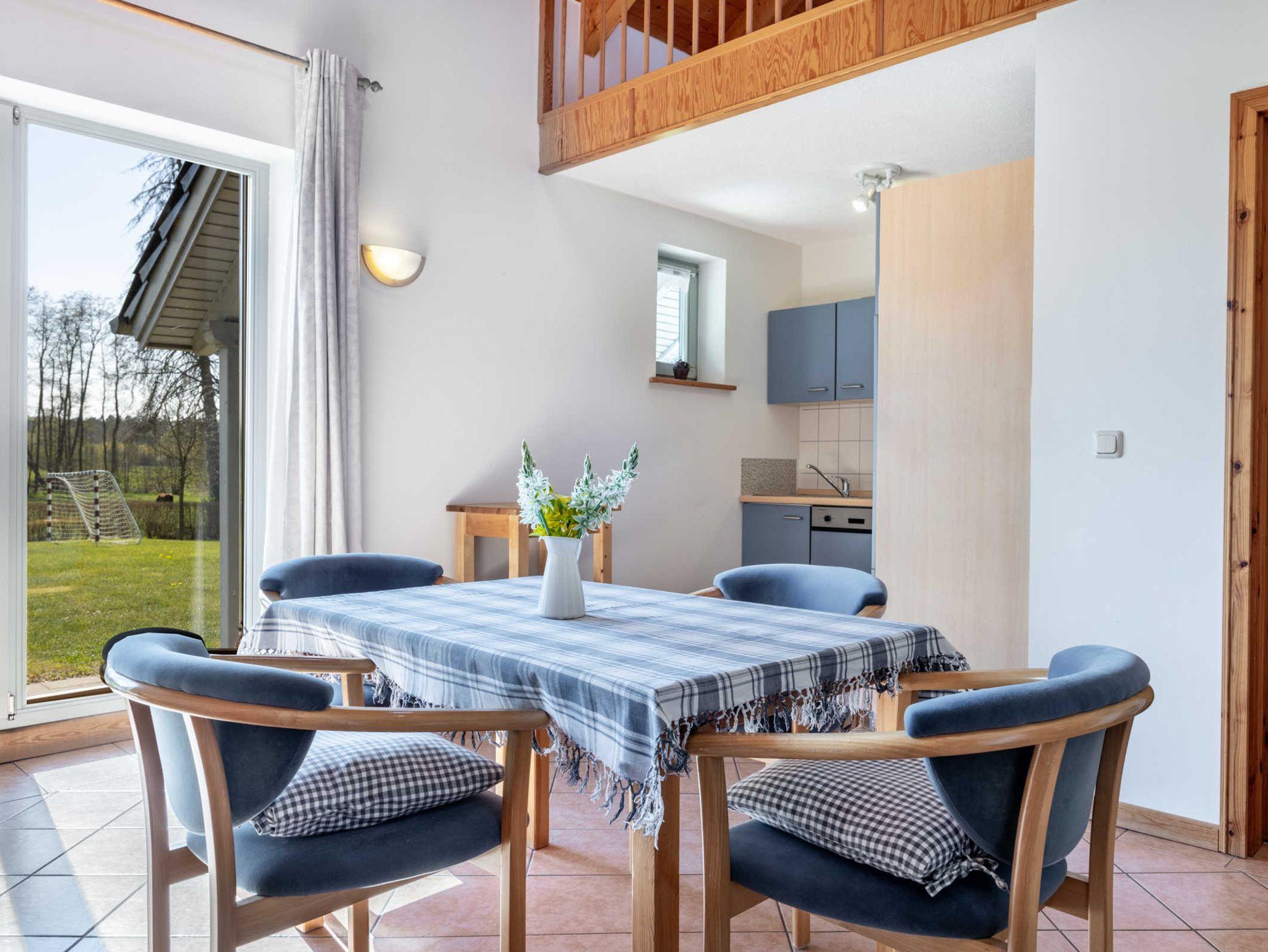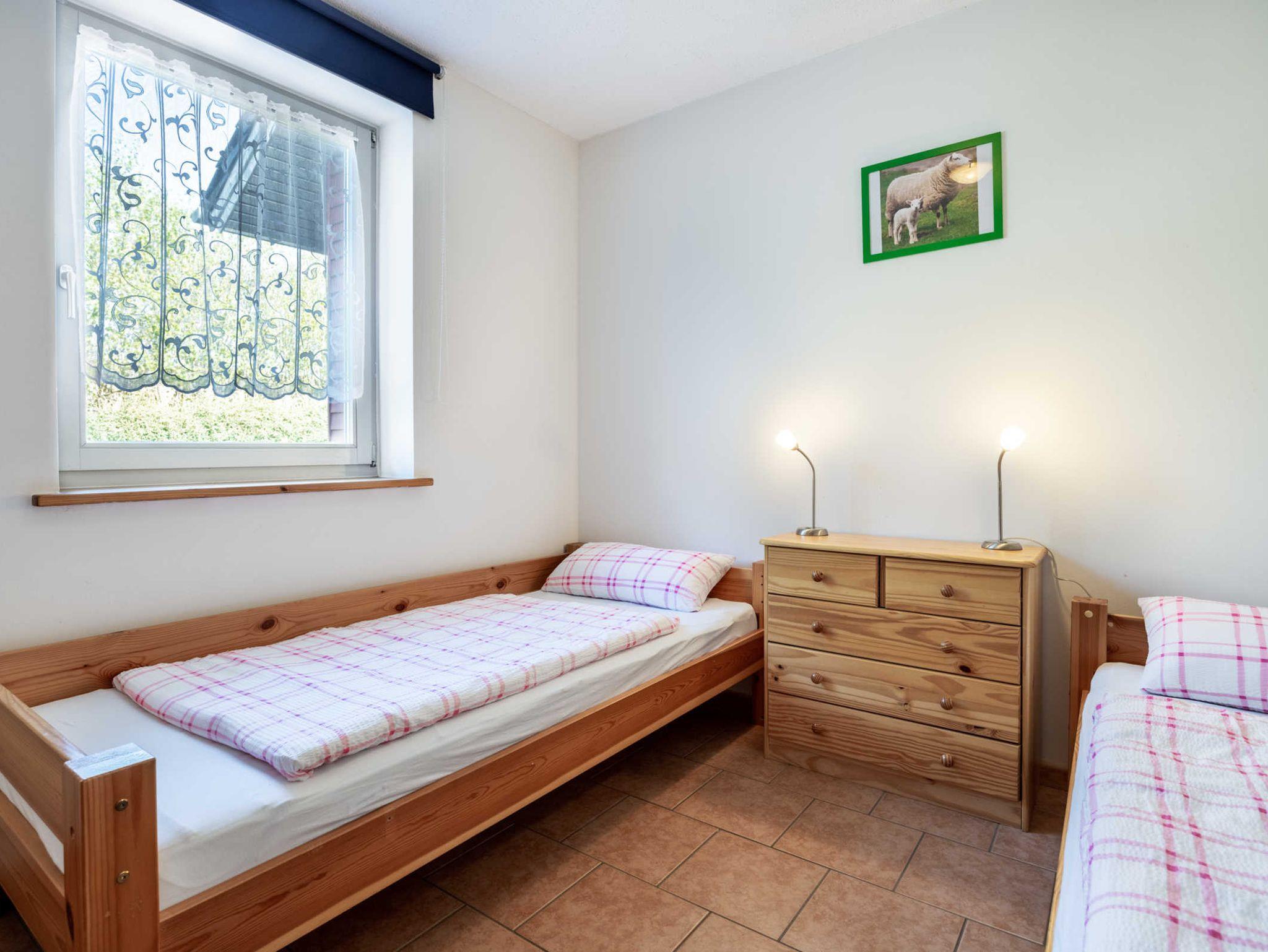 Schlafzimmer 1 mit 2 Einzelbetten, Schlafzimmer 2 mit 1 Einzelbett und 1 stabilen Kinderbettchen. Bad mit Dusche und WC. Gemütlicher Wohn- Essbereich mit offener Küche und einem herrlichen Blick in den Garten und die freie Natur. Die Küche ist sehr umfangreich ausgestattet mit Kühlschrank und Gefrierfach, 4- Platten- Herd, Backofen, Geschirrspüler, Waschmaschine, Wasserkocher, Kaffeemaschine. Esstisch für 6 Personen und Sofaecke mit TV.