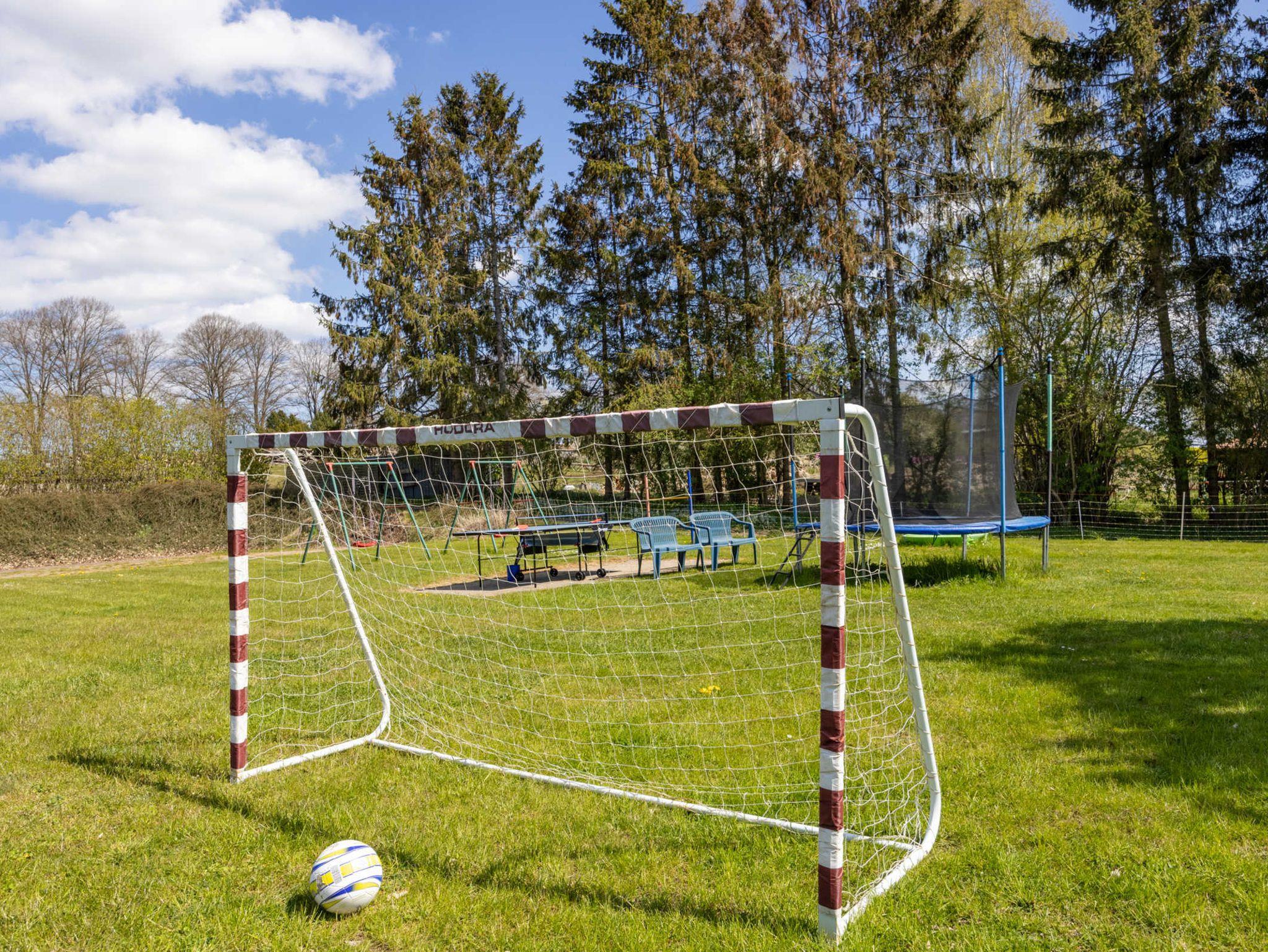 Am Haus: Terrasse, Terrassenmöbel, Sonnenstühle, Spielplatz mit Trampolin, Fußballtoren, Tischtennisplatte, 2 Schaukeln, Sandkasten und Outdoorspielen.