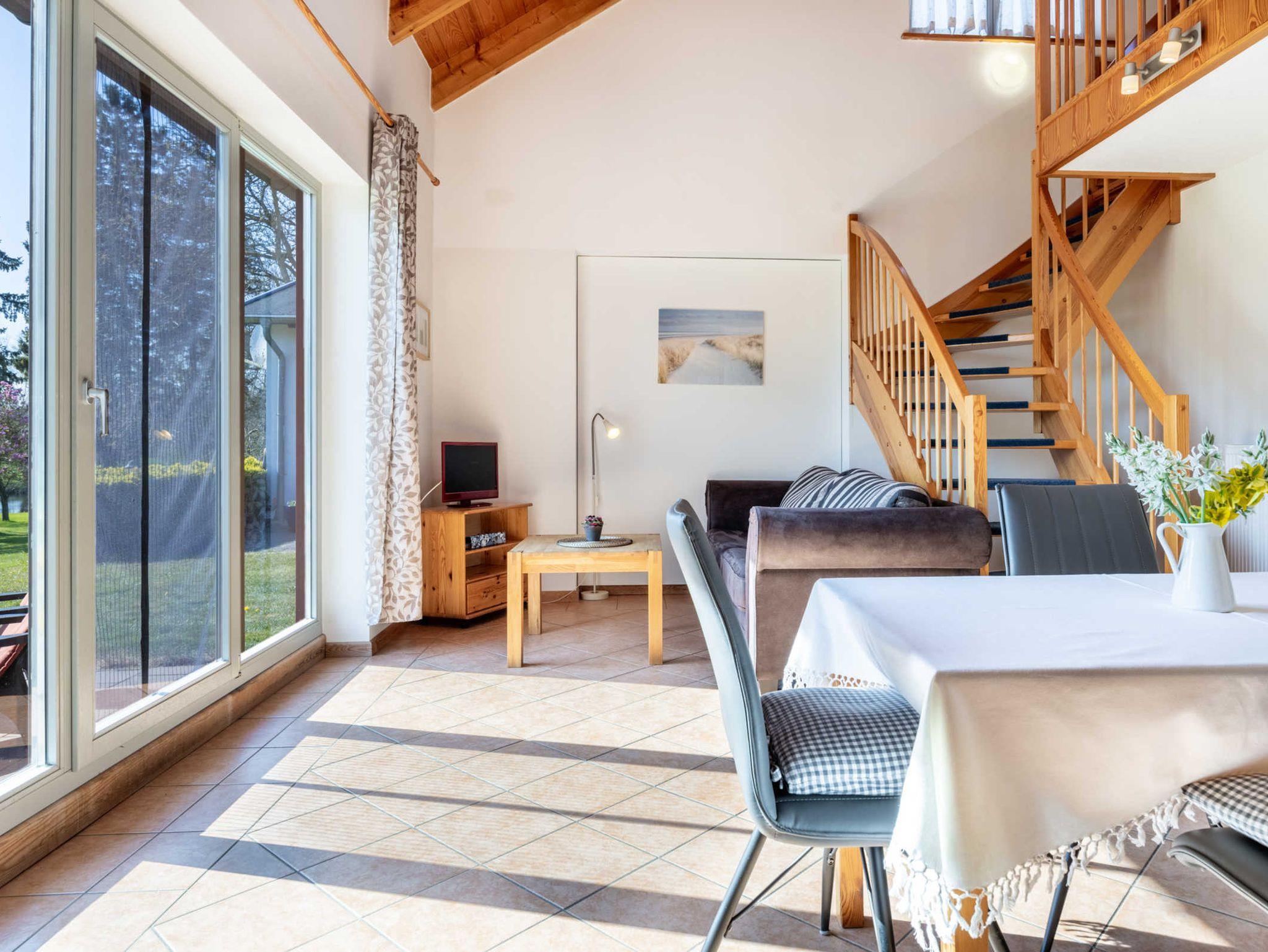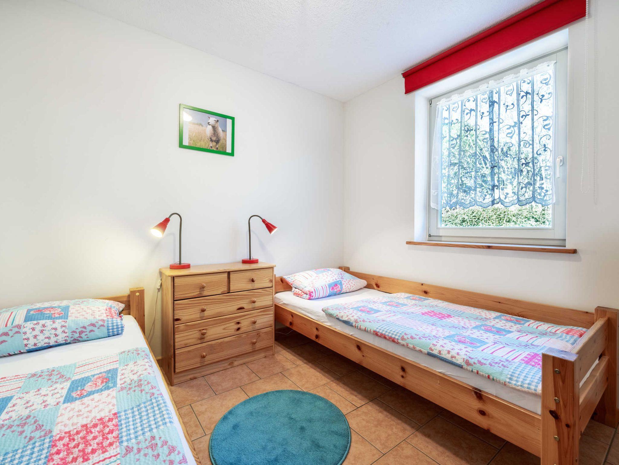 Schlafzimmer 1 mit 2 Einzelbetten, Schlafzimmer 2 mit 1 Einzelbett und 1 stabilen Kinderbettchen. Bad mit Dusche und WC. Gemütlicher Wohn- Essbereich mit offener Küche und einem herrlichen Blick in den Garten und die freie Natur. Die Küche ist sehr umfangreich ausgestattet mit Kühlschrank und Gefrierfach, 4- Platten- Herd, Backofen, Geschirrspüler, Waschmaschine, Wasserkocher, Kaffeemaschine. Esstisch für 6 Personen und Sofaecke mit TV.