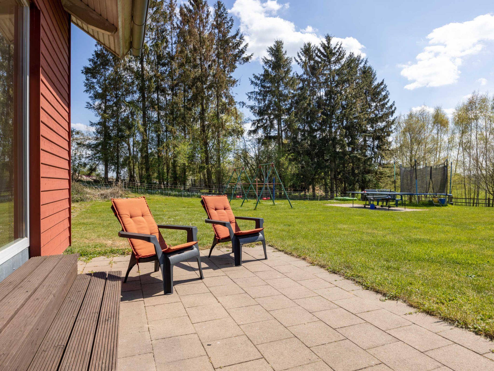 Am Haus: Terrasse, Terrassenmöbel, Sonnenstühle, Spielplatz mit Trampolin, Fußballtoren, Tischtennisplatte, 2 Schaukeln, Sandkasten und Outdoorspielen.
