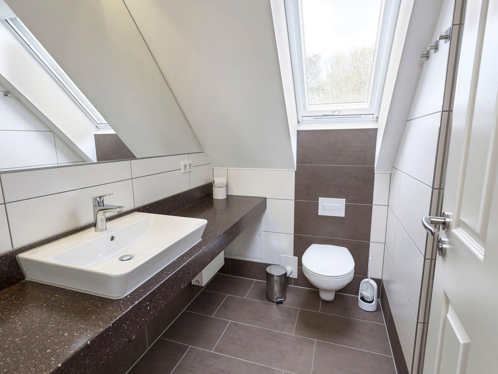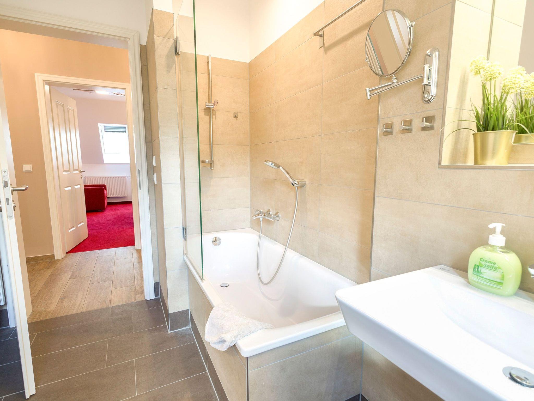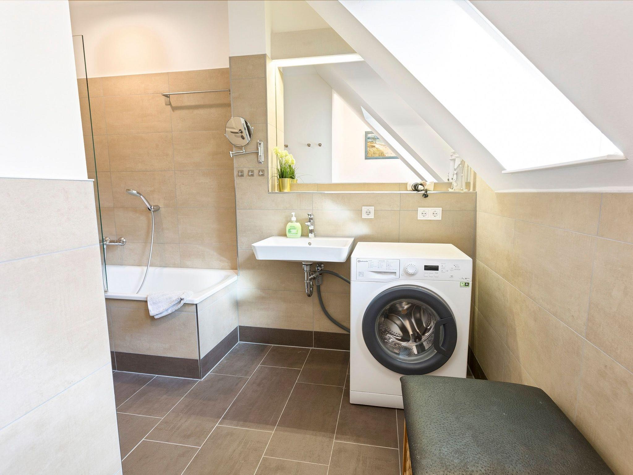 Ein Badezimmer ist mit Badewanne, Waschmaschine, Föhn und WC ausgestattet, die anderen beiden Bäder mit Dusche, Föhn und WC.