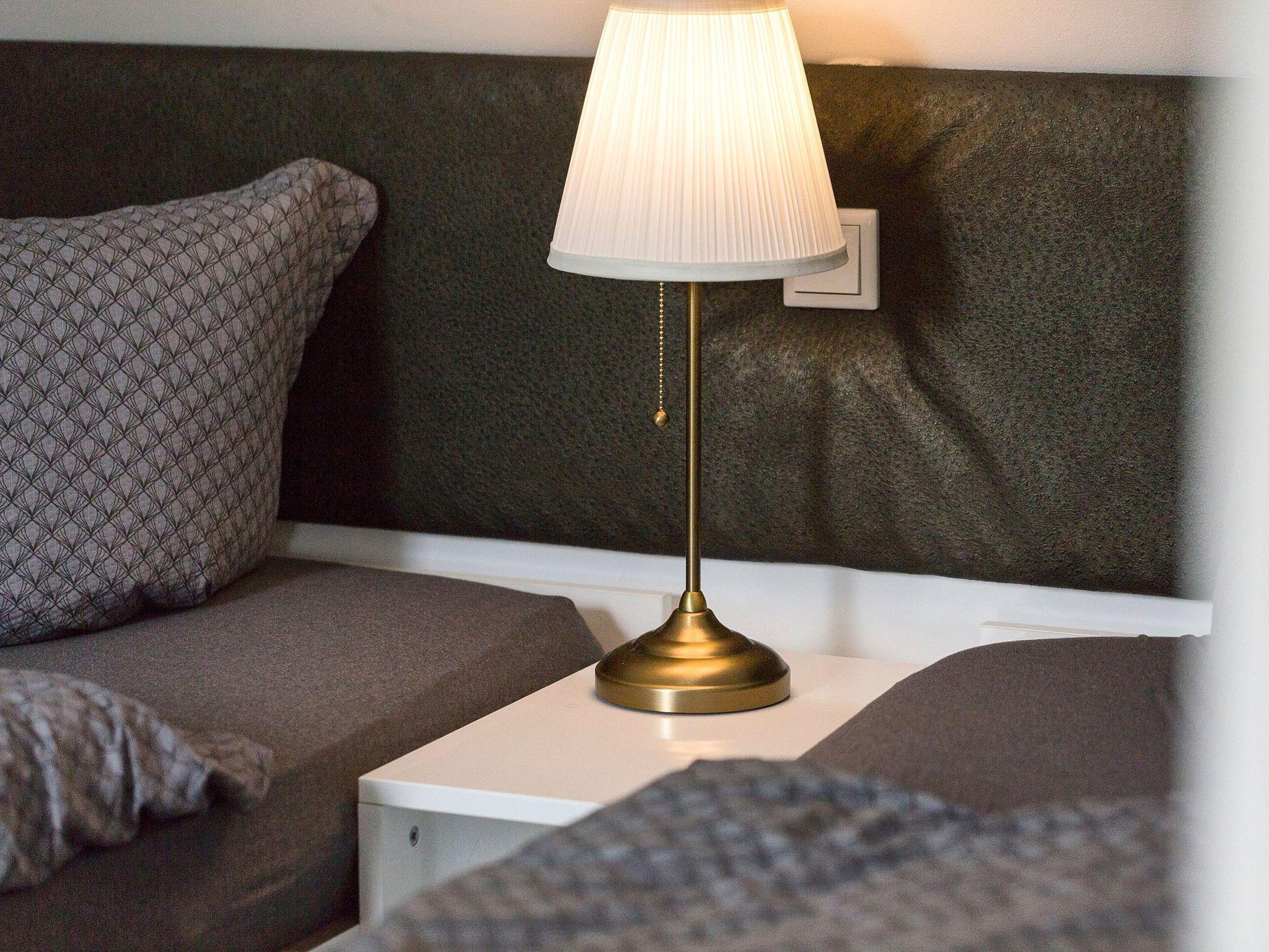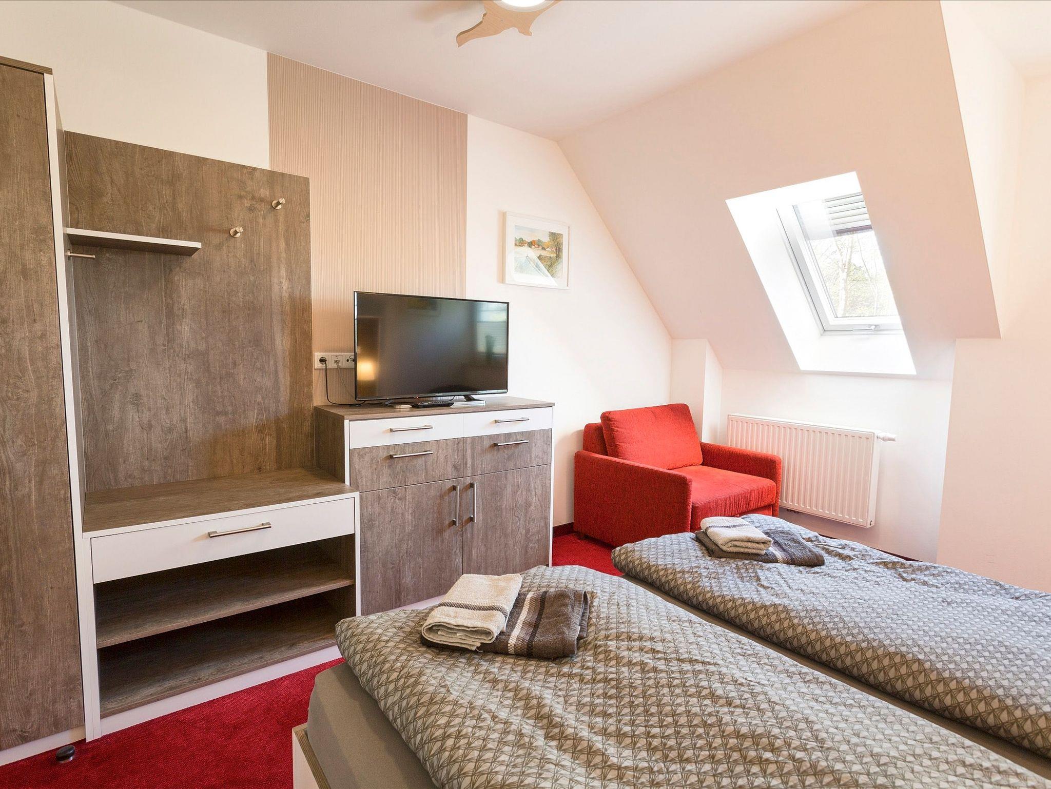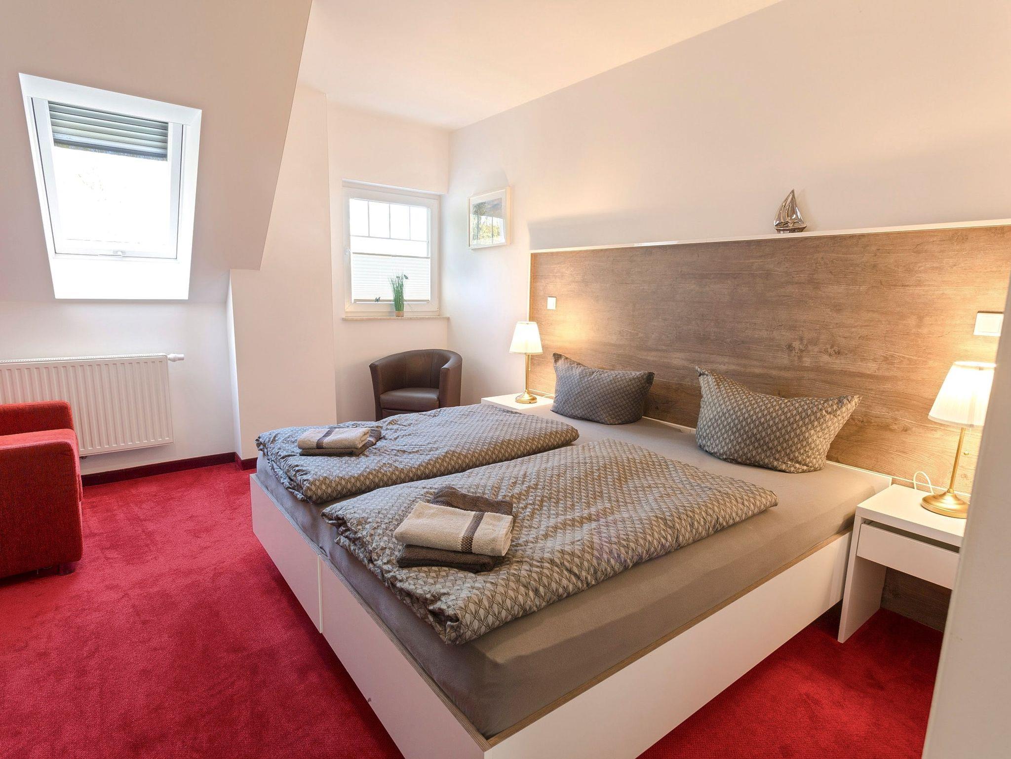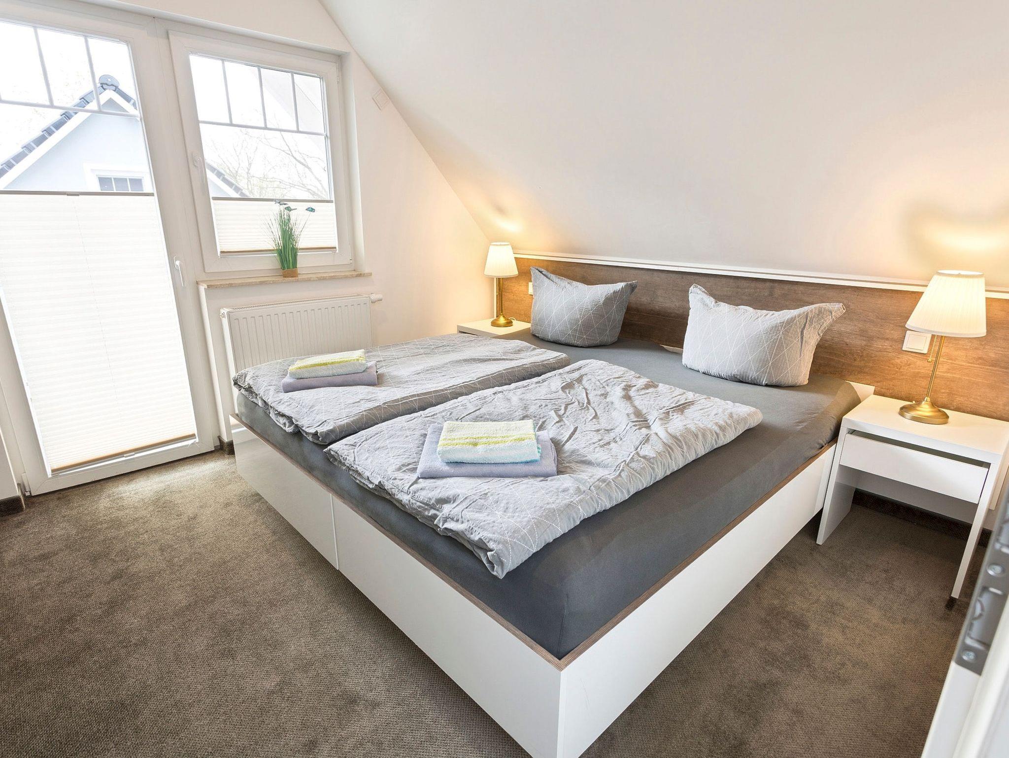 3 separaten Schlafzimmer sind mit Doppelbett (180x200; getrennte Matratzen, einzeln stellbar), Smart-TV, Kleiderschrank und Sessel ausgestattet. Das Schlafzimmer im Dachgeschoss hat zusätzlich einen eigenen Balkon. Die Fenster sind mit elektrischen Außenjalousien verdunkelbar und mit Insektenschutz versehen.