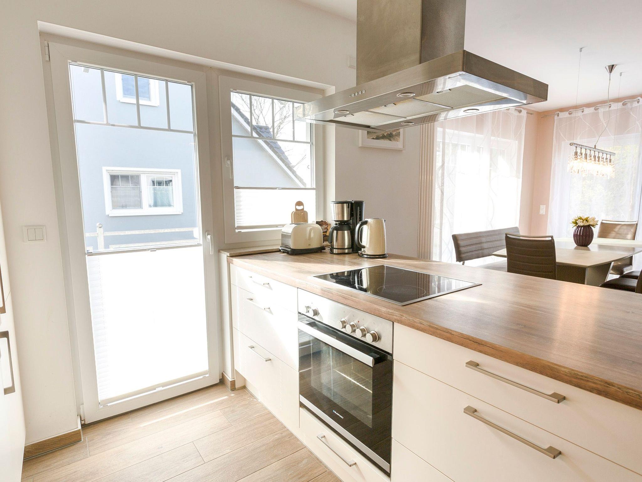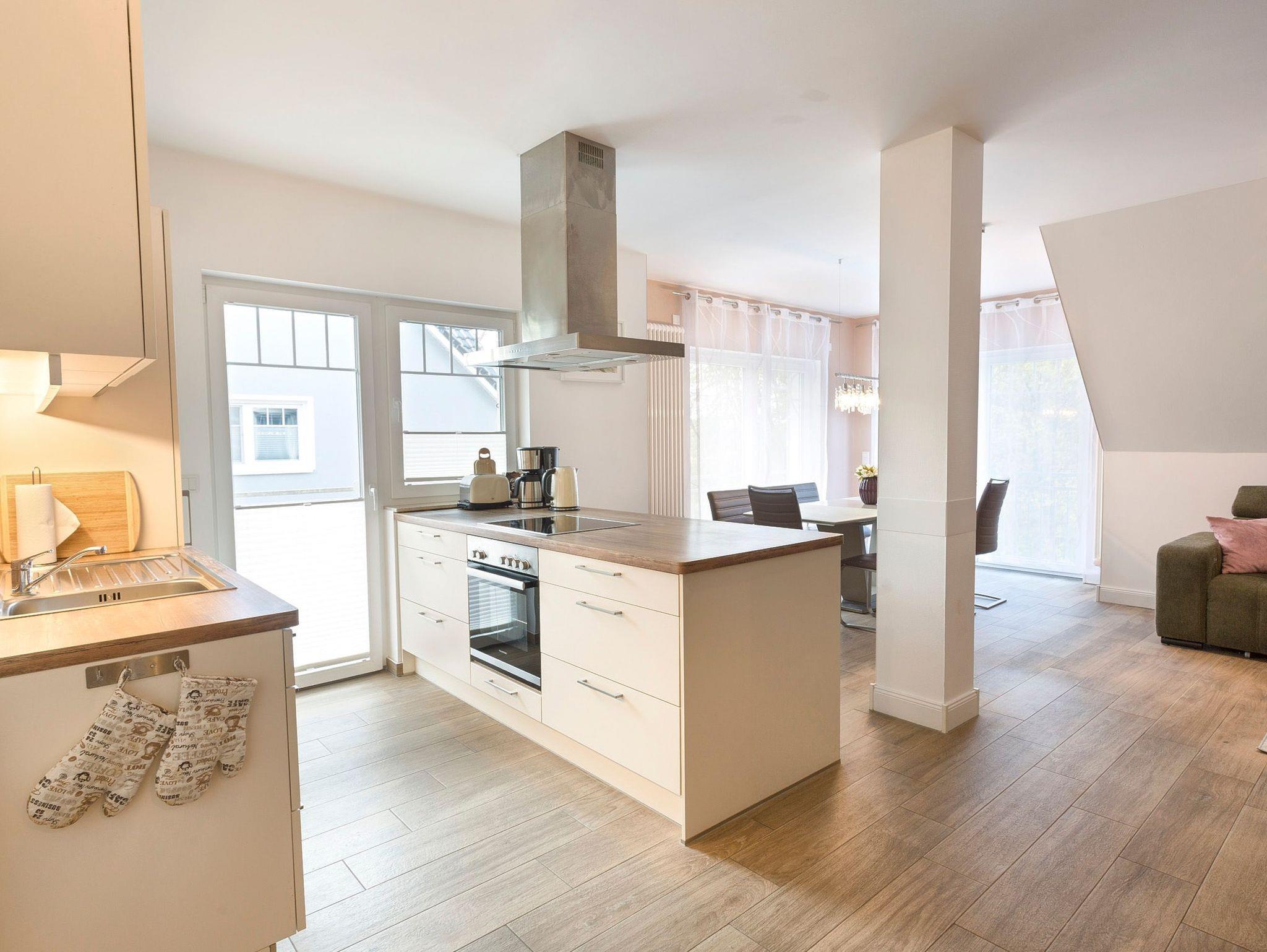 Im großzügigen Wohnbereich erwarten Sie eine gemütliche Wohnlandschaft, Kamin, Smart-TV, eine offen gestaltete Küche sowie ein großer Esstisch. Die Küche ist umfangreich ausgestattet mit Kühlschrank, Gefrierschrank, Ceran-Kochfeld, Backofen, Spülmaschine, Mikrowelle, Kaffeemaschine, Wasserkocher, Toaster und alle den kleinen Dingen des täglichen Bedarfs. Weiterhin befindet sich an den Küchenbereich angeschlossen ein kleiner Balkon.