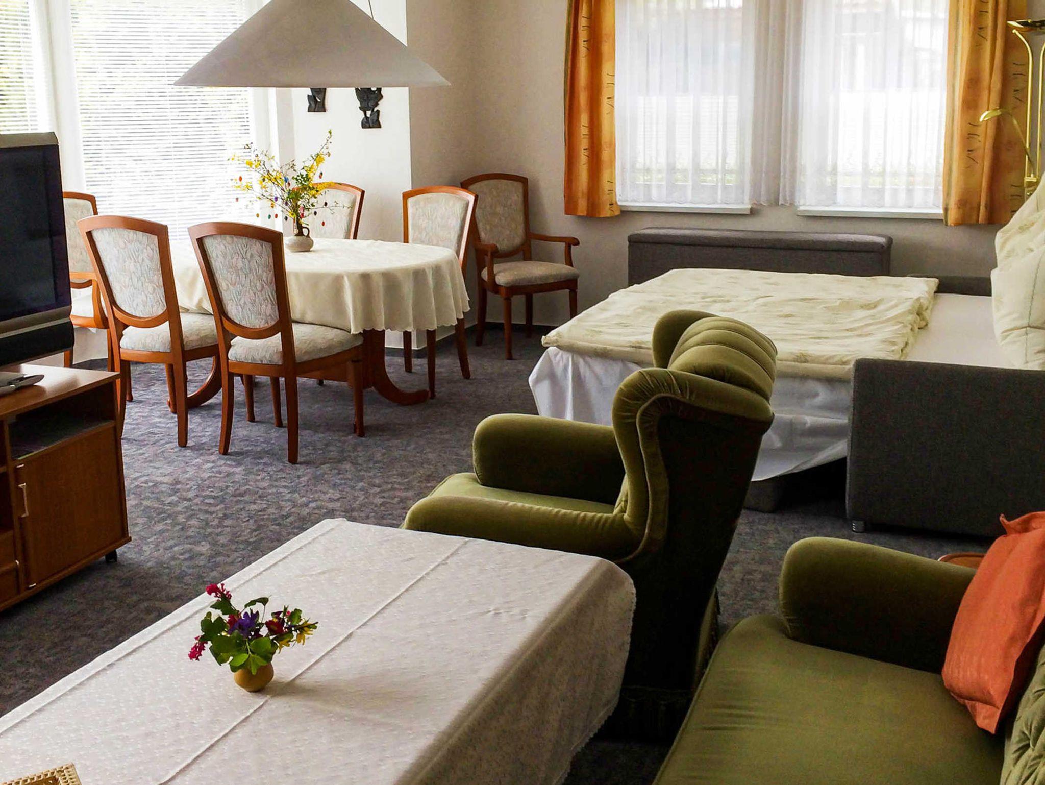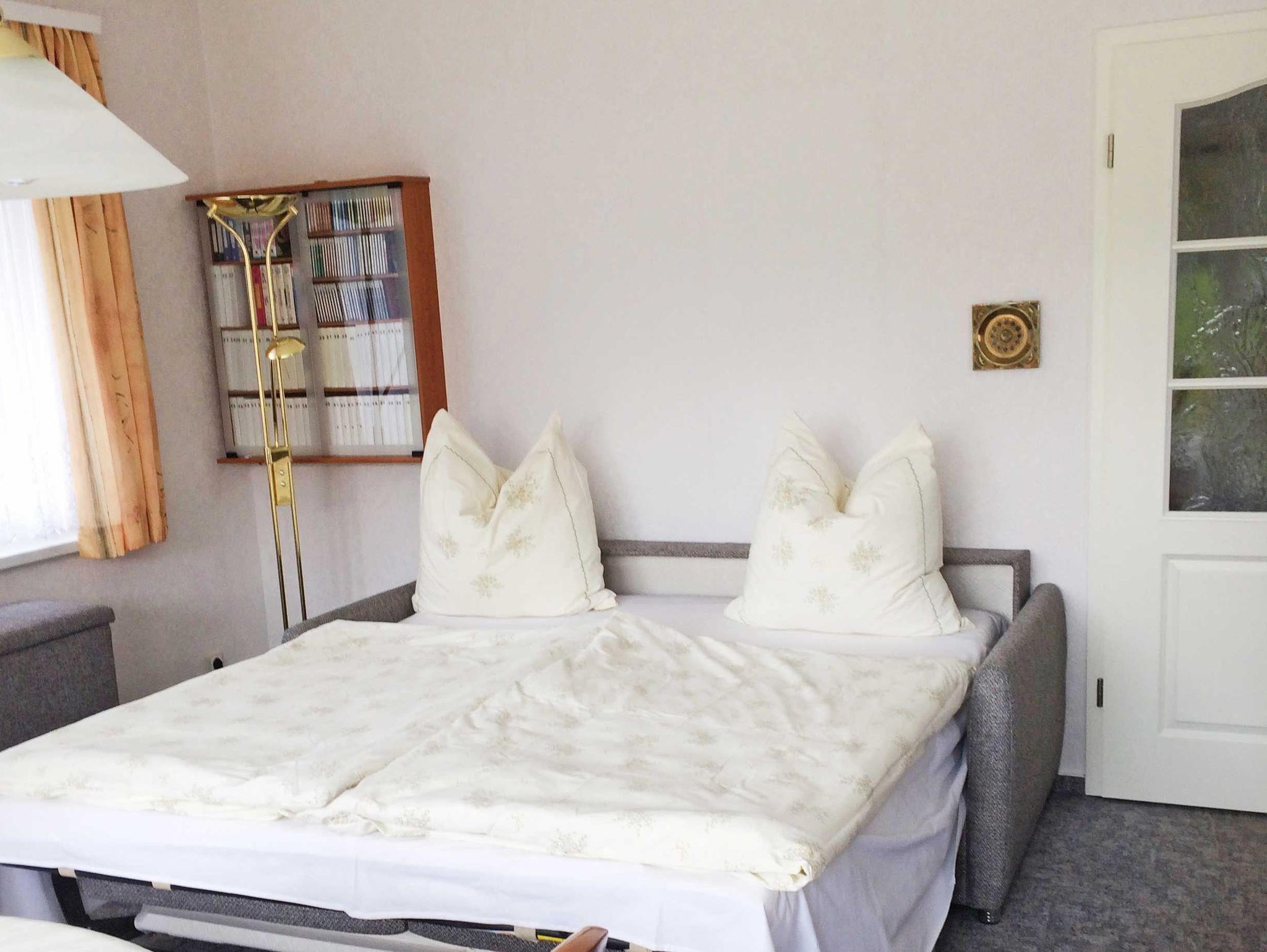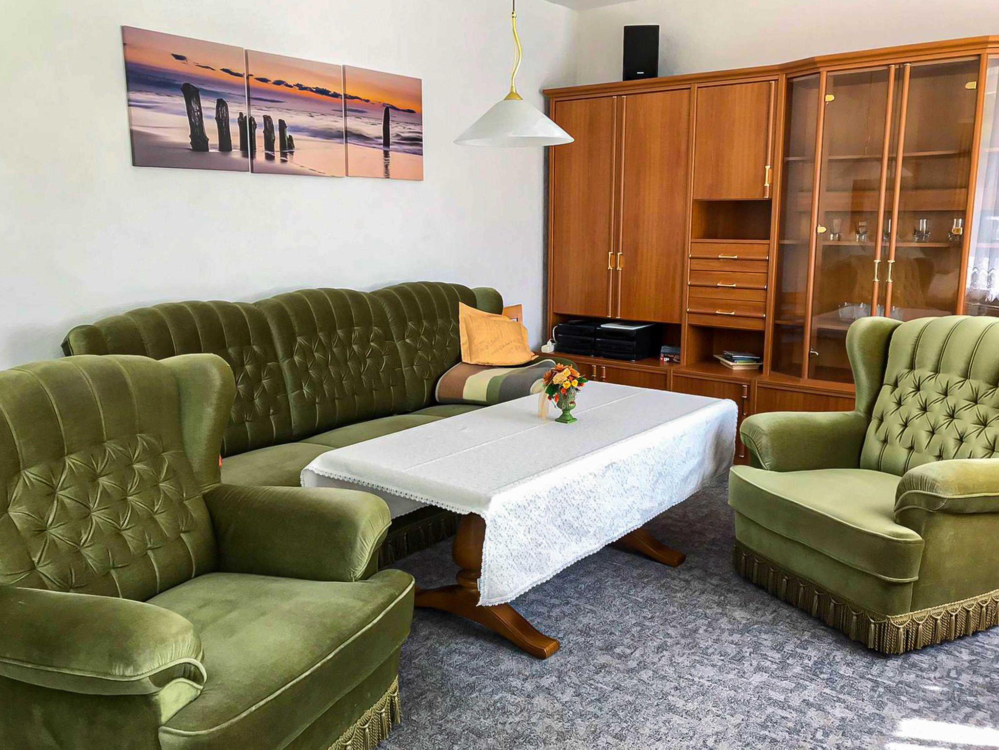 Die 75m² Ferienwohnung im Erdgeschoss verfügt über einen Wohnzimmer mit einer Wohnlandschaft, Schlafcouch (ca. 160x200cm Liegefläche), TV und einen Esstisch mit Blick in den Garten. Im separaten Schlafzimmer befinden sich ein Doppelbett (180x200cm, getrennte Matratzen), ein Kleiderschrank und eine Sitzgelegenheit. Eine zusätzliche Aufbettung kann auf einem Klappbett erfolgen.