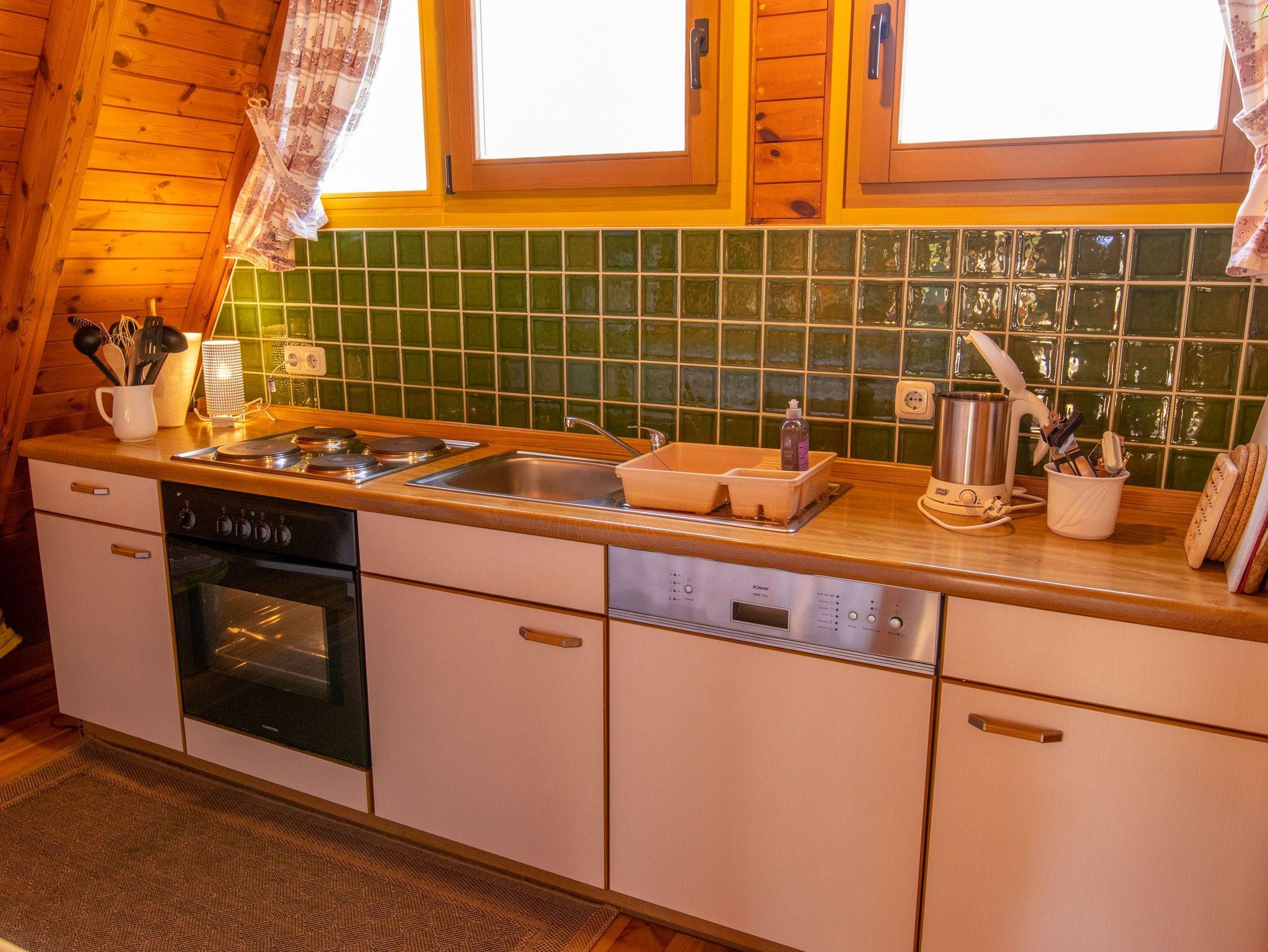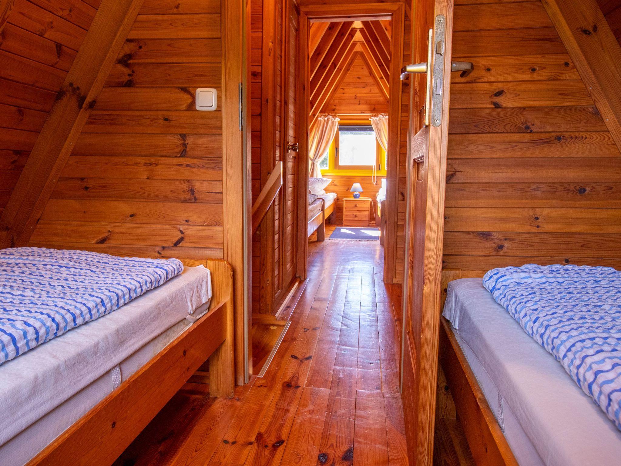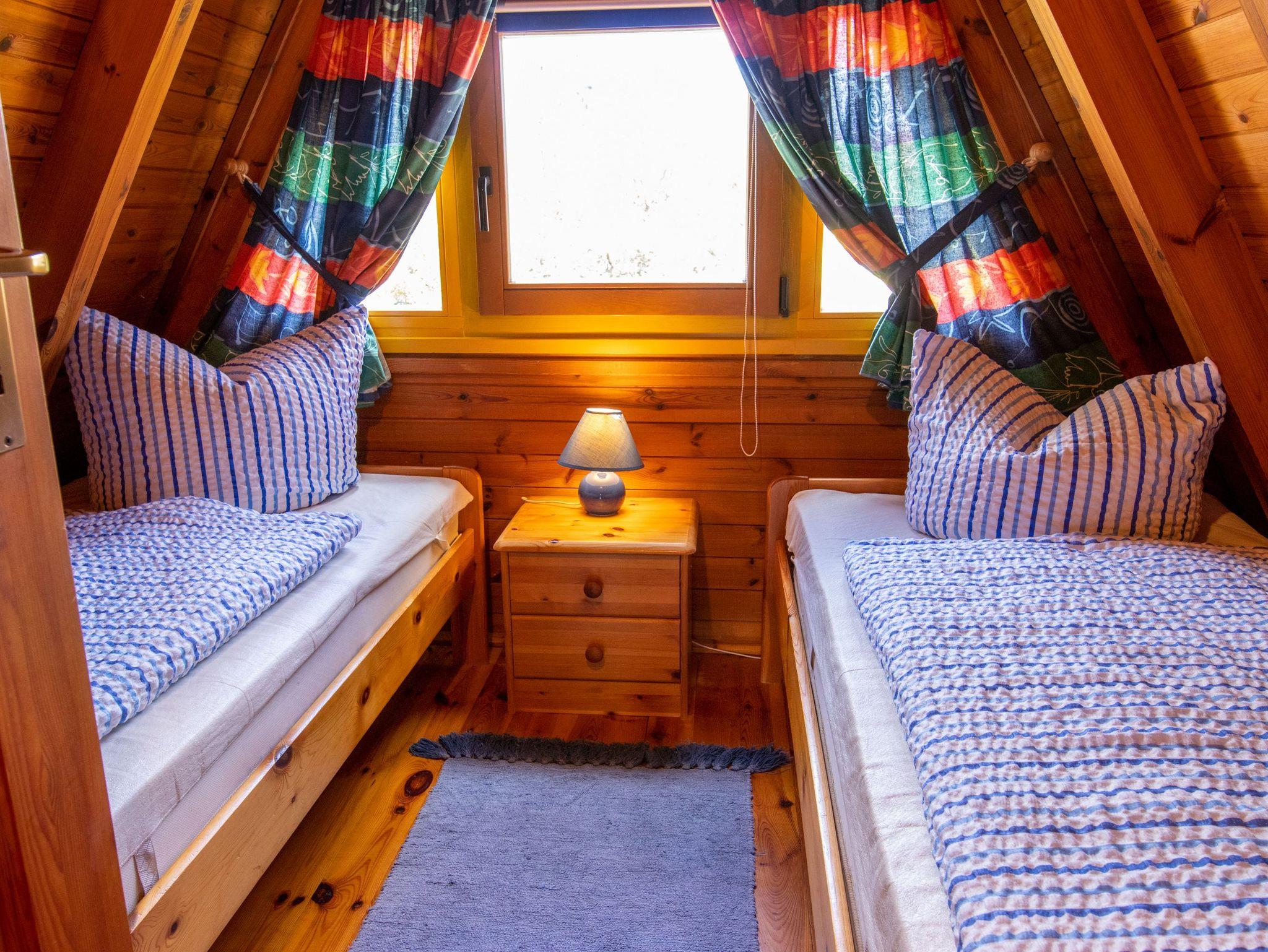 Im Erdgeschoss findest du ein geräumiges Wohnzimmer mit TV, einer gemütlichen Sitzecke und einem Esstisch. Die angrenzende offene Küche ist vollständig ausgestattet, inklusive Kühlschrank, Geschirrspüler und Kaffeemaschine. Außerdem gibt es im Erdgeschoss ein Badezimmer mit Dusche, WC und einer Waschmaschine. Über eine Raumspartreppe gelangst du ins Obergeschoss, wo sich zwei Schlafzimmer mit insgesamt 5 Einzelbetten (90x200) befinden. Jede unserer 70 m² großen Finnhütten verfügt über eine eigene Terrasse und einen Grillplatz. Zudem stehen eine Tischtennisplatte, ein Sandkasten und eine Schaukel für Kinder zur gemeinsamen Nutzung bereit.
