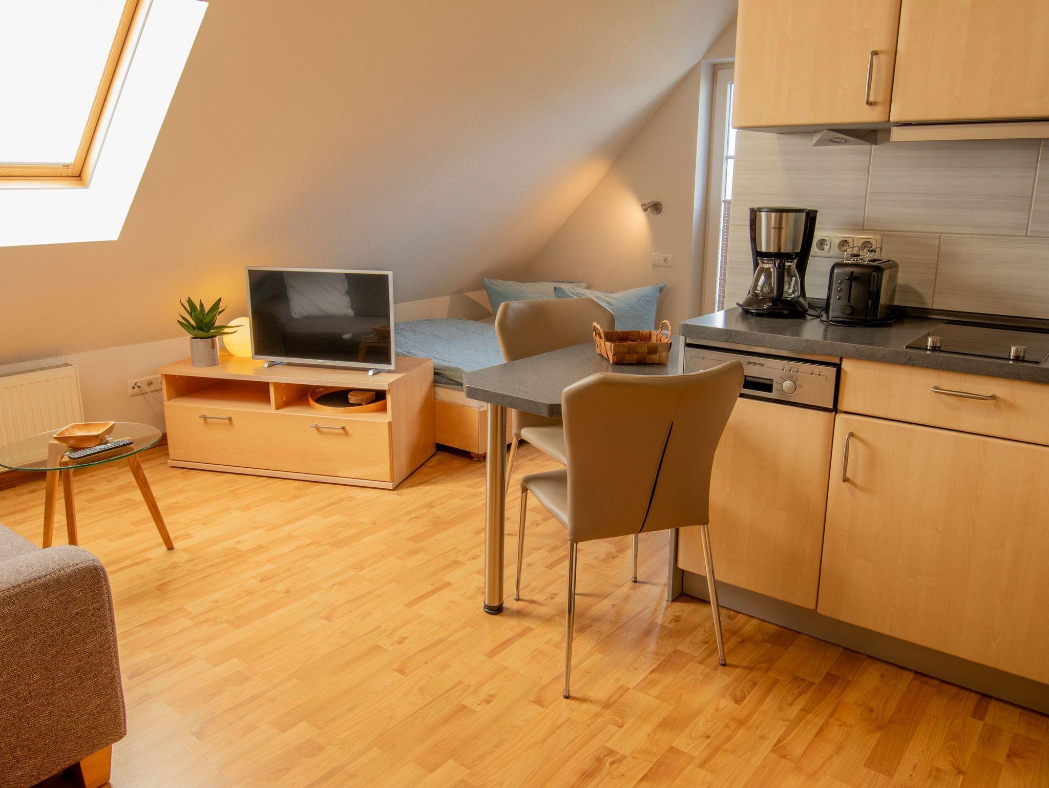 Die Ferienwohnung 3 im Blu Hus in Freest liegt im Dachgeschoss und bietet auf 18 m² einen gemütlichen Rückzugsort für 2 Personen. Sie ist ideal für alle, die es kompakt und praktisch mögen, ohne auf Komfort verzichten zu müssen. Der Wohn- und Schlafbereich ist offen gestaltet und kombiniert ein bequemes Sofa, einen Fernseher sowie ein Doppelbett (140x200). Ein Kleiderschrank bietet ausreichend Stauraum für deine persönlichen Dinge. Die offene Küche ist mit einem Kombiofen, einem 2-Platten-Kochfeld, einem Geschirrspüler, Kochutensilien und allem Nötigen für die Selbstverpflegung ausgestattet. Besonders schön ist der direkte Zugang zum Balkon mit Blick auf das Wasser, bei klarer Sicht kannst du sogar bis nach Rügen und Usedom schauen. Das Badezimmer verfügt über eine Dusche und ein WC. Im Haus stehen dir außerdem eine Waschmaschine und ein Trockner zur Verfügung, die du gegen Gebühr nutzen kannst. Die Nähe zum Hafen, zum Strand und zur Natur macht diese kleine Wohnung zum idealen Ort für eine entspannte Auszeit an der Ostseeküste.