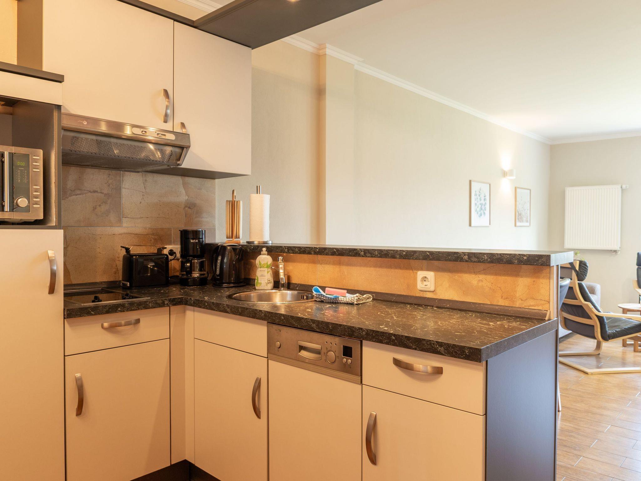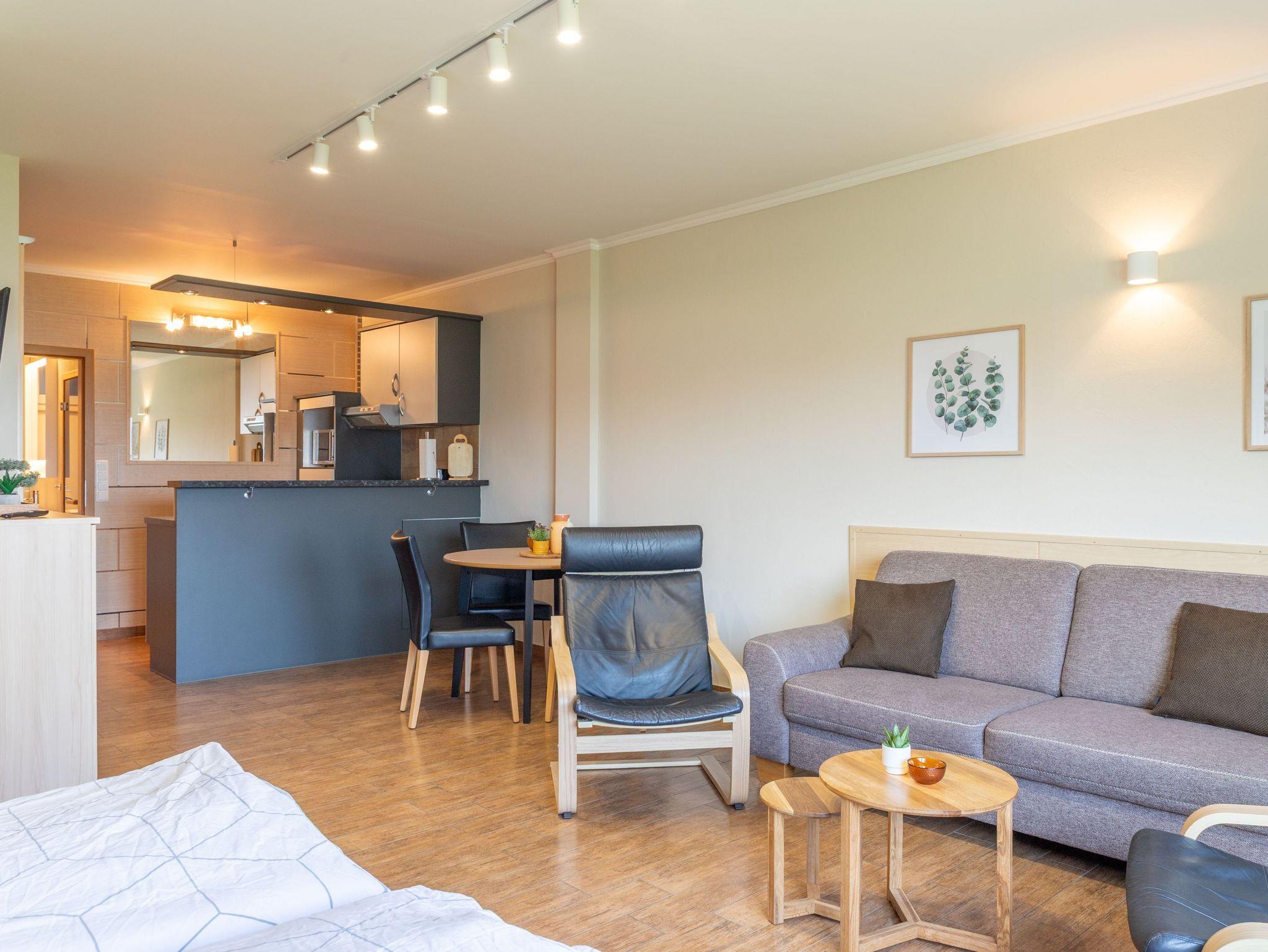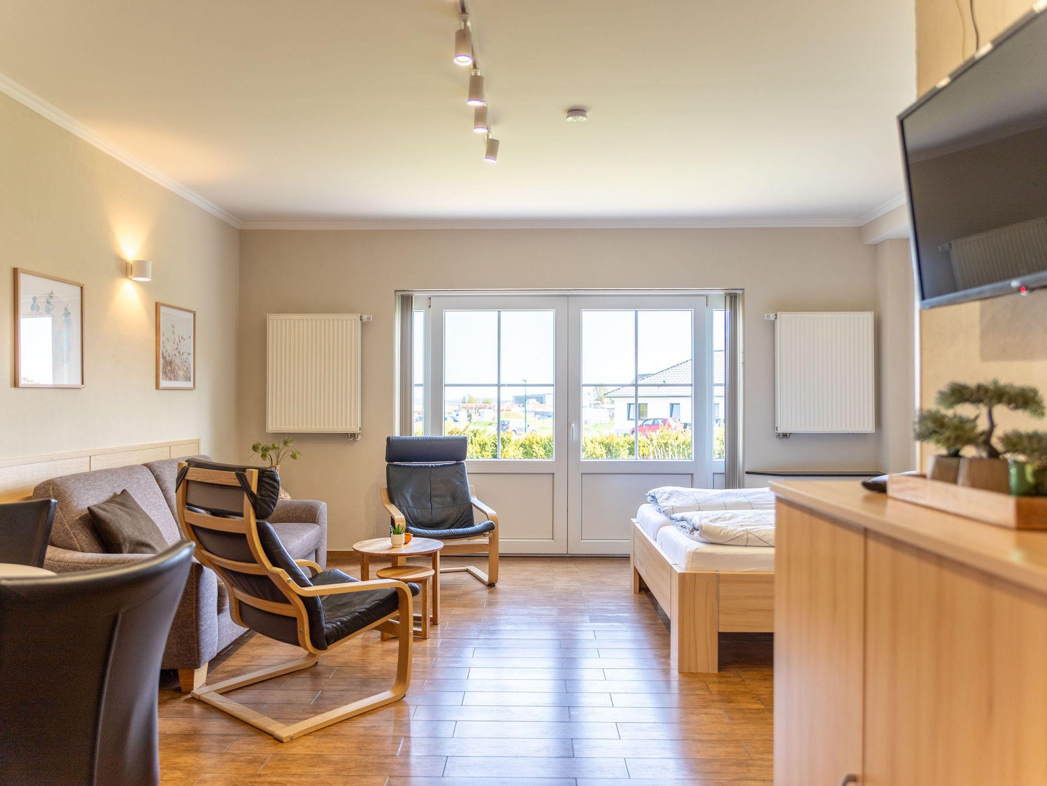 Die Ferienwohnung 4 im Blu Hus in Freest befindet sich im Souterrain und bietet auf 45 m² viel Platz für 2 Personen. Sie ist eine gute Wahl für alle, die eine ruhige Unterkunft mit direktem Zugang ins Grüne suchen. Der kombinierte Wohn- und Schlafbereich ist gemütlich eingerichtet und verfügt über ein bequemes Sofa, einen Fernseher und einen Esstisch. Das Doppelbett (160x200) sorgt für erholsame Nächte. Die offene Küche ist mit Herd, Kühlschrank, Mikrowelle, Geschirrspüler und nützlichen Alltagshelfern ausgestattet, ideal für die Selbstverpflegung im Urlaub. Vom Wohnbereich aus hast du Zugang zu einer kleinen Terrasse mit Sitzgelegenheit und zum Gartenbereich vor dem Haus. Hier kannst du entspannt frühstücken, die frische Luft genießen oder einfach zur Ruhe kommen. Das Badezimmer verfügt über eine ebenerdige Dusche, das WC ist separat zugänglich. Ein besonderes Extra ist die eigene Sauna, die dir gegen Gebühr zur Verfügung steht - perfekt für eine entspannte Auszeit nach einem Tag am Meer oder in der Natur. Im Haus findest du außerdem eine Waschmaschine und einen Trockner, die ebenfalls gegen Gebühr genutzt werden können. Die ruhige Lage und die Nähe zum Hafen machen diese Wohnung zu einem angenehmen Rückzugsort mit allem, was man für einen entspannten Aufenthalt an der Ostseeküste braucht.