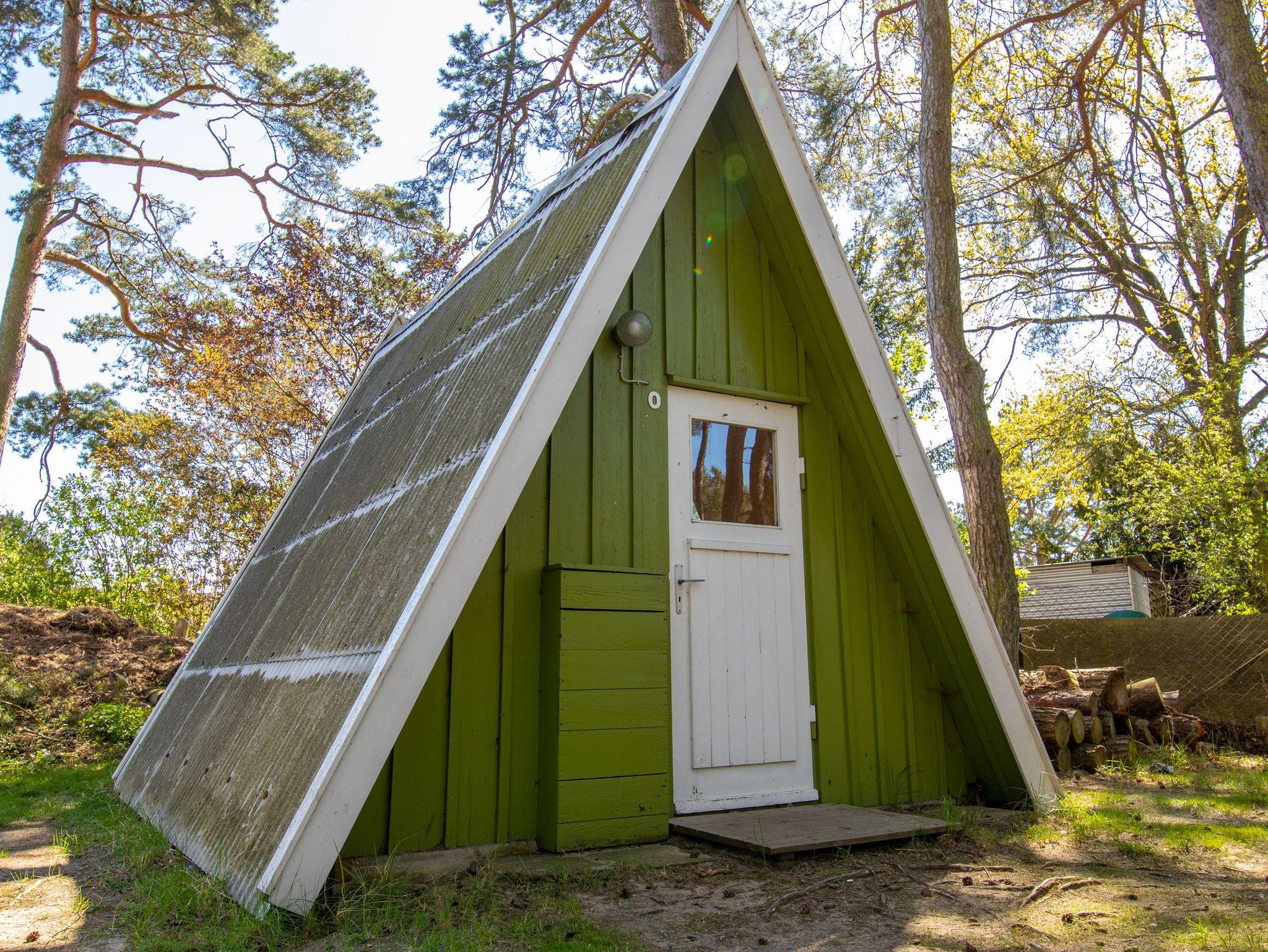 Gemütliche Finnhütte am Ostseecamping Peenemündung im Fischerdorf Freest, ideal für naturnahes Camping mit Gemeinschaftsküche und Grillmöglichkeit.