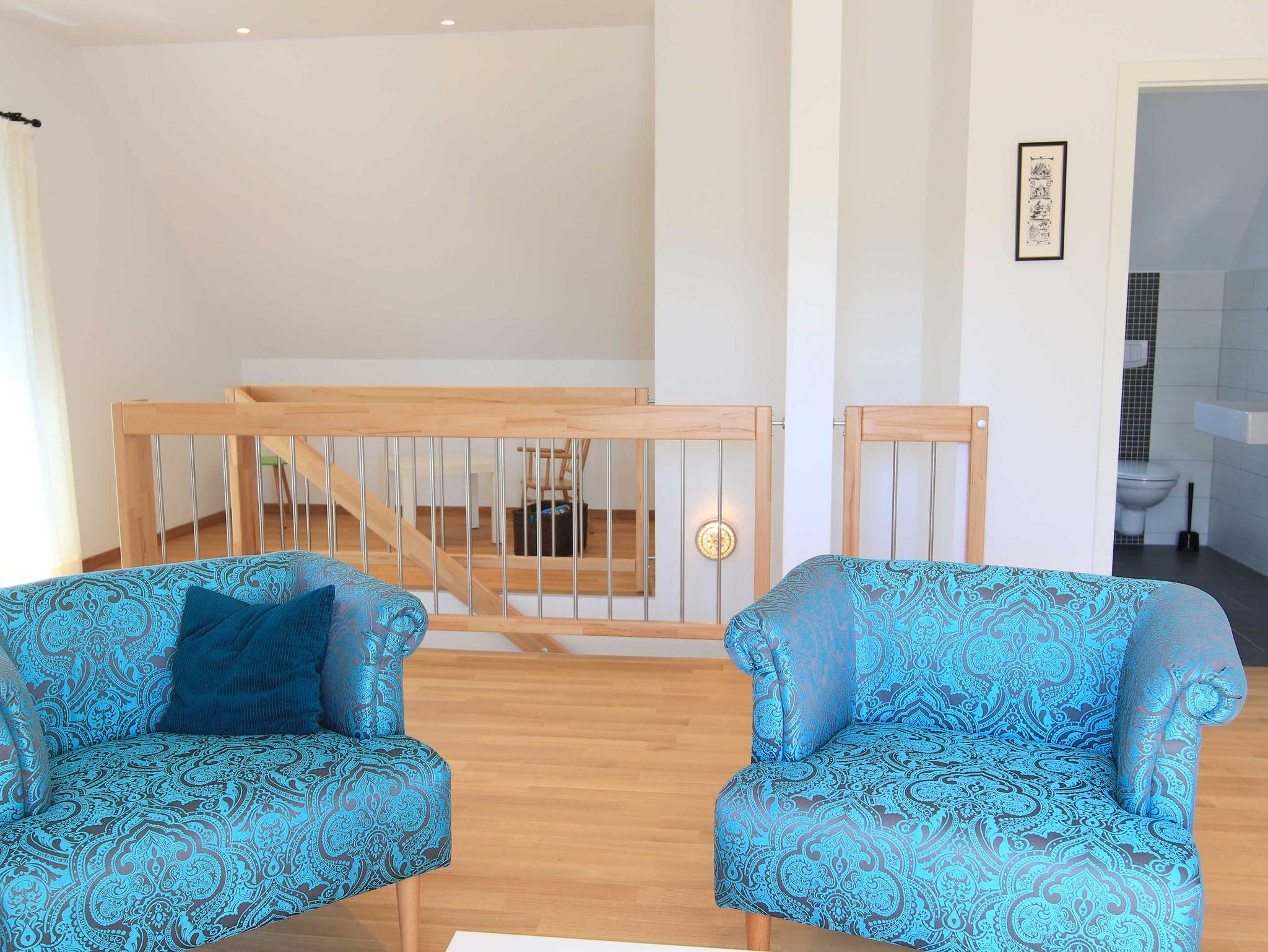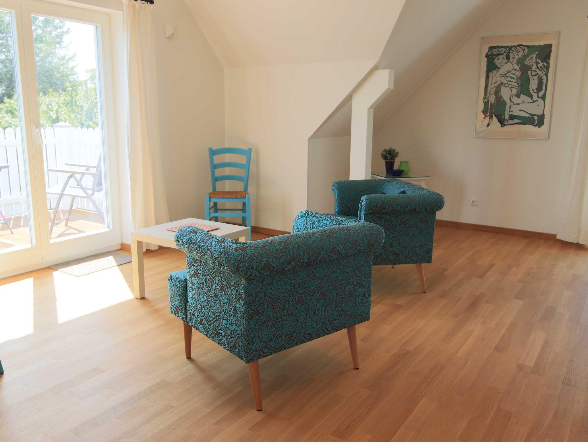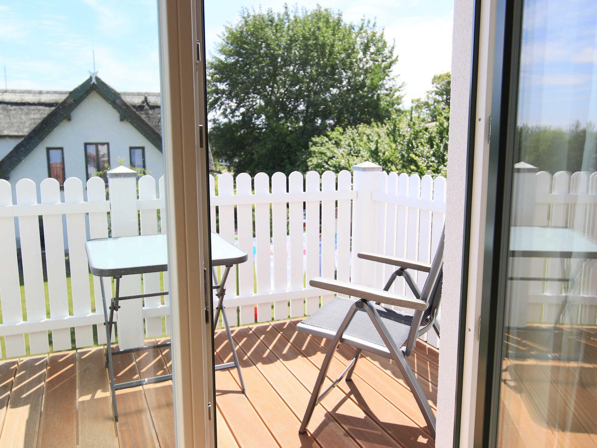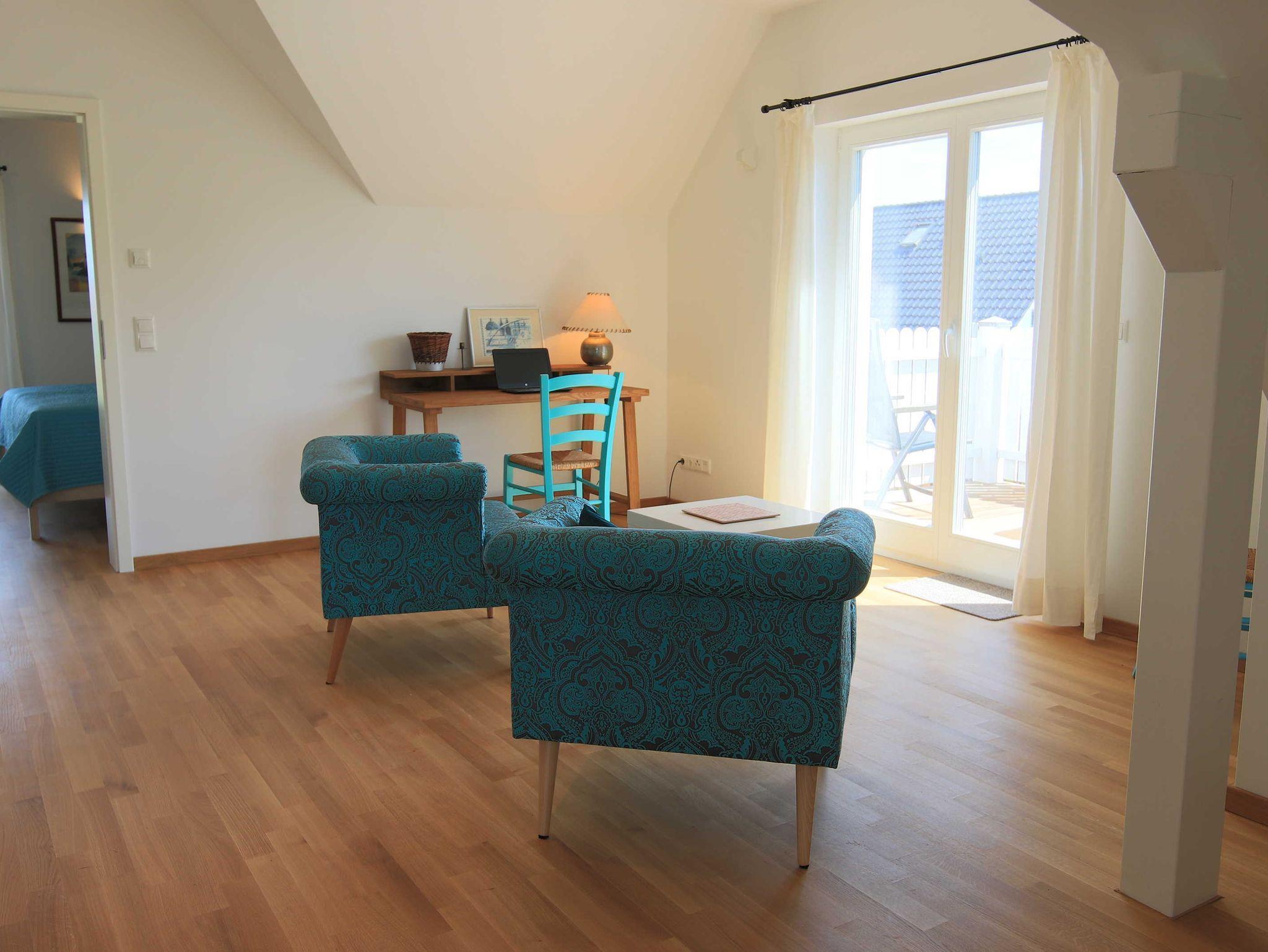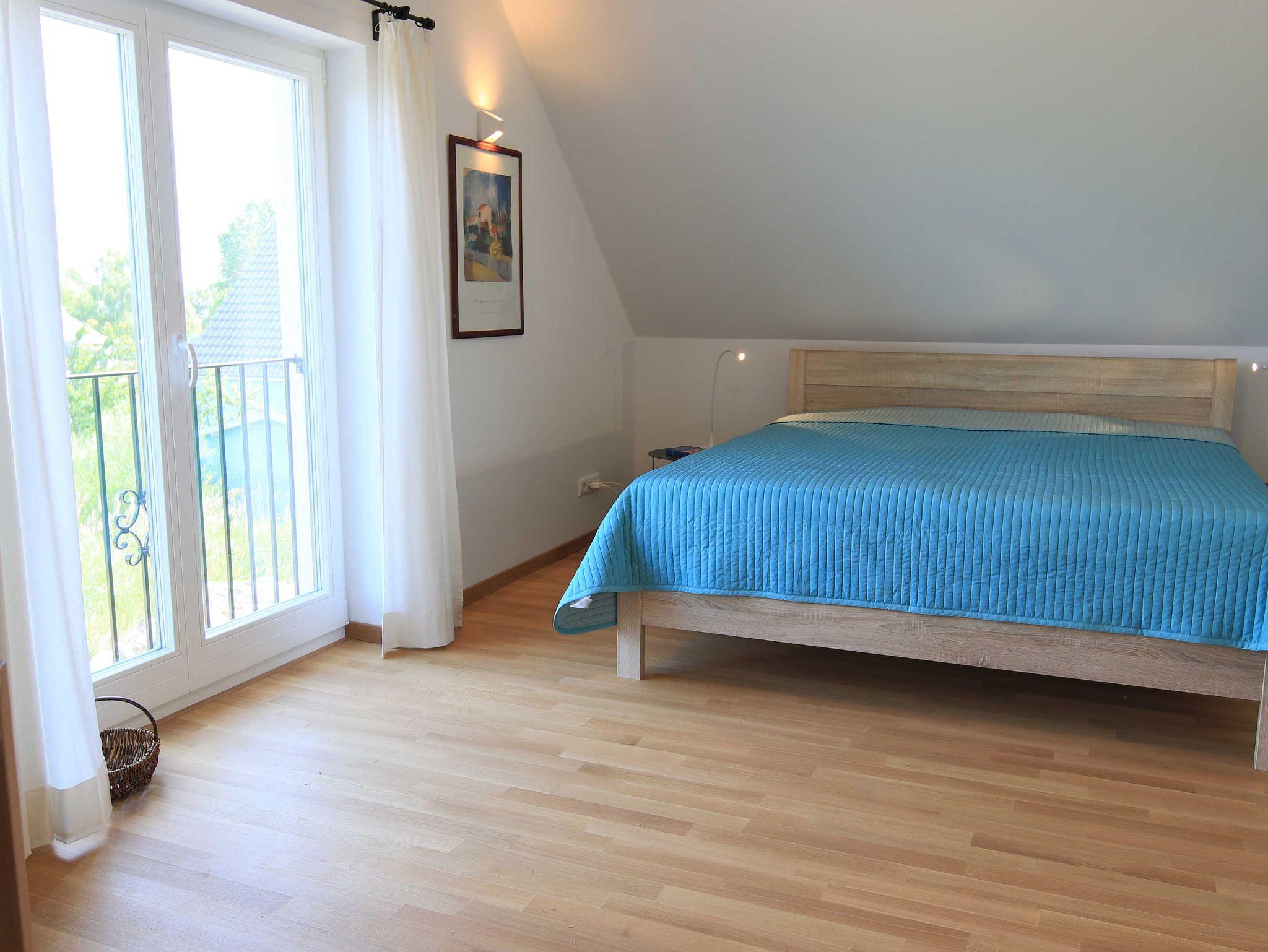 Im Obergeschoss gibt es einen großen, hellen Freizeitraum mit gemütlichem Sitzbereich, Schreibtisch und Kinder-Spielecke. Hier gibt es auch ein zweites, großes Schlafzimmer mit Doppelbett und ein weiteres Bad mit Dusche und WC. Das Haus verfügt sowohl über eine Terrrasse als auch einen Balkon mit Blick auf den Freester Hafen, Usedom, dem Greifswalder Bodden und der Insel Ruden.