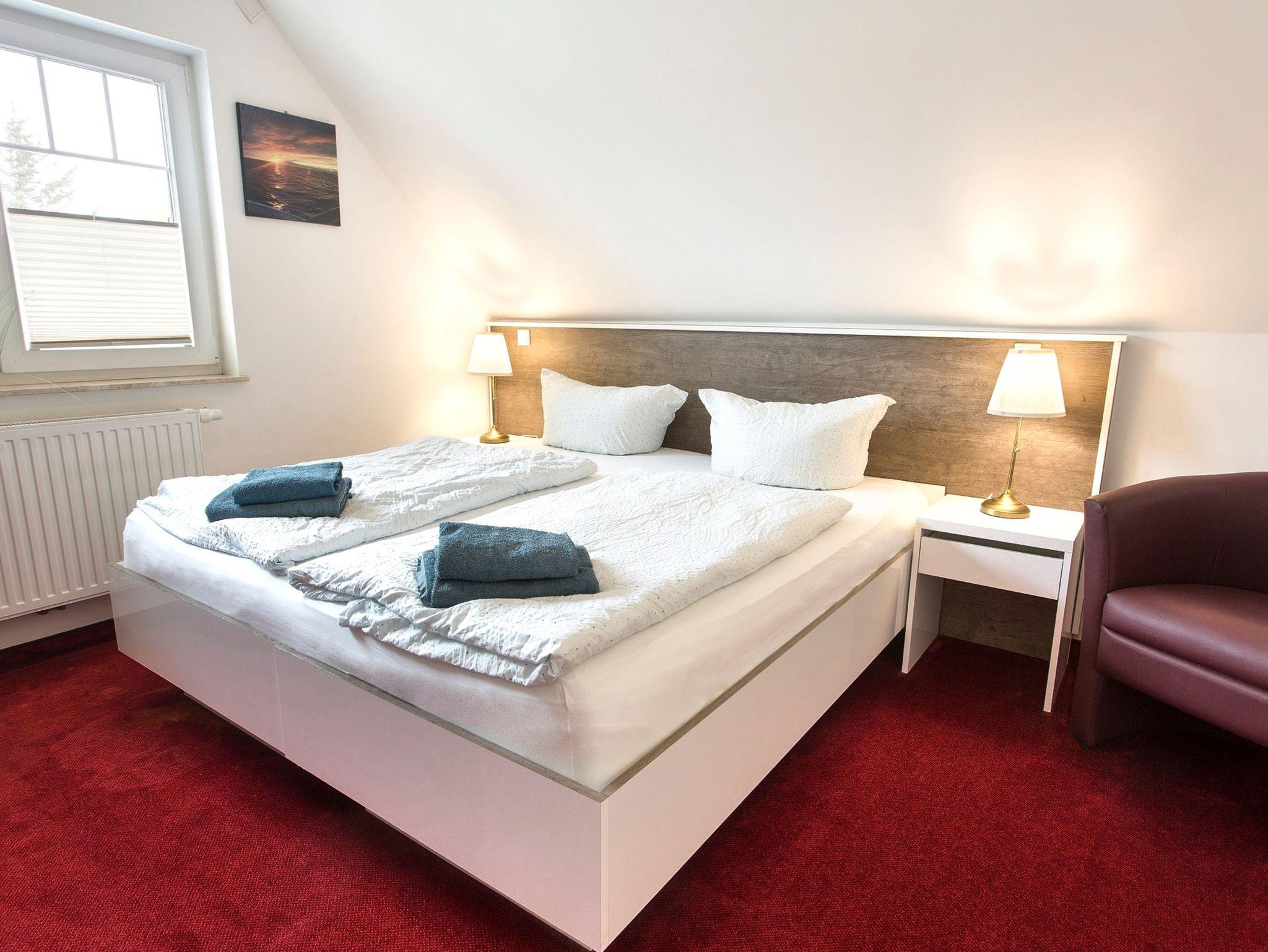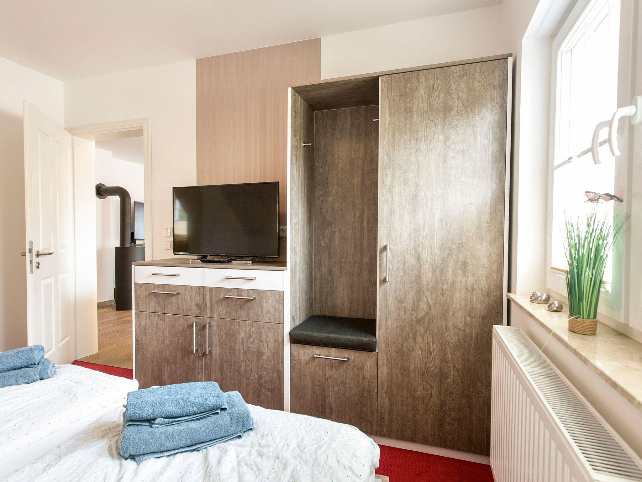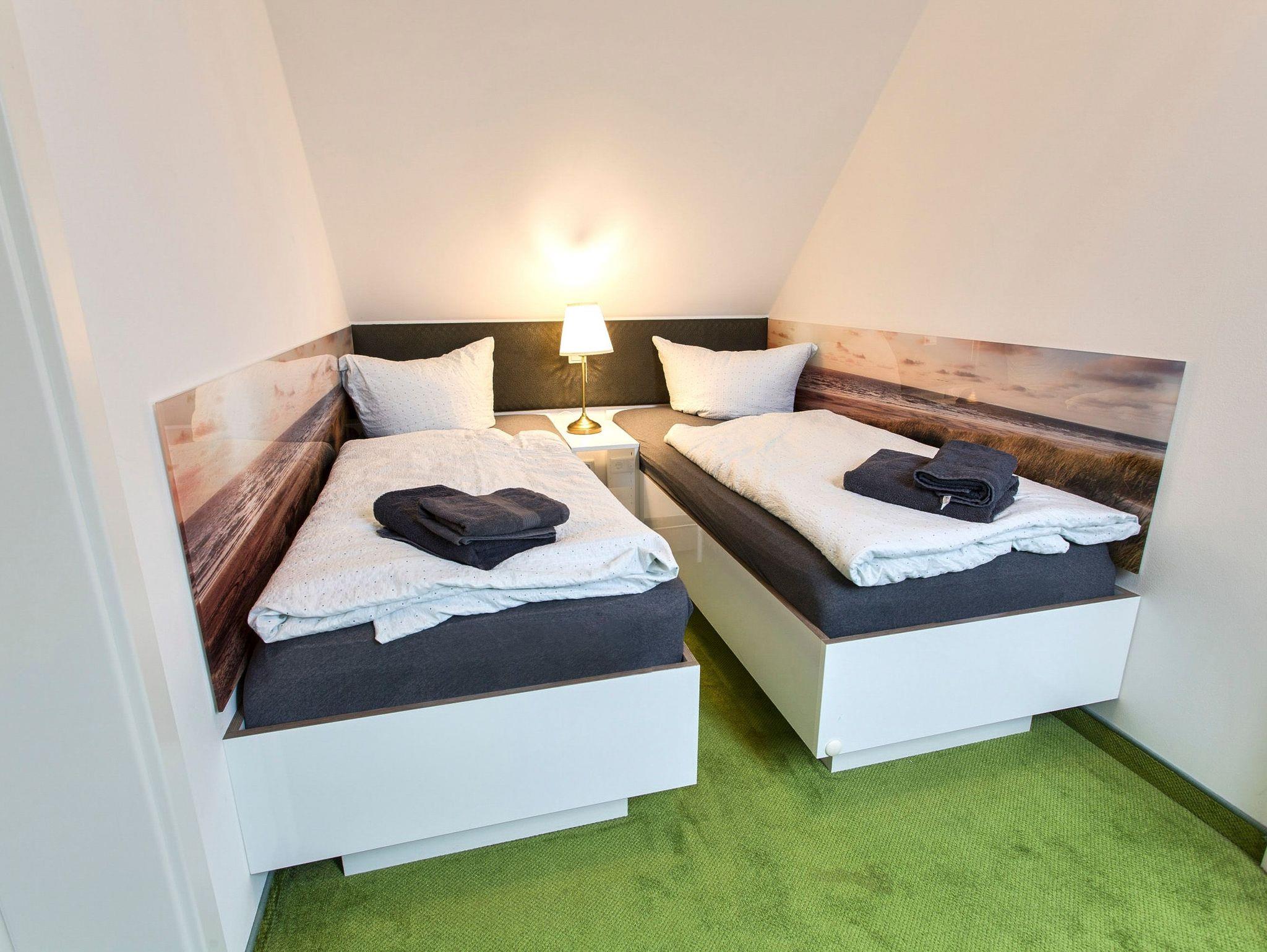 In der Ferienwohnung befinden sich 4 separate Schlafzimmer, jeweils 2 Schlafzimmer auf jeder Etage. 3 Schlafzimmer sind mit Doppelbett (180x200; getrennte Matratzen, einzeln stellbar), Smart-TV, Kleiderschrank und Sessel ausgestattet. Das Doppelbettschlafzimmer im Dachgeschoss hat einen eigenen Balkon. Das 4. Schlafzimmer ist mit 2 getrennt stehenden Betten, Smart-TV, Kommode und Sessel ausgestattet. Die Fenster sind mit elektrischen Außenjalousien verdunkelbar und mit Insektenschutz versehen.