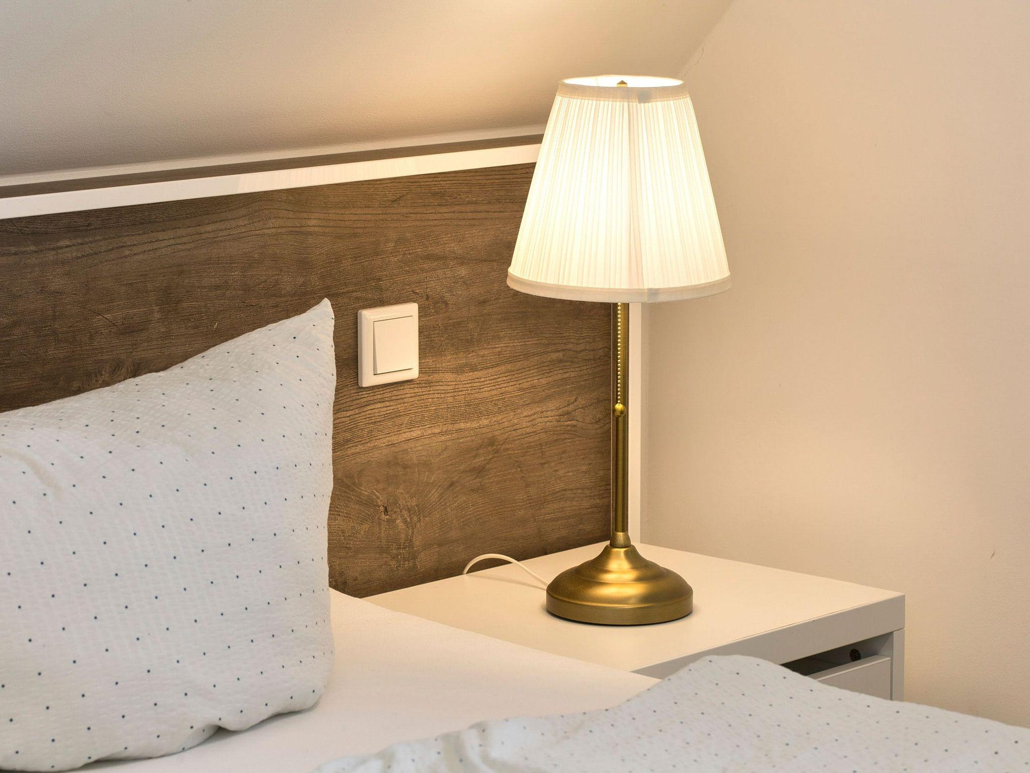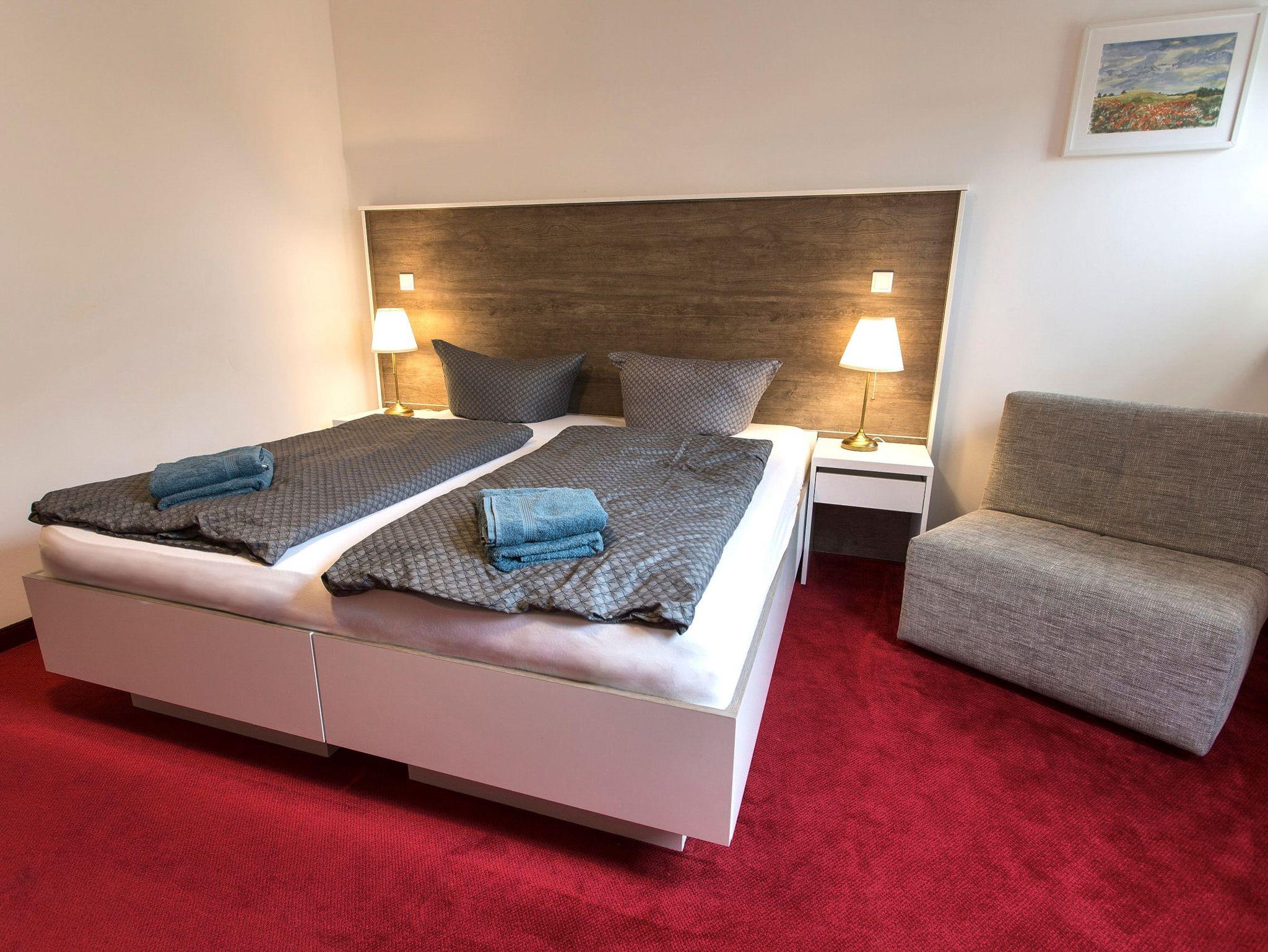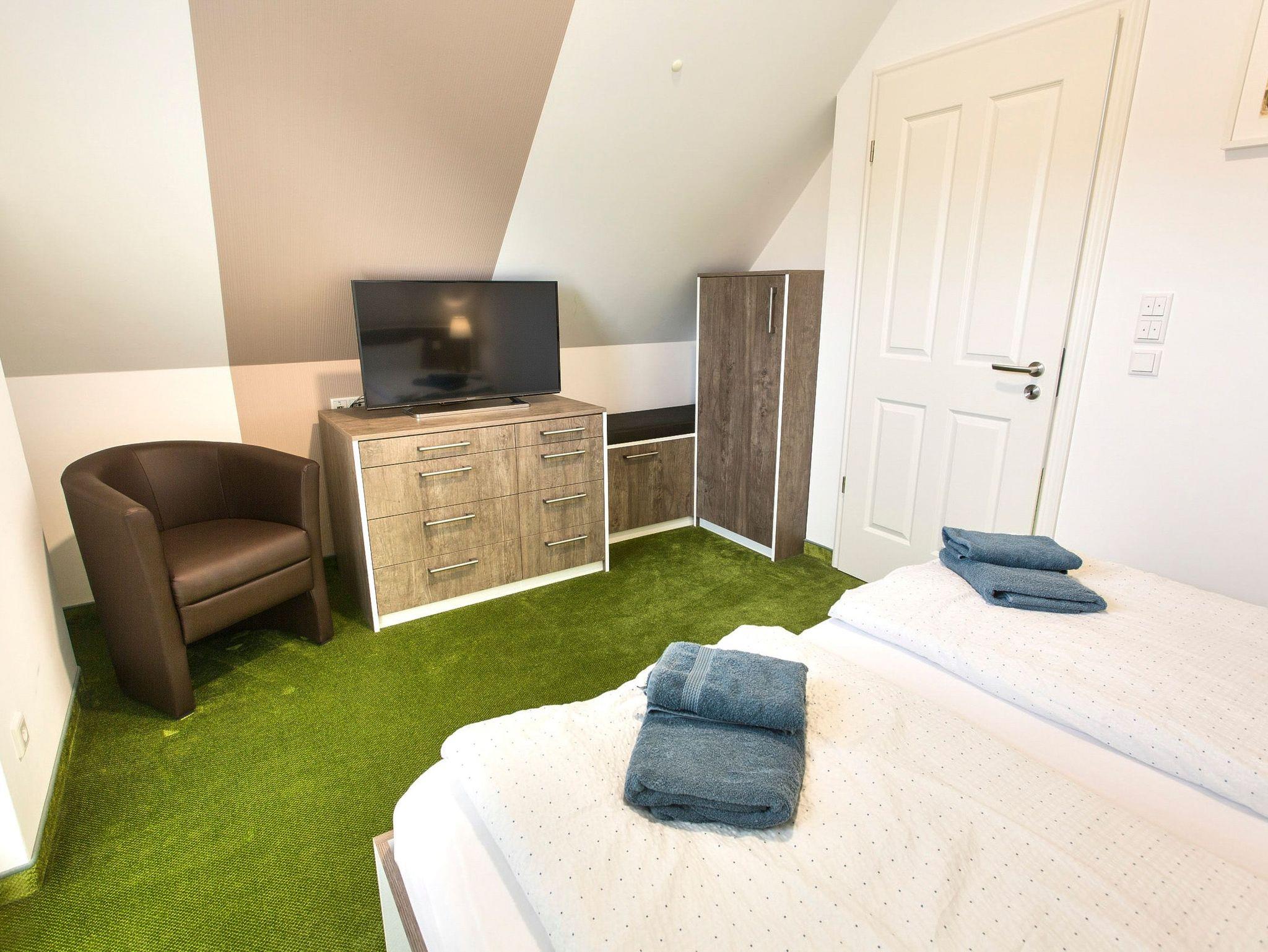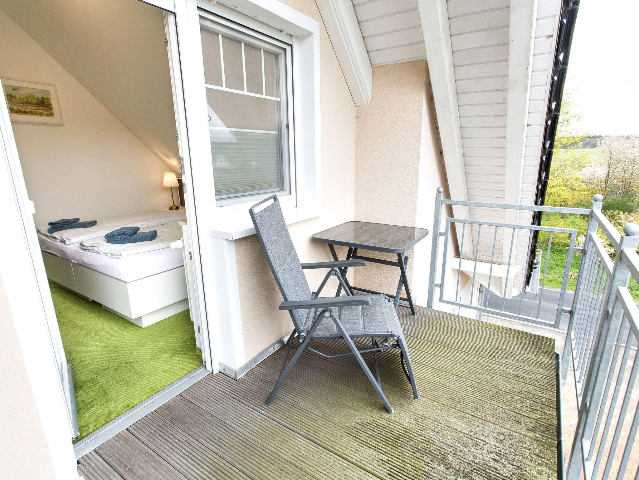 In der Ferienwohnung befinden sich 4 separate Schlafzimmer, jeweils 2 Schlafzimmer auf jeder Etage. 3 Schlafzimmer sind mit Doppelbett (180x200; getrennte Matratzen, einzeln stellbar), Smart-TV, Kleiderschrank und Sessel ausgestattet. Das Doppelbettschlafzimmer im Dachgeschoss hat einen eigenen Balkon. Das 4. Schlafzimmer ist mit 2 getrennt stehenden Betten, Smart-TV, Kommode und Sessel ausgestattet. Die Fenster sind mit elektrischen Außenjalousien verdunkelbar und mit Insektenschutz versehen.