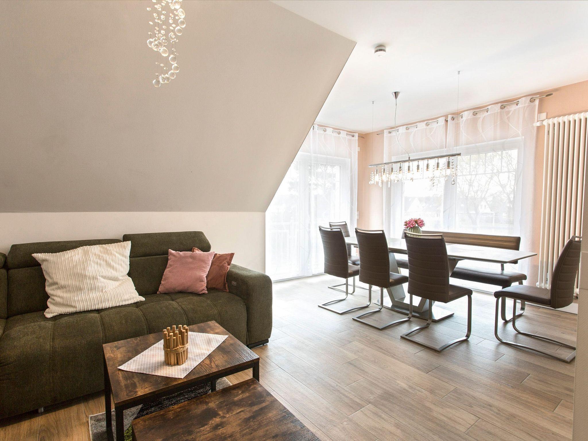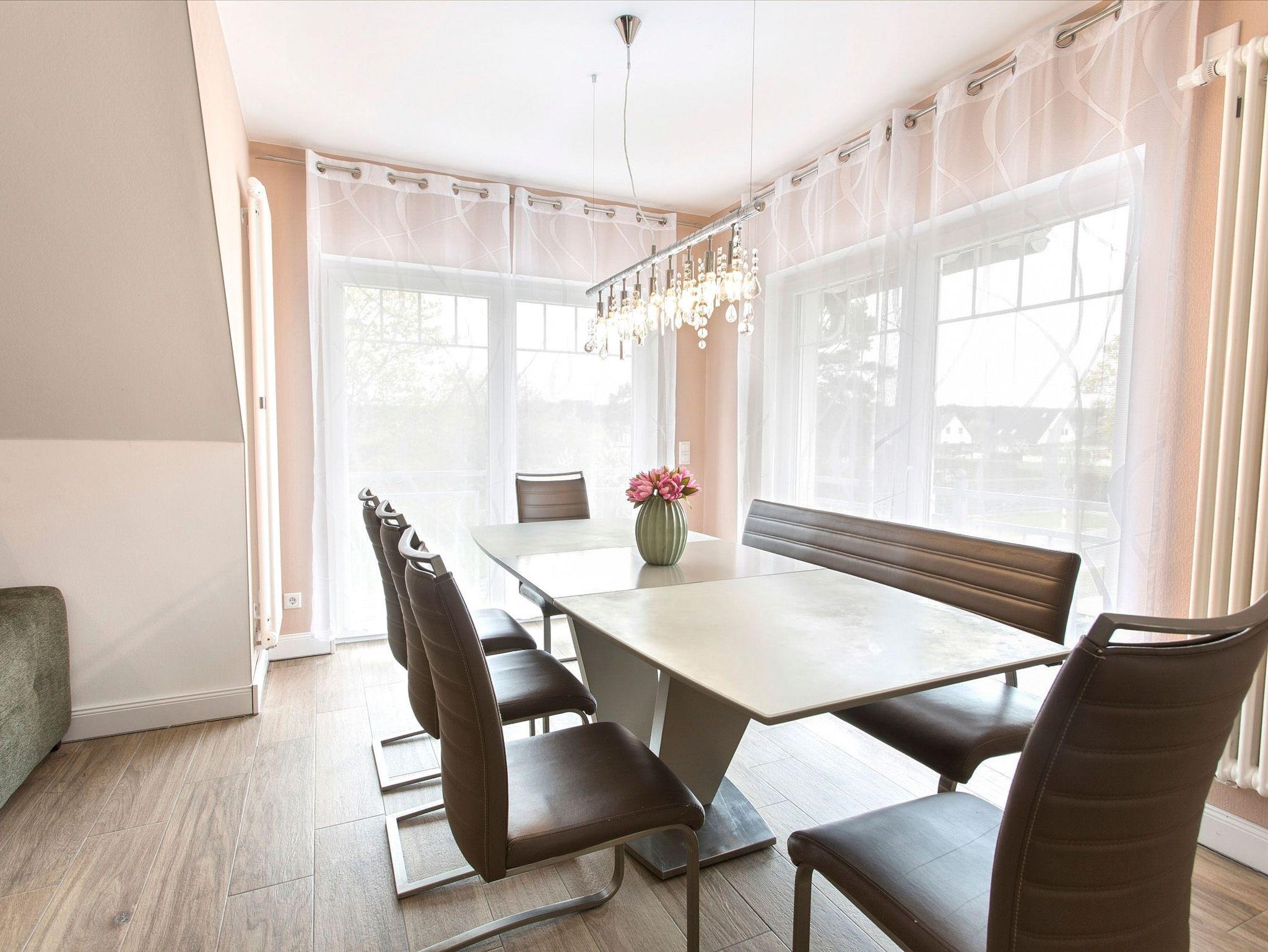 Die 130m² große Ferienwohnung Rügen erstreckt sich über 2 Etagen im Obergeschoss/Dachgeschoss der Villa Vier Inselblick. Sie verfügt über eine große Wohnküche, 4 Schlafzimmer, 3 Bäder, Kamin und 2 Balkone.